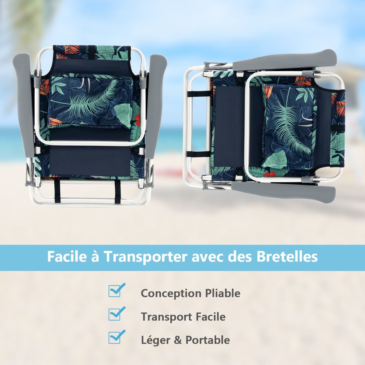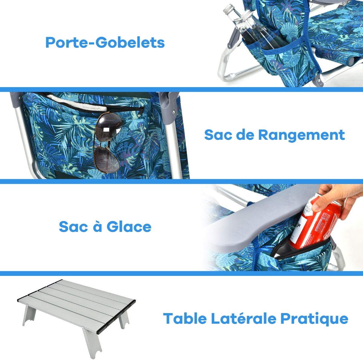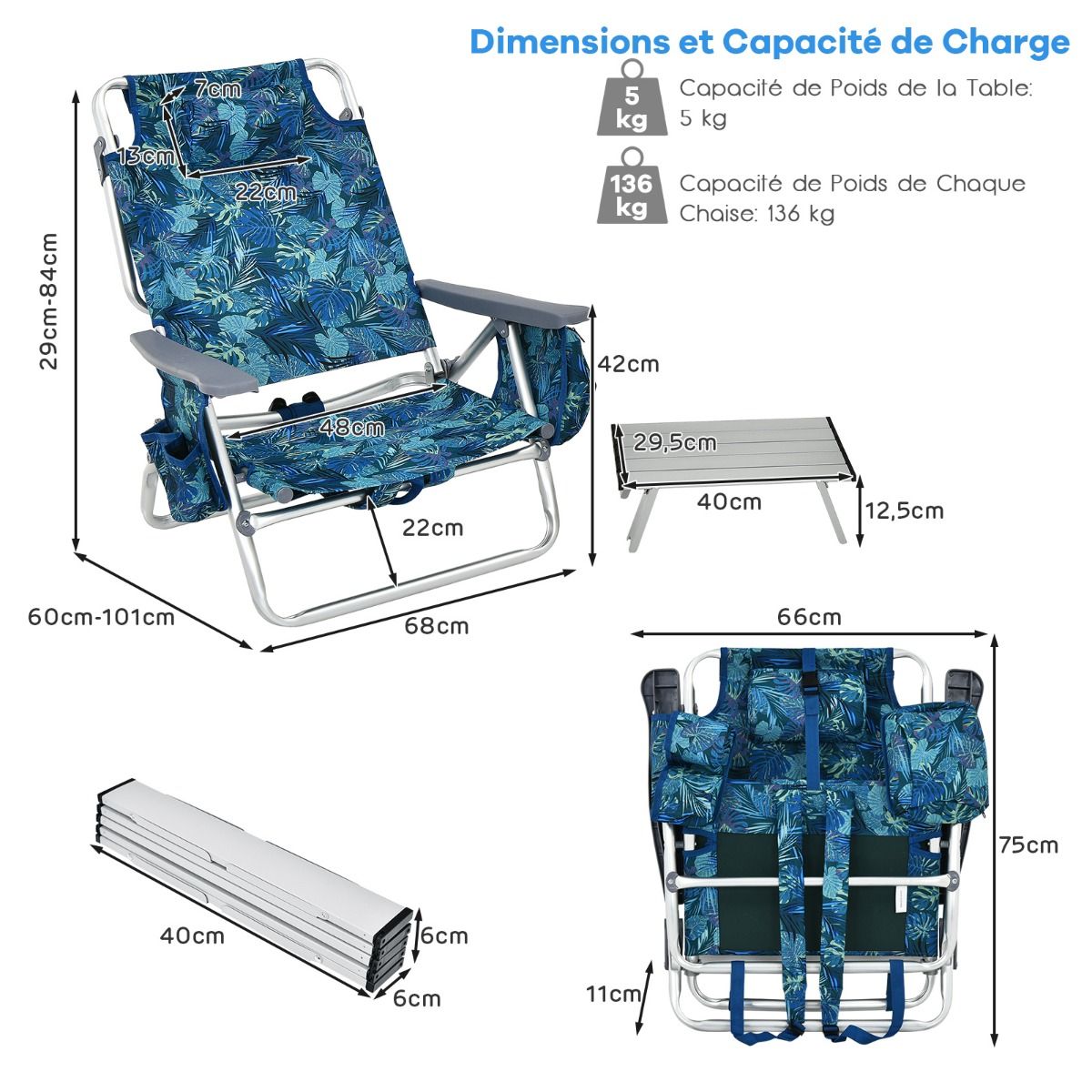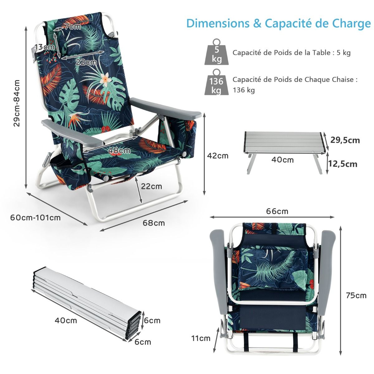 This three-piece beach furniture set includes two chairs and a table, ideal for outdoor relaxation. You can comfortably enjoy a drink at the side table. The chairs fold down and are stored in the included carrying case. The set also includes a cup holder and PEVA ice pack for convenient storage of various items. The chair backs have five adjustable positions. Made of waterproof PVC and rust-resistant aluminum, it is suitable for use on the beach, by the pool, and other outdoor locations. Product Features: Three-Piece Beach Furniture SetThis three-piece set includes two high-quality beach chairs and a convenient camping table, providing a comfortable place to relax and enjoy the sea view. Portable Camping TableThis lightweight beach table makes it easy to place drinks, snacks, sunglasses, and other items within easy reach. It can also be folded down and stored in the included carrying case for convenient storage. Adjustable Beach ChairThis beach chair features a 5-position adjustable backrest design, equipped with a comfortable headrest and soft foam cushion, allowing you to sit and read or chat, or recline to enjoy sunbathing or take a nap. Selected MaterialsThe chairs are made of durable PVC material, which is waterproof, breathable, and space-saving. This foldable table, made of rust-resistant aluminum, makes this set ideal for outdoor use. Multi-functional DesignThe table and chairs feature a folding design, making this lightweight three-piece outdoor gear set easy to carry and suitable for various occasions. Storage bags, cup holders, and PEVA ice packs on the beach chairs add convenience. Product Features: Beach table and two chairs set. Aluminum tabletop for convenient placement of drinks, snacks, and sunglasses. Rust-resistant aluminum surface for easy cleaning and maintenance. The camping table folds into the included storage bag for easy carrying. 5-position adjustable backrest to meet various needs. Waterproof and breathable PVC material suitable for outdoor use. Comfortable headrest with soft sponge filling for ultimate comfort. Equipped with storage bags, cup holders, and PEVA ice packs for added convenience and practicality. Includes a shoulder strap for easy carrying. Foldable design for easy storage. Suitable for beaches, poolside, camping, and fishing. No assembly required, saving time. Specifications: Color: As shown in the picture. Material: PVC, aluminum, sponge. Unfolded dimensions: 40 x 29.5 x 12.5 cm (Length x Width x Height). Folded dimensions: 40 x 6 x 6 cm (Length x Width x Height). H) Unfolded dimensions of each chair: 60/101 x 68 x 29/84 cm (Length x Width x Height). Folded dimensions of each chair: 66 x 11 x 75 cm (Length x Width x Height). Headrest dimensions: 22 x 13 x 7 cm (Length x Width x Thickness). Table net weight: 0.3 kg. Chair net weight: 4 kg. Table load capacity: 5 kg. Chair load capacity: 136 kg. Package includes: 1 table, 2 chairs, 1 instruction manual.