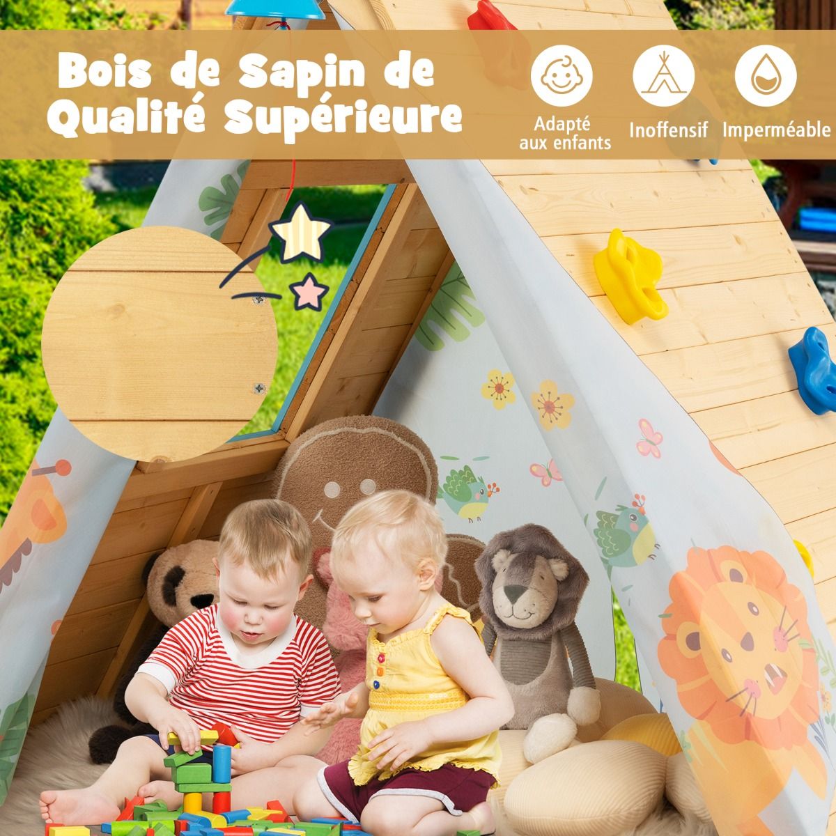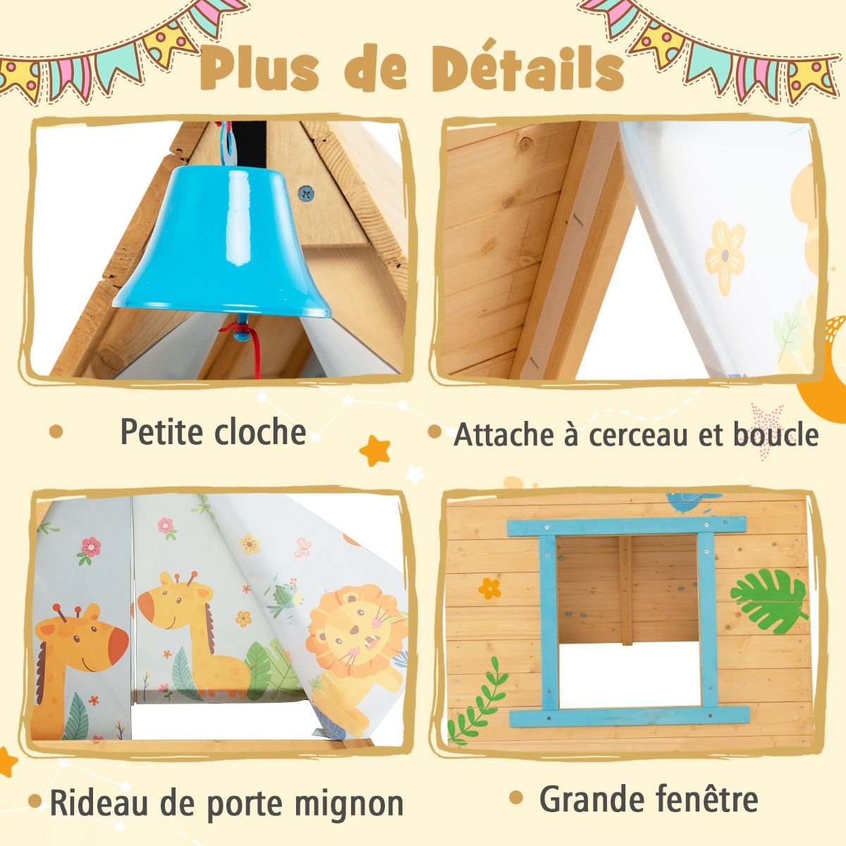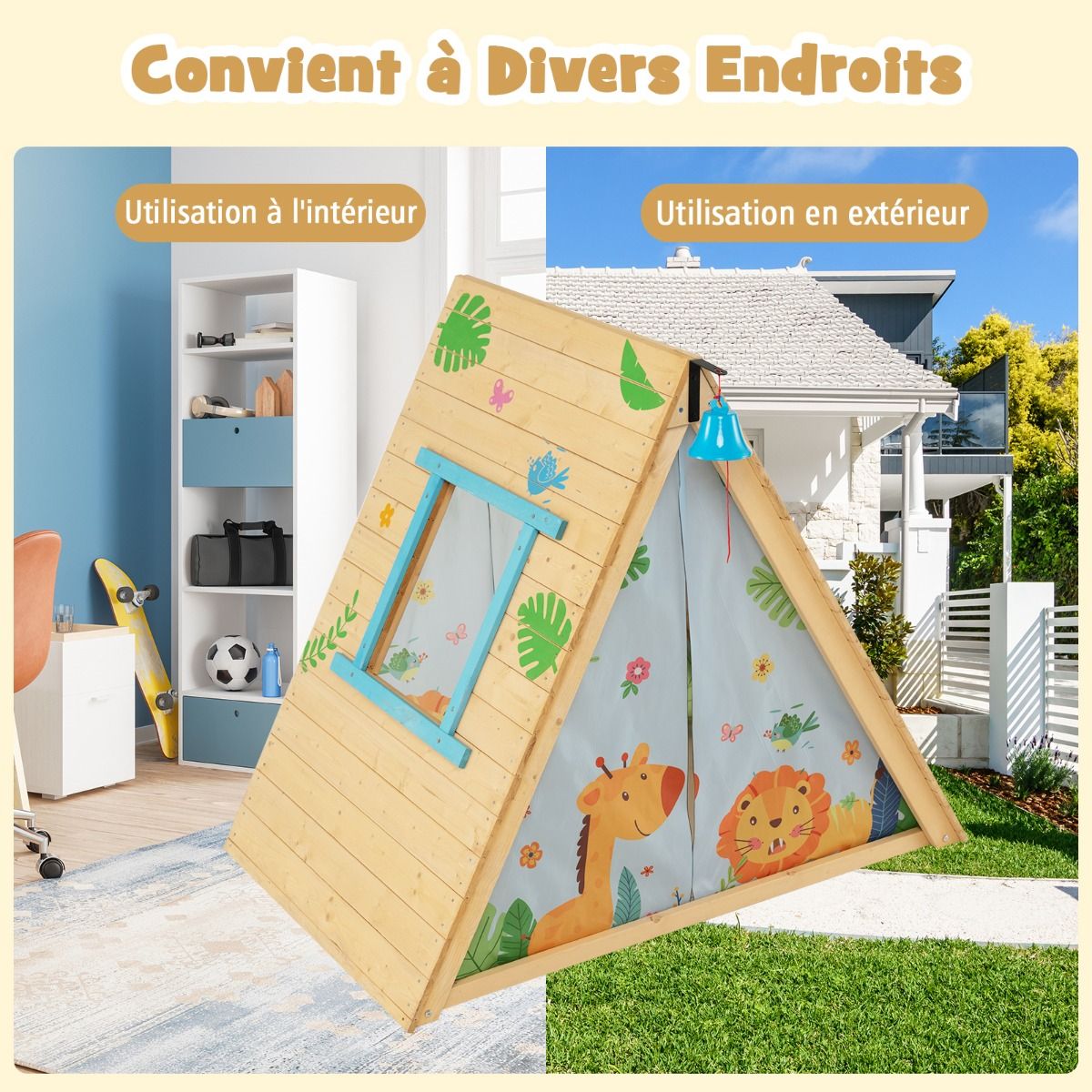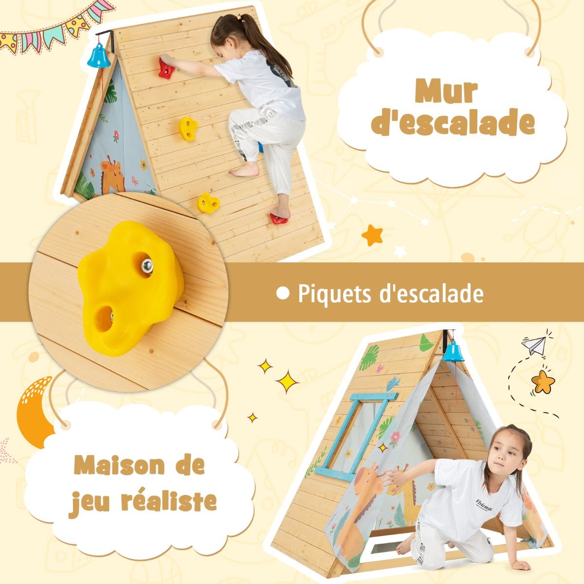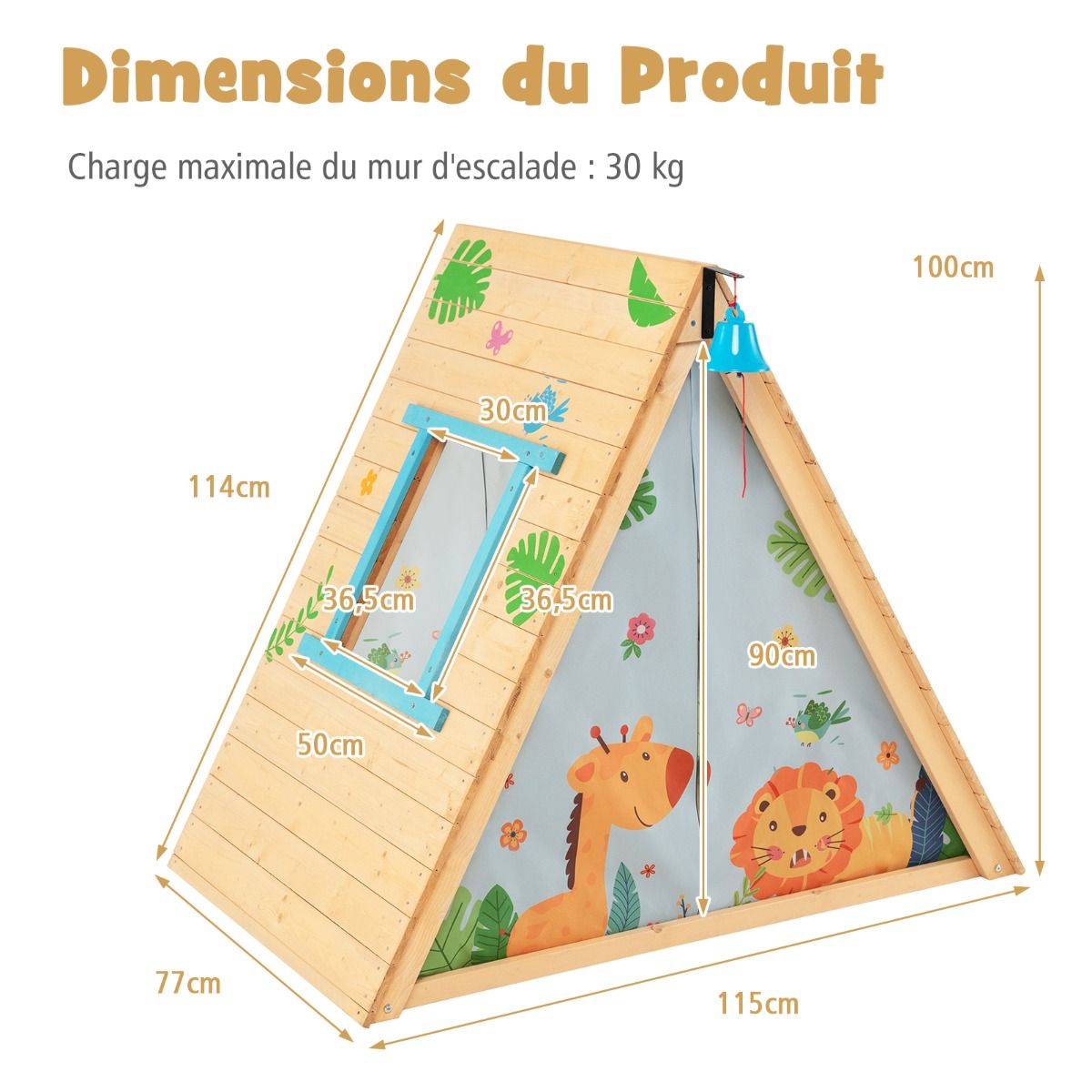 Looking for a toy to keep your kids entertained? Our 2-in-1 Playhouse is the perfect choice. It includes a play tent where children can hide or rest, and a climbing wall for them to play on. A cute curtain provides privacy. Blue bells and large windows add to the fun. This spacious playhouse can comfortably accommodate two children aged 3 to 8, allowing them to play with friends. Furthermore, the BPA-free cedar wood ensures durability and safety. The climbing wall has a 30kg load-bearing capacity and a triangular structure that makes it stable and wobbly. Our curtain features Velcro for easy installation and removal. This functional and cleverly designed 2-in-1 playhouse combines a climbing wall with a realistic play area. It also features small bells, large side windows, and cute cartoon designs for added fun. This play set helps children develop social skills, motor skills, and hand-eye coordination. Spacious Play and Rest Area: Measuring 115 cm (L) x 77 cm (W) x 100 cm (H), this play tent provides ample play space for two children aged 3 to 8, allowing them to hide, climb, or play. Additionally, the tent comes with a beautiful curtain, providing a private corner for children to read or nap. Natural Cedar Wood Material: Our play tent is made of high-quality cedar wood, which is child-friendly, odorless, safe, and BPA-free, ensuring the safety of toddlers. Furthermore, cedar wood has good water resistance and abrasion resistance, making it suitable for both indoor and outdoor use. Sturdy Triangular Structure: This children's playhouse features a sturdy triangular structure, ensuring stability and preventing wobbling or collapse after installation. The climbing wall can support up to 30 kg. Furthermore, screw fixings and sturdy crossbars enhance overall durability and stability. Easy Assembly and Maintenance: Our wooden playhouse comes with easy-to-understand installation instructions and all necessary accessories, allowing for quick and easy assembly. Velcro fasteners make it easy to install the curtain. In addition, the waterproof coating makes it easy to clean. Product Features: This 2-in-1 design (playhouse and climbing wall) brings endless fun. Enough for two children aged 3-8 to hide, climb, rest, or play. Helps develop children's social skills, motor skills, and hand-eye coordination. Made of select cedar wood, it is durable and safe. Suitable for both indoor and outdoor use. The sturdy triangular frame makes it stable. Additional screws and strong crossbars enhance overall stability. Velcro fasteners secure the curtain. Includes illustrated instructions and all necessary accessories for easy and quick assembly. The waterproof coating and curtain make cleaning easy. Product Specifications: Color: Natural wood; Material: Cedar wood; Overall dimensions: 115 x 77 x 100 cm (L x W x H); Climbing wall load capacity: 30 kg; Suitable age: 3-8 years; Net weight: 14 kg. Package Contents: 1 x Children's Playhouse; 1 x Assembly Instructions