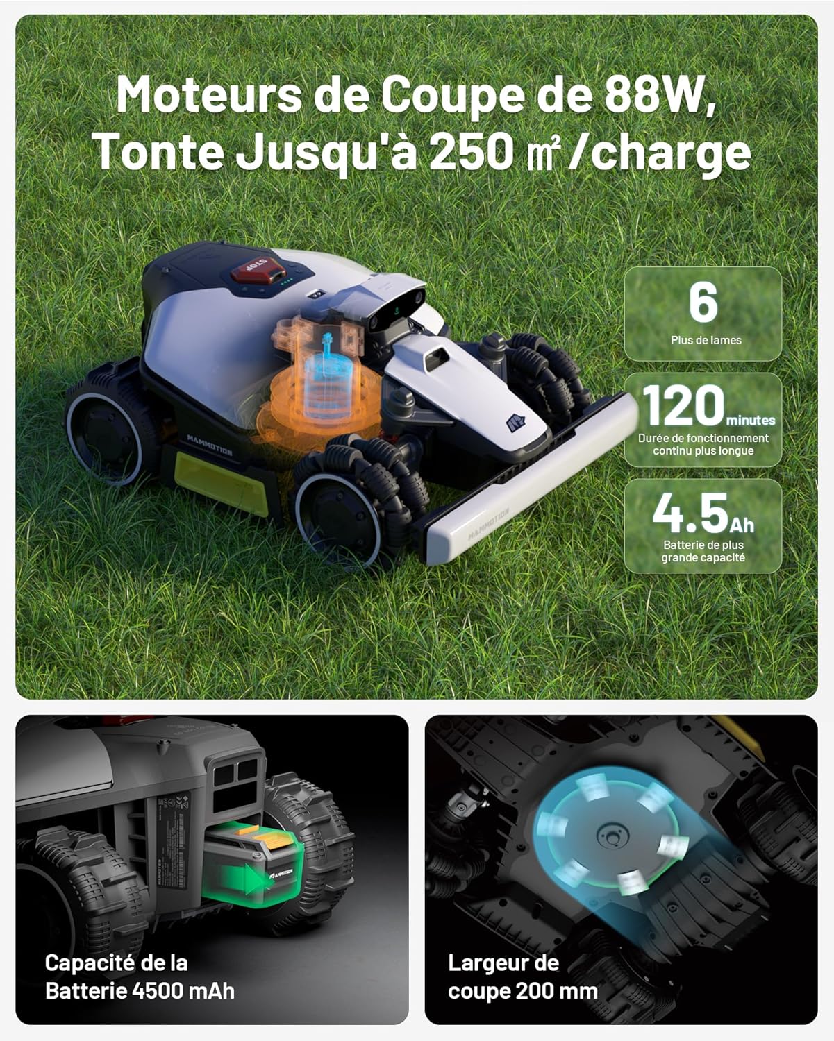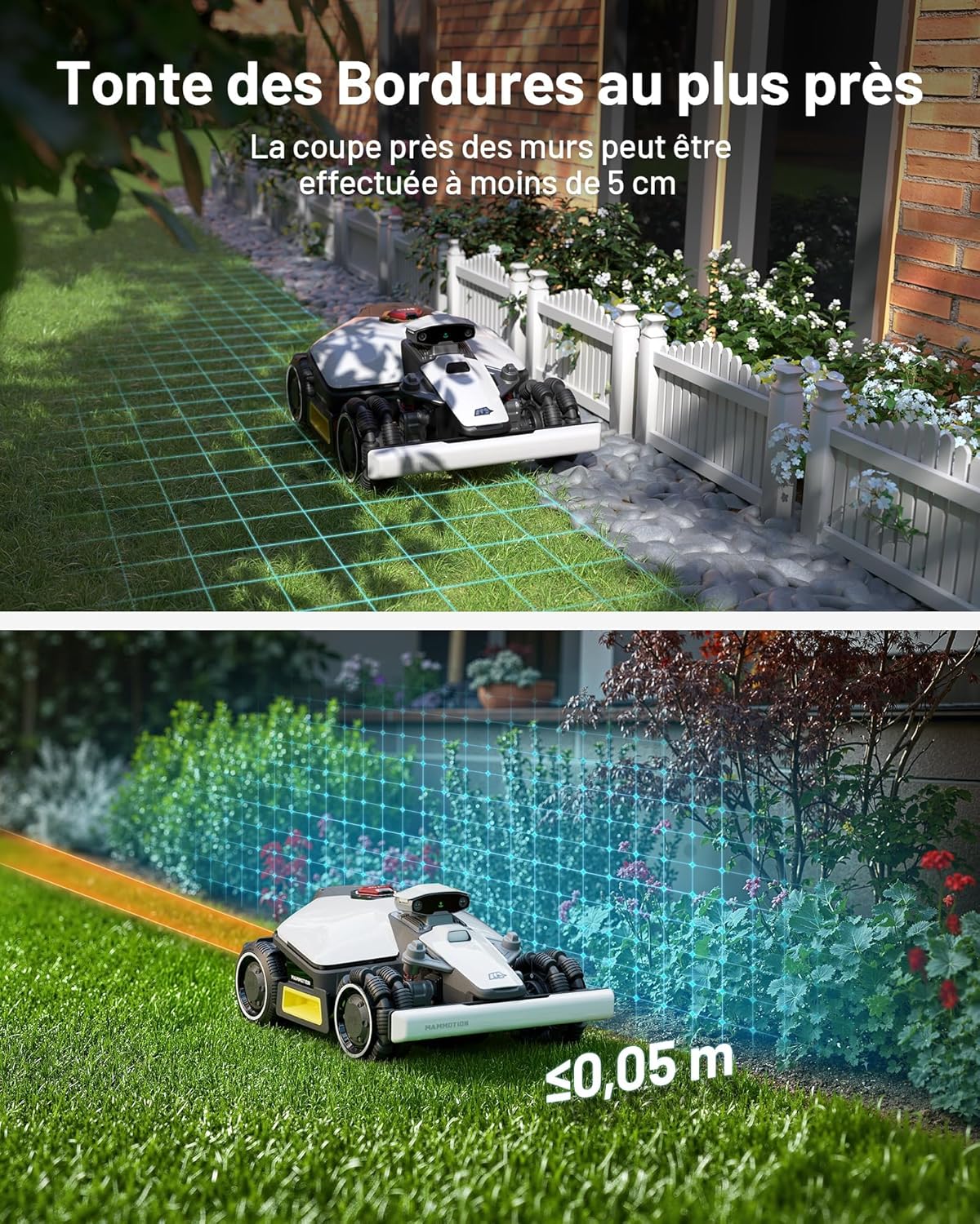 Effortless lawn mowing without an antenna: Say goodbye to tedious setup! The LUBA mini AWD features a built-in 4G module and NetRTK technology, allowing you to start mowing immediately without an RTK antenna. With centimeter-level satellite positioning accuracy, your lawn receives professional-grade maintenance every time. Plus, you can try 4G and NetRTK features free until the end of 2025. Superior all-terrain performance for lawns up to 800 square meters: The LUBA mini AWD boasts powerful traction and an adaptive suspension system, easily navigating obstacles or potholes up to 80 millimeters high. Whether the terrain is rugged or the grass is tall and dense, it forges ahead without getting stuck. Equipped with an 88W cutting motor and zero-turn radius omnidirectional wheels, it optimizes mowing even in wet conditions. Automatic mapping and intelligent visual barriers: The LUBA mini robotic lawnmower automatically detects garden boundaries and creates virtual maps up to 800 square meters. Thanks to advanced image processing technology, the LUBA mini AWD can identify transition zones between lawn and non-lawn areas, preventing the lawnmower from accidentally entering sidewalks, flower beds, or other restricted areas. No need to worry about signal loss or edge trimming: the UltraSense AI vision system ensures mowing operations up to 300 meters long, even in areas without satellite signal, such as under trees or along narrow paths. The vision system's AI algorithm can identify obstacles to avoid, such as children or animals. The LUBA mini AWD can automatically trim edges with an accuracy of within 5 centimeters, even near walls. Multi-zone management and intelligent route planning allow you to easily manage 15 mowing zones in your front and back gardens, including roadsides and restricted areas such as pools and flower beds. With patented algorithms, the LUBA mini AWD automatically optimizes routes between different mowing zones, ensuring efficient trimming and leaving beautiful lawn strips. Experience the uninterrupted mowing pleasure of the LUBA mini AWD. Mow your lawn as you like: Through the Mammotion app, you can adjust the cutting height, select trimming modes, set trimming plans, and directly view the lawnmower's status. The cutting height is adjustable between 20 and 65 mm. You can also select different trimming modes via the app.