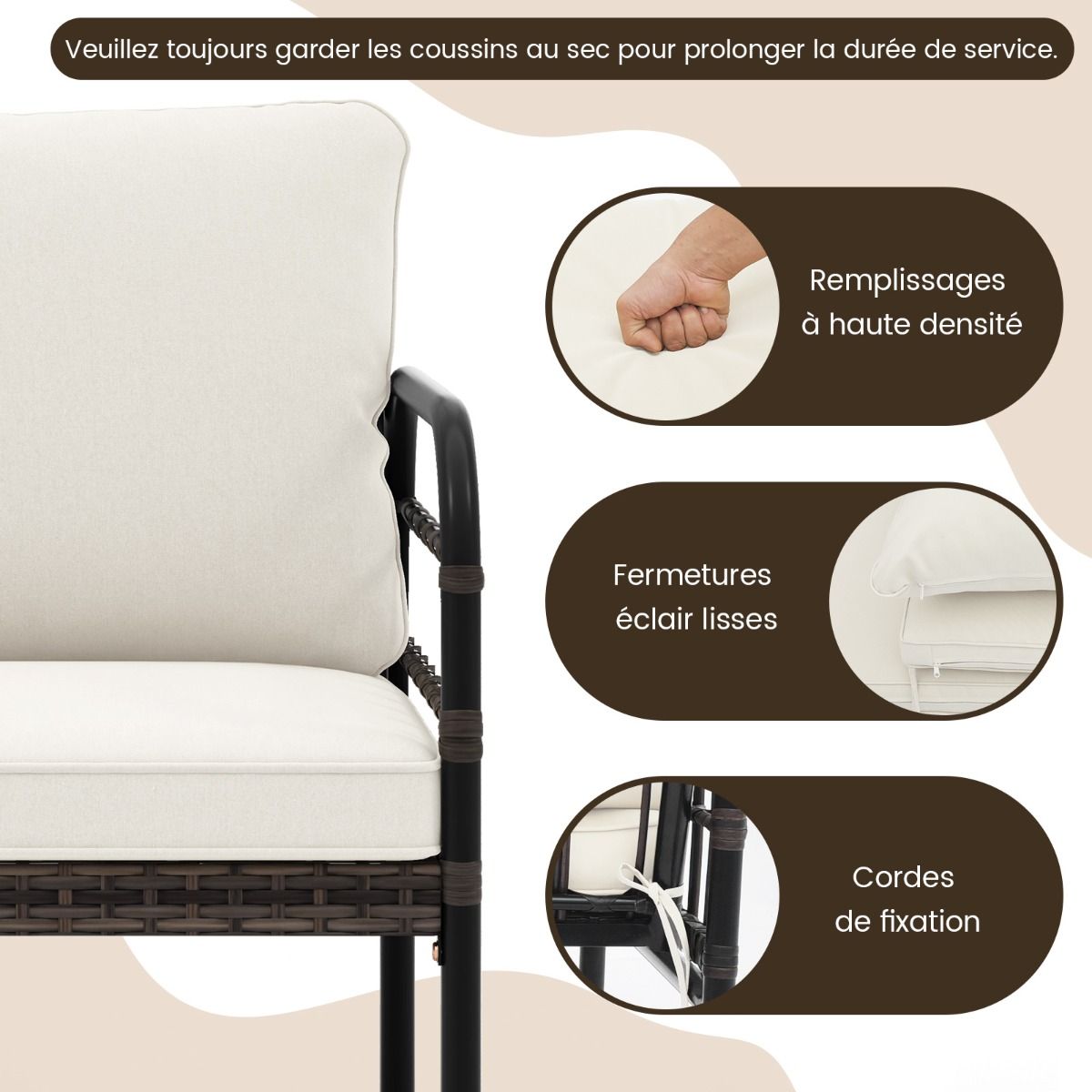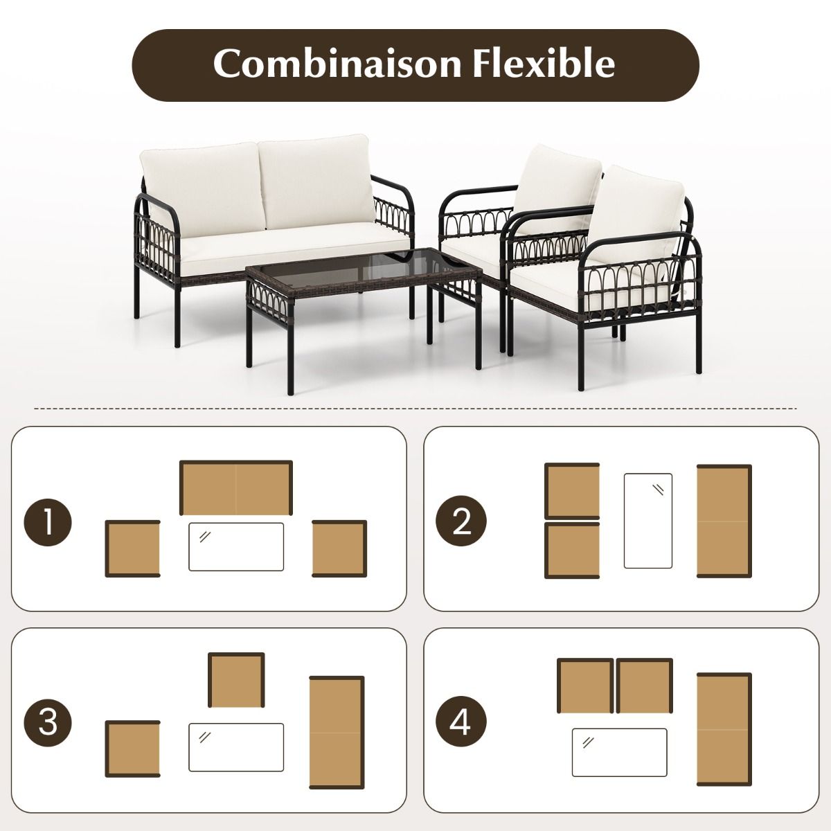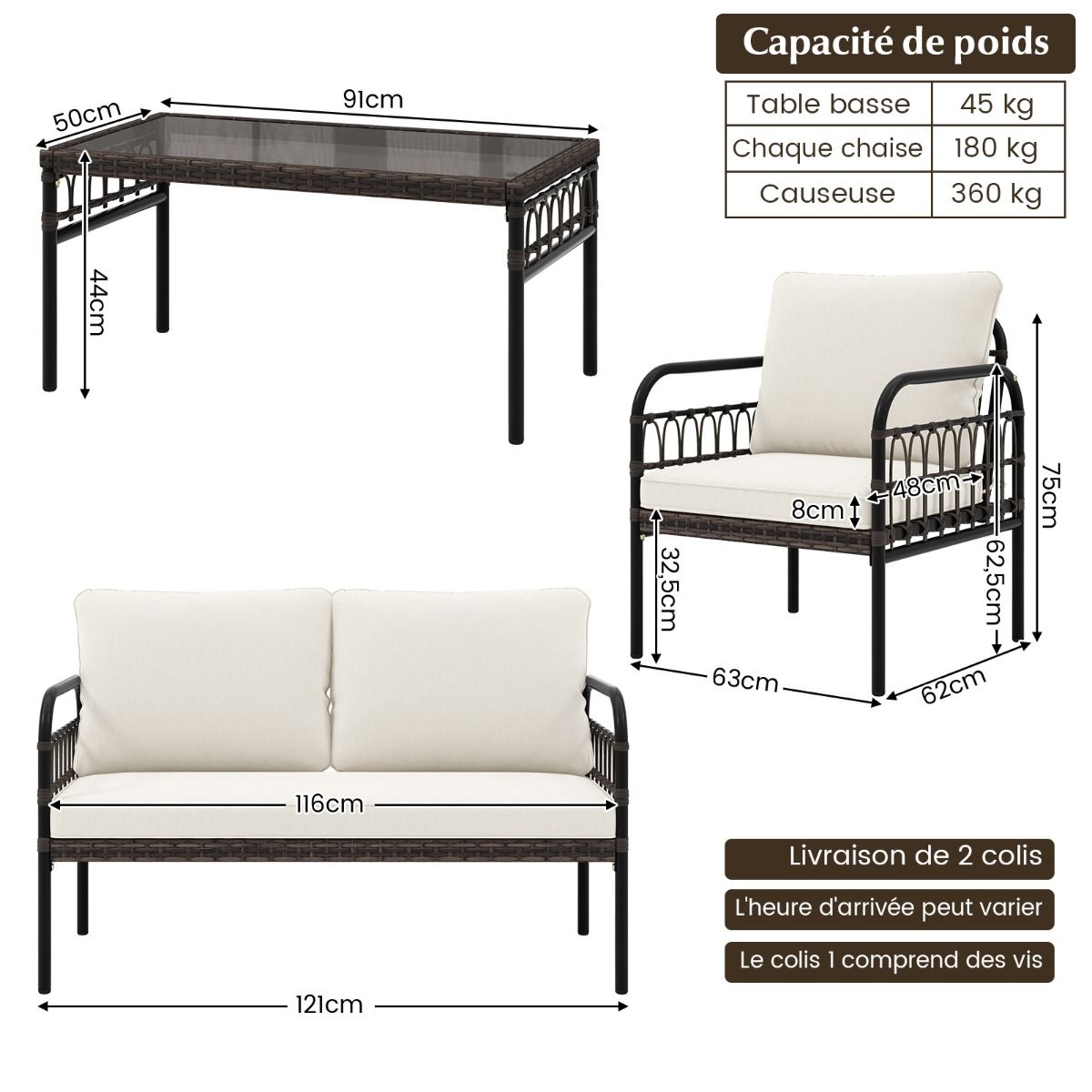 This outdoor furniture set is easy to assemble and ready to use. It includes a two-seater sofa, a coffee table, and two chairs, allowing for flexible arrangement to suit different space sizes. Soft cushions provide comfortable seating, and the tempered glass coffee table makes it easy to access items. Carefully selected materials, such as hand-woven PE rattan and a rust-resistant metal frame, ensure durability for extended outdoor use. Product Features: Built for the Outdoors Sun-resistant and fade-resistant PE rattan, combined with a sturdy and rust-resistant metal frame, gives this outdoor furniture set superior performance, ensuring its durability and longevity. Comfortable Experience These upholstered chairs and two-seater sofas feature high-density filling and adjustable backrests, creating a comfortable outdoor gathering space. To extend the life of the cushions, always keep them dry. Flexible Arrangement: 1 coffee table (91 x 50 x 44 cm), 1 two-seater sofa (121 x 62 x 75 cm), and 2 armchairs (63 x 62 x 75 cm) allow you to arrange this outdoor furniture set freely according to your space. Rectangular Coffee Table: Whether you're enjoying a cup of coffee in the morning or hosting a cocktail party, this tempered glass coffee table provides a beautiful tabletop for your drinks and snacks. Easy Maintenance: High-quality tempered glass makes cleaning easy and convenient. Furthermore, if you want to wash the cushion covers, simply open and remove them for easy cleaning. Sturdy and Durable Features: Sturdy and durable hand-woven PE rattan, fade-resistant and sun-protective; a robust rust-resistant metal frame enhances stability and durability; a sturdy structure makes this outdoor furniture set more stable; non-slip feet increase stability; premium tempered glass tabletop, easy to clean; suction cup attachment for the tabletop; soft cushions for unprecedented comfort; drawstrings prevent cushions from slipping; removable, washable cushion covers with smooth zippers; keep cushions dry to extend their lifespan. Set Includes: 1 two-seater sofa, 1 coffee table, and 2 armchairs, providing flexible seating arrangements; the rectangular coffee table makes it easy to access items; suitable for patios, patios, poolside, etc.; easy to assemble; shipped in 2 boxes; arrival dates and times may vary. Package includes box 1 and screws. Specifications: Cushion color: white; Rattan color: brown mixed color; Material: PE rattan, metal, tempered glass; Table dimensions: 91 x 50 x 44 cm (L x W x H); Chair dimensions: 63 x 62 x 75 cm (L x W x H); Lover sofa dimensions: 121 x 62 x 75 cm (L x W x H); Seat height from the ground: 32.5 cm; Backrest cushion dimensions: 60 x 46 x 17 cm (W x D x H); Seat cushion dimensions: 58 x 48 x 8 cm (W x D x H); Lover sofa cushion dimensions: 116 x 48 x 8 cm (W x D x H); Table load capacity: 45 kg; Chair load capacity: 180 kg; Lover sofa load capacity: 360 kg. Net weight: Table: 8 kg; Chair: 7 kg; Sofa: 12 kg; High load-bearing capacity. Package includes: 1 table, 1 sofa, 1 sofa cushion, 2 chairs, 2 seat cushions, 4 back cushions, and 1 instruction manual.