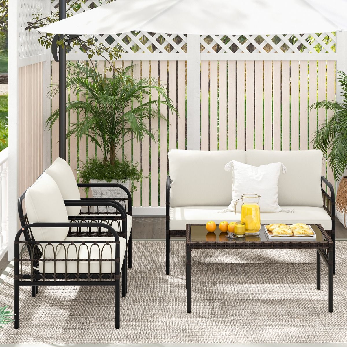 • 4-Piece Rattan Patio Furniture Set, 180-360KG Load Capacity, with Loveseat Chairs, Cushions, and Tempered Glass Coffee Table for Balcony, White -