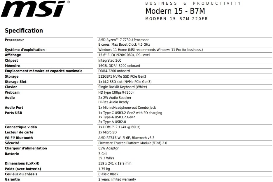 • MSI Modern 15 B7M-220FR: AMD Ryzen 7 7730U - 16GB LPDDR4 - 512GB SSD - AMD Radeon? Graphics - 15.6" Full HD - Windows 11 Home - Backlit AZERTY Keyboard