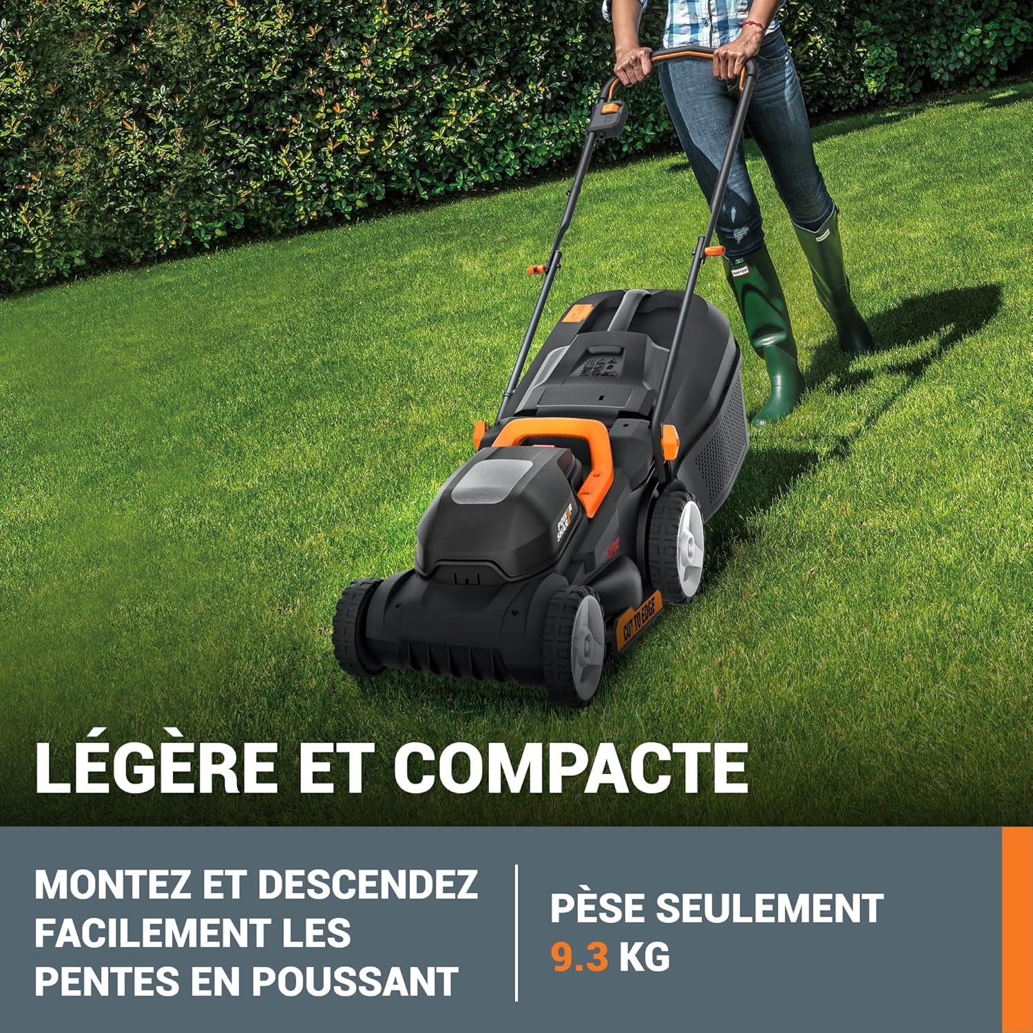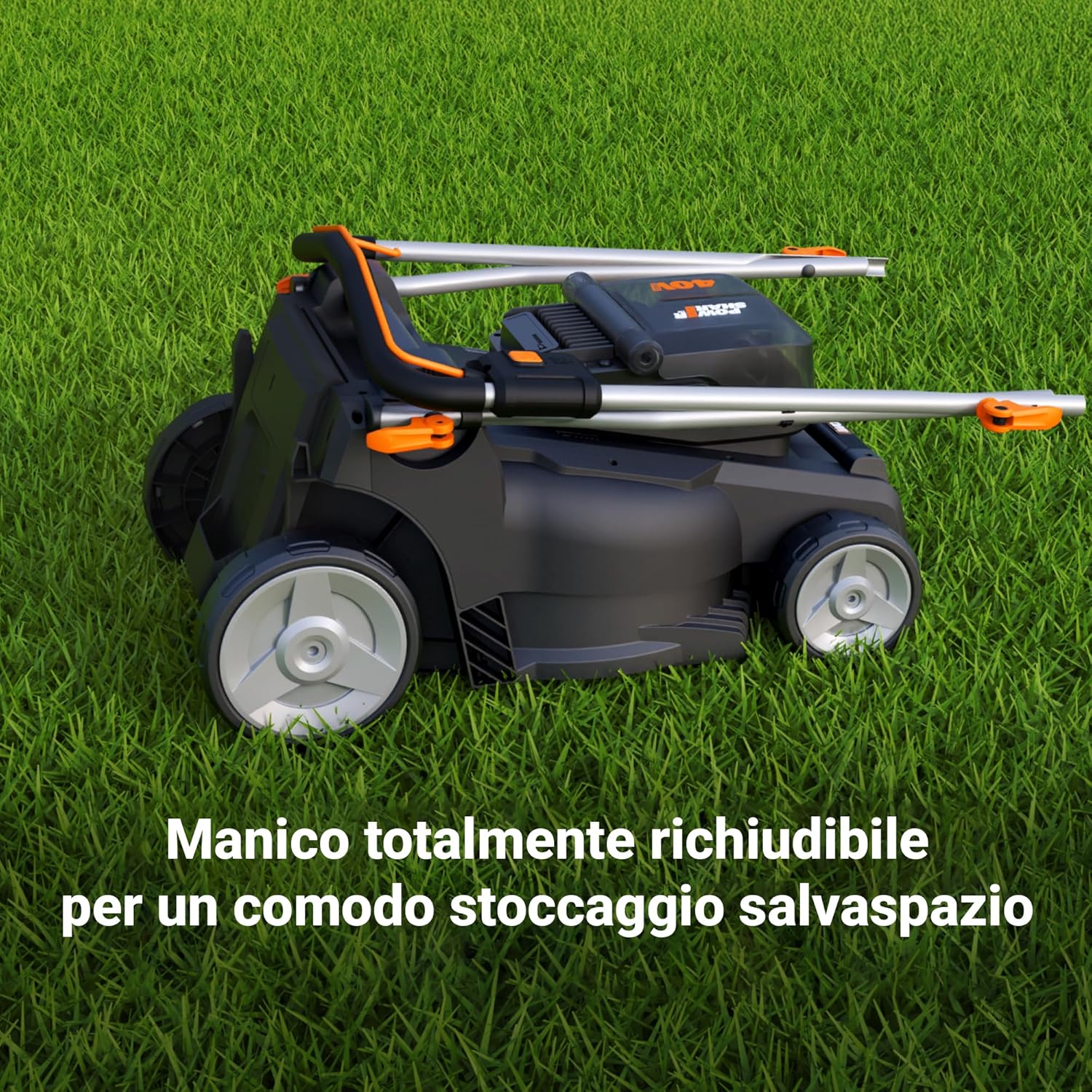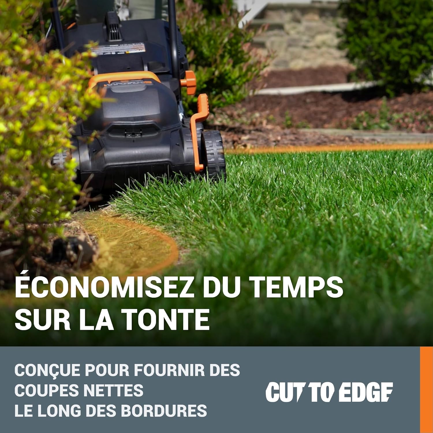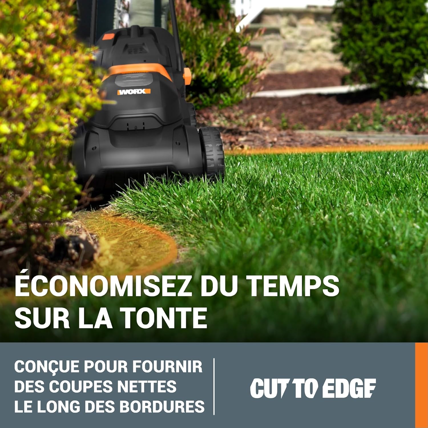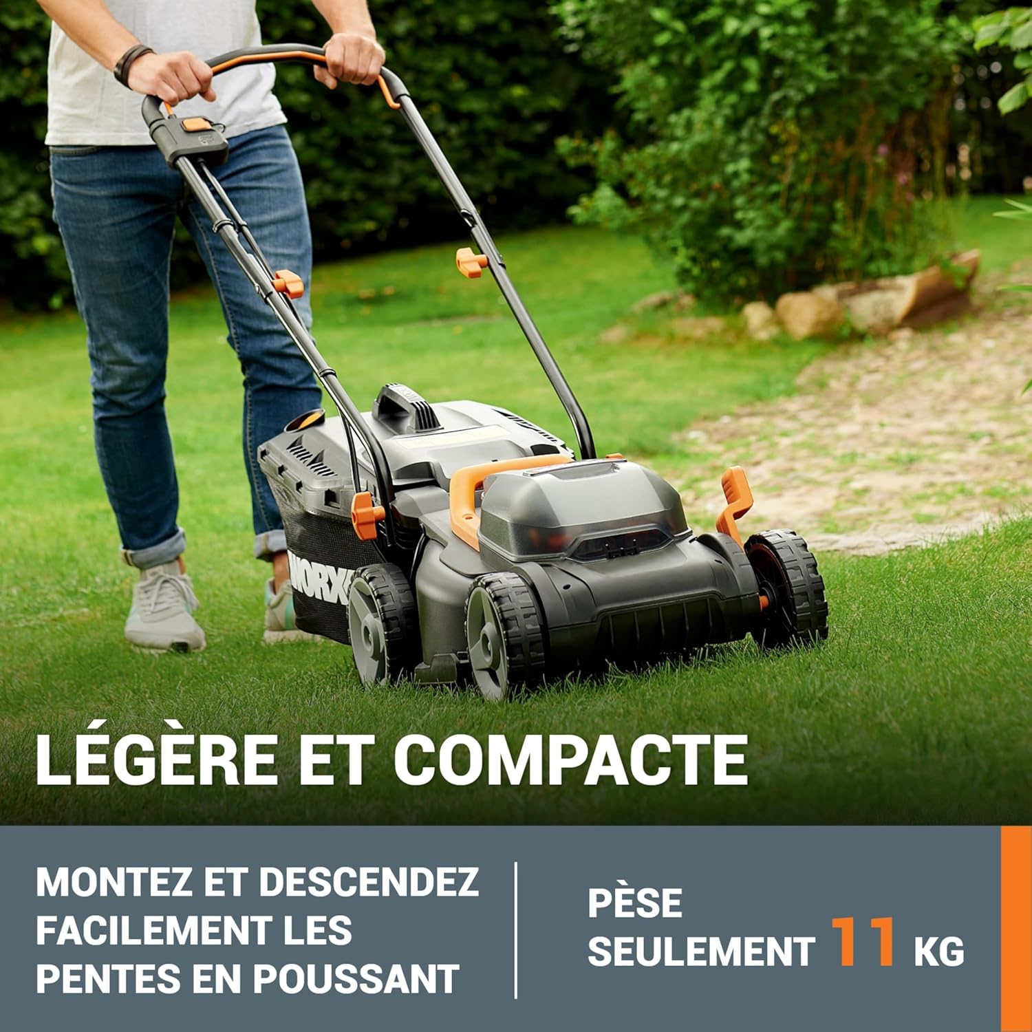 [SUITABLE FOR SMALL AND MEDIUM GARDENS] With its 34 cm cutting width and optimized battery life, the WORX lawnmower is ideal for gardens up to 460 m2, complemented by the string trimmer for hard-to-reach areas.