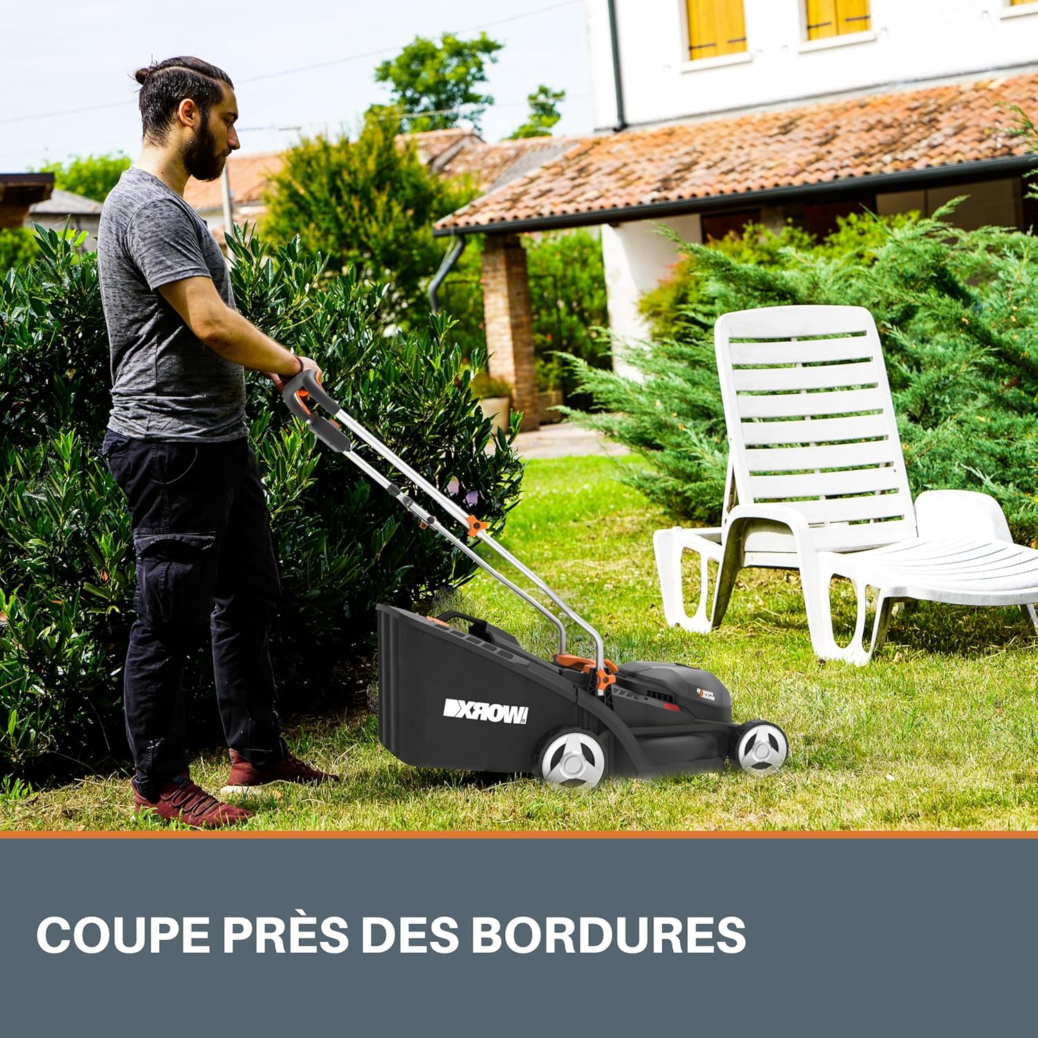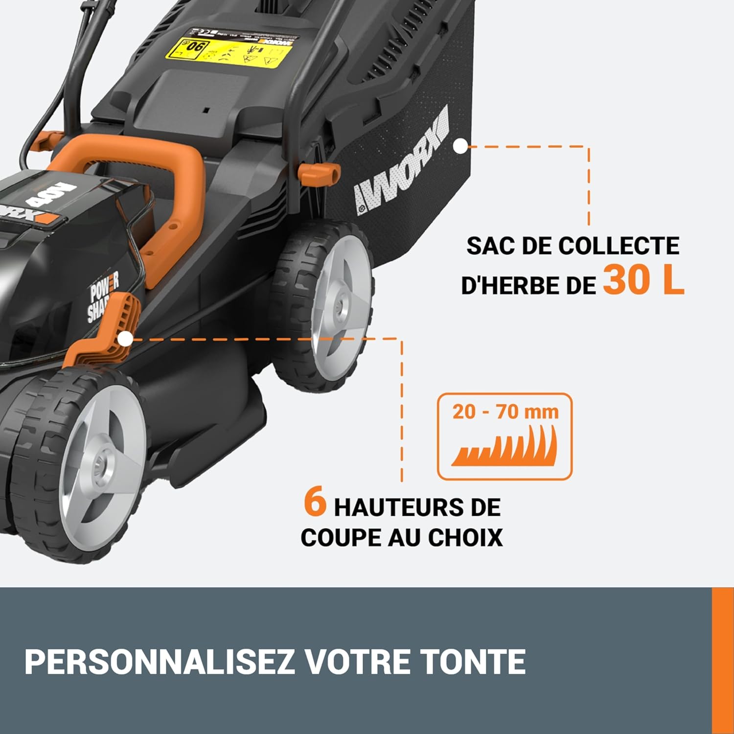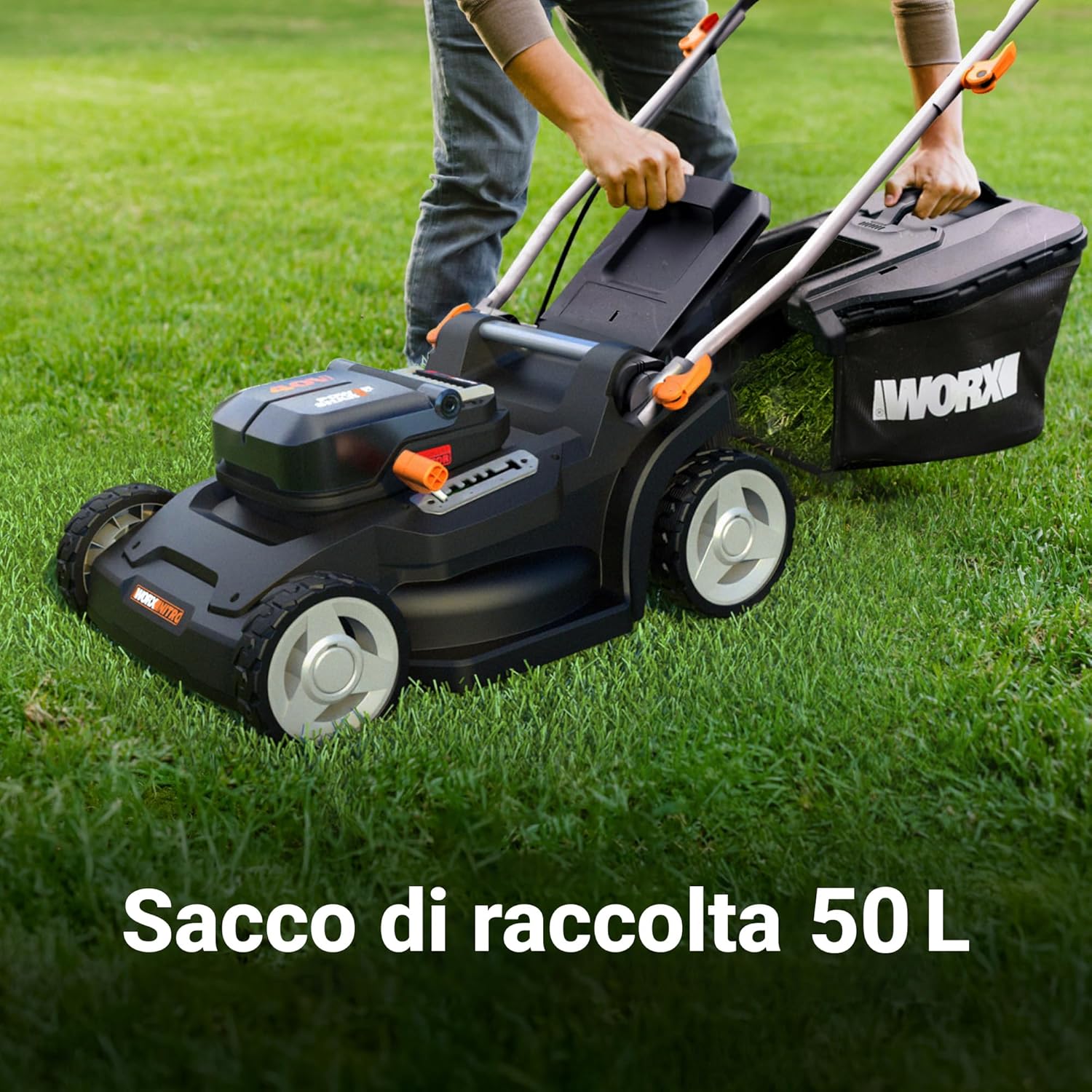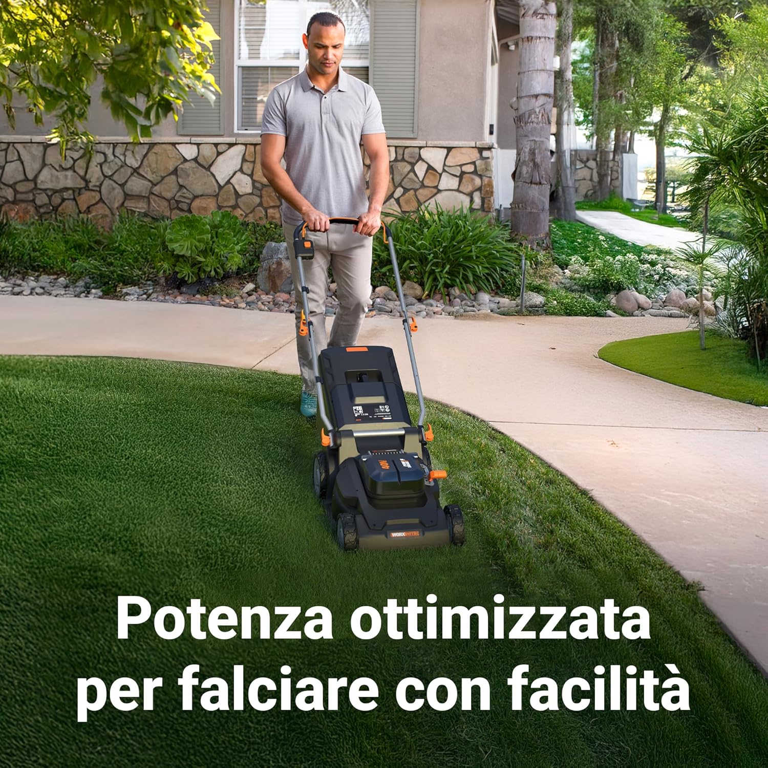[SUITABLE FOR SMALL AND MEDIUM GARDENS] With its 34 cm cutting width and optimized battery life, the WORX lawnmower is ideal for gardens up to 460 m2, complemented by the string trimmer for hard-to-reach areas.