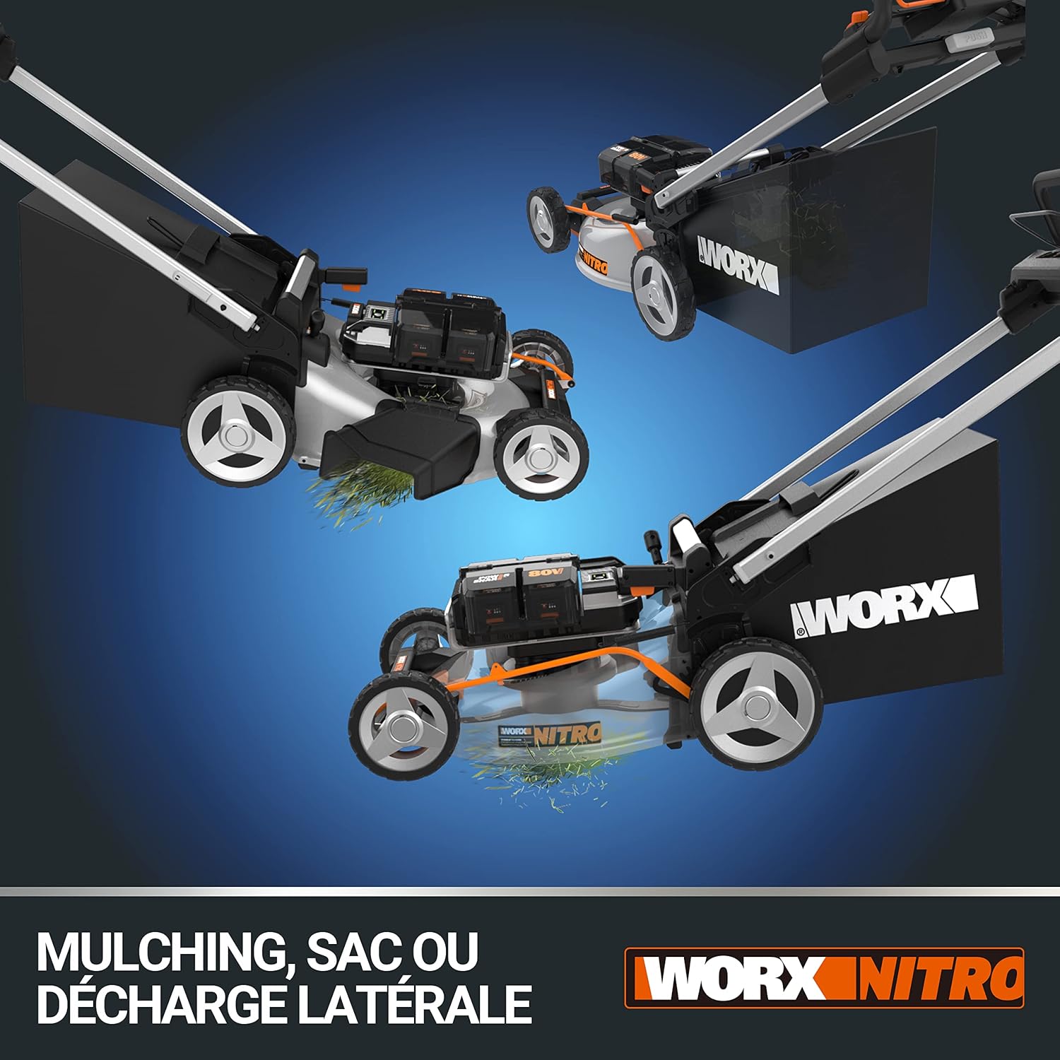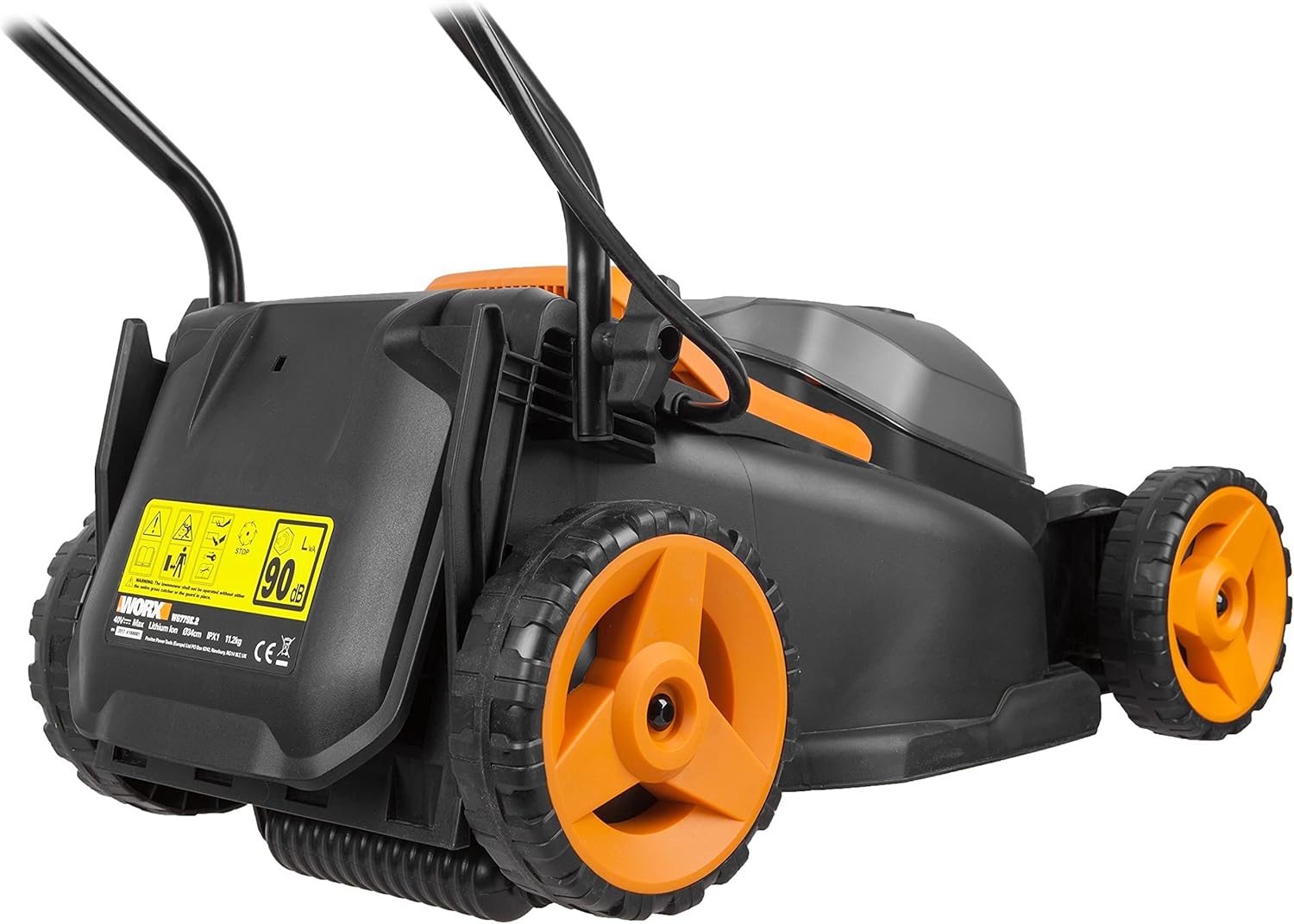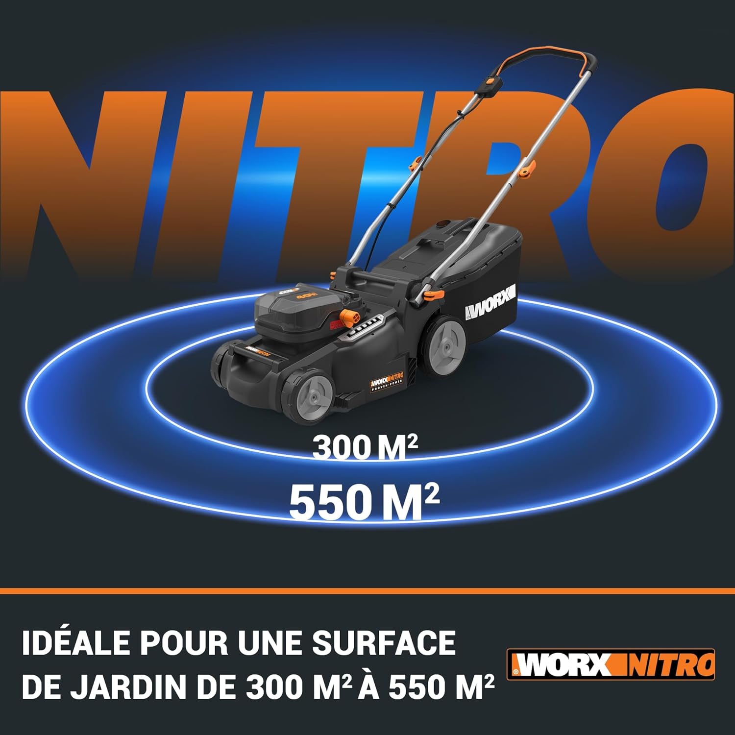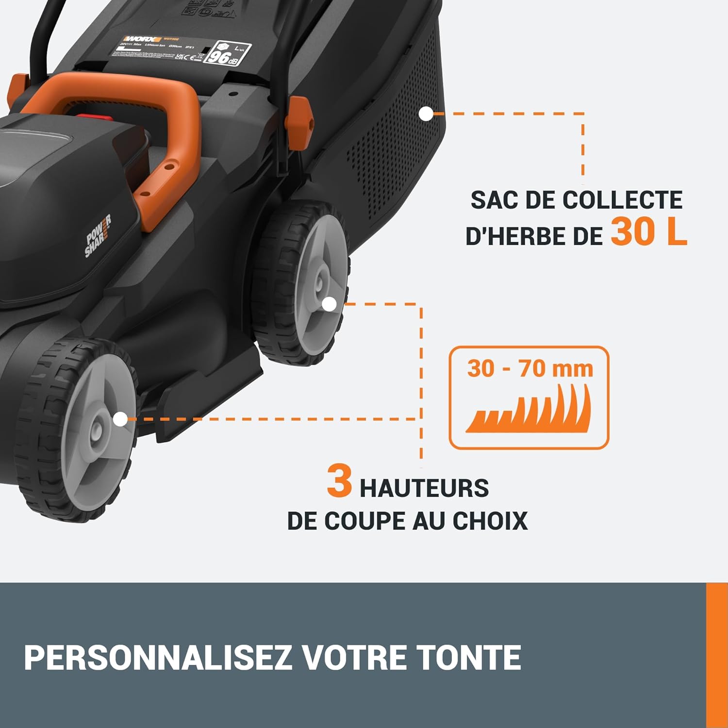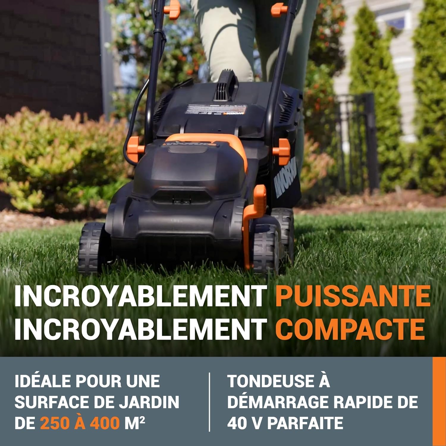 [SUITABLE FOR SMALL AND MEDIUM GARDENS] With its 34 cm cutting width and optimized battery life, the WORX lawnmower is ideal for gardens up to 460 m2, complemented by the string trimmer for hard-to-reach areas.