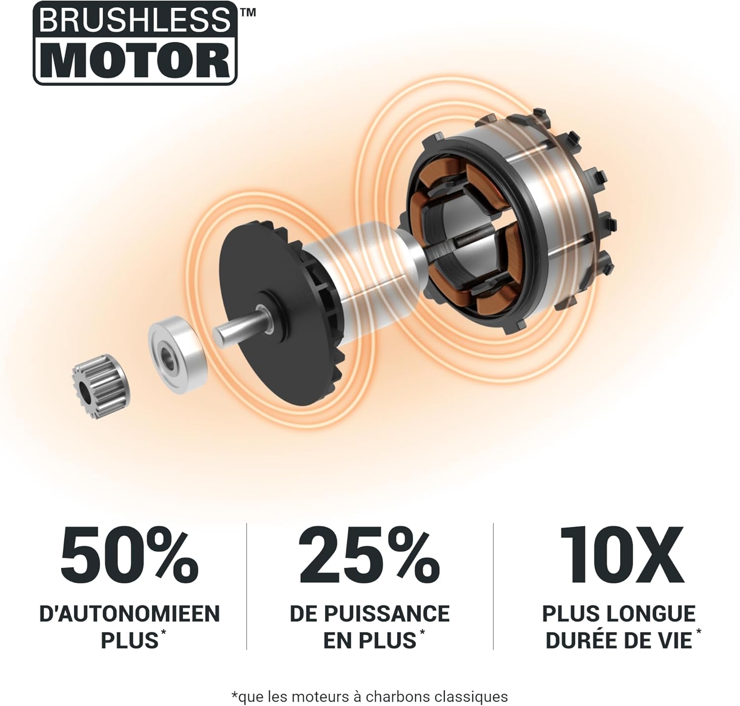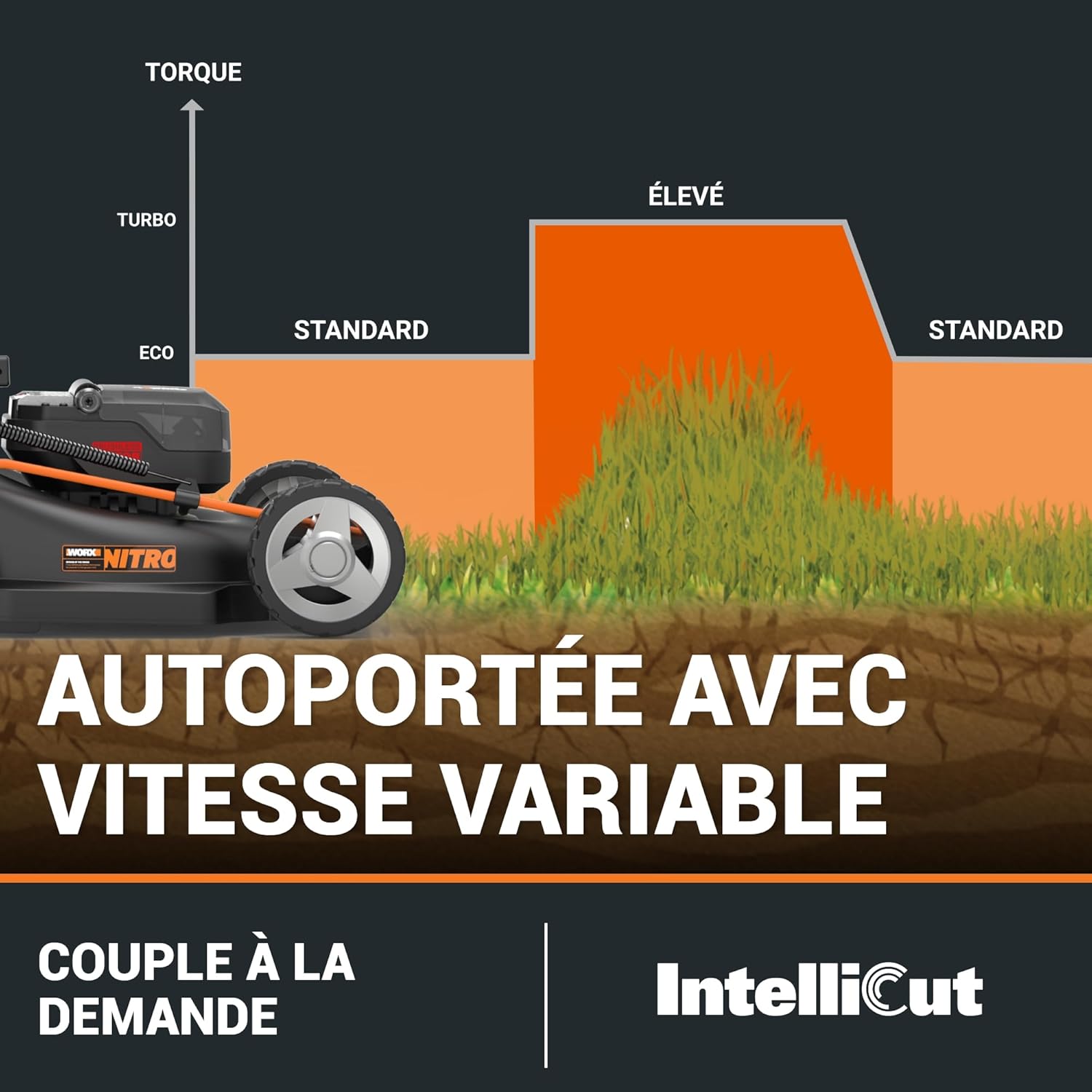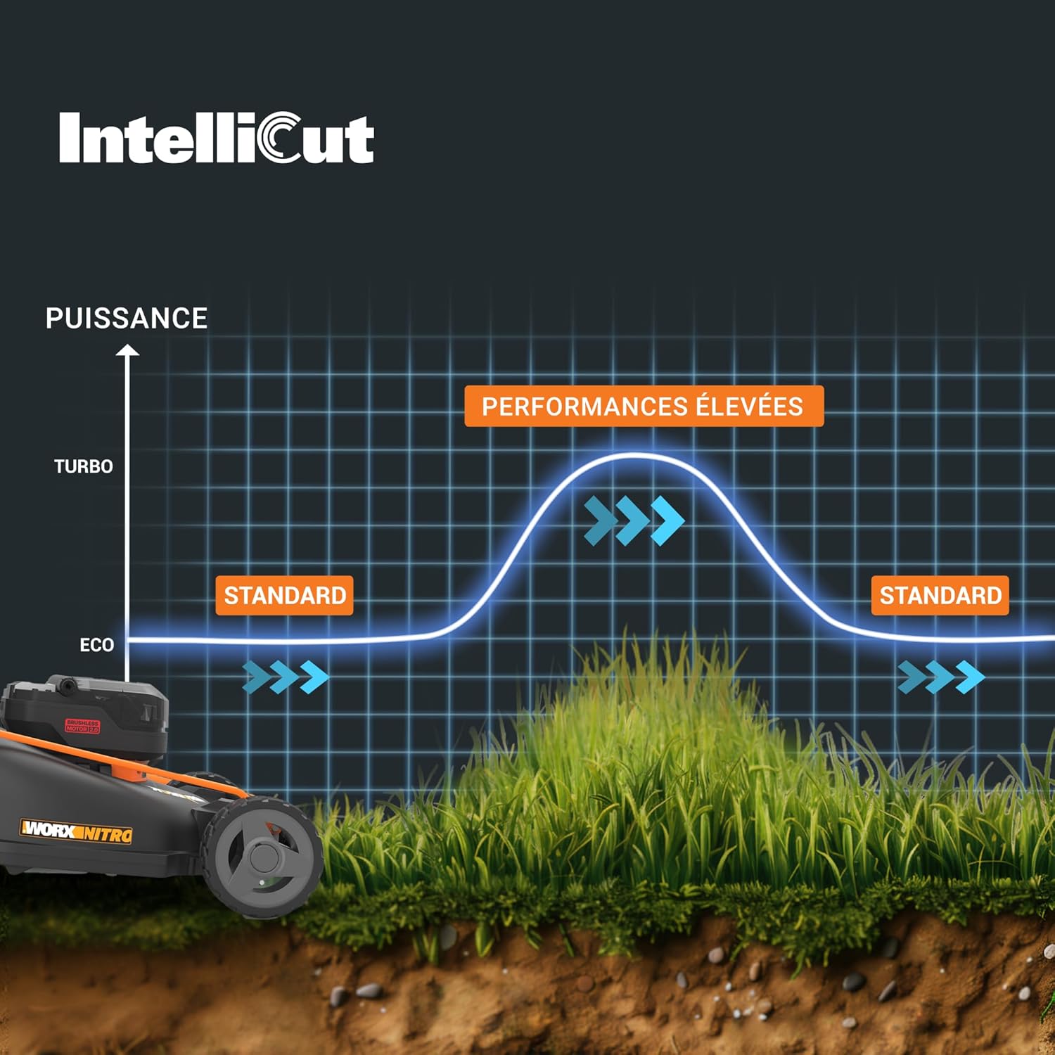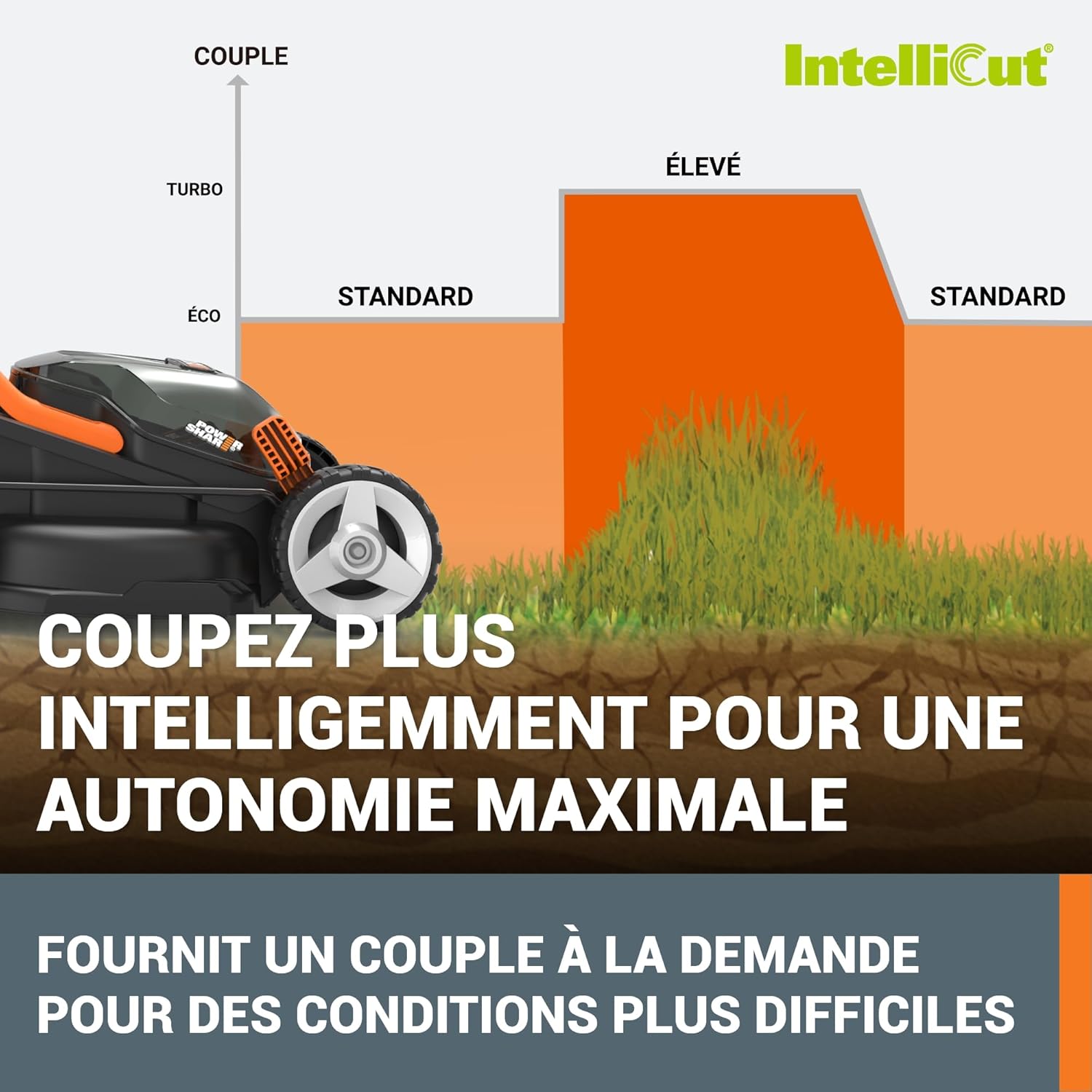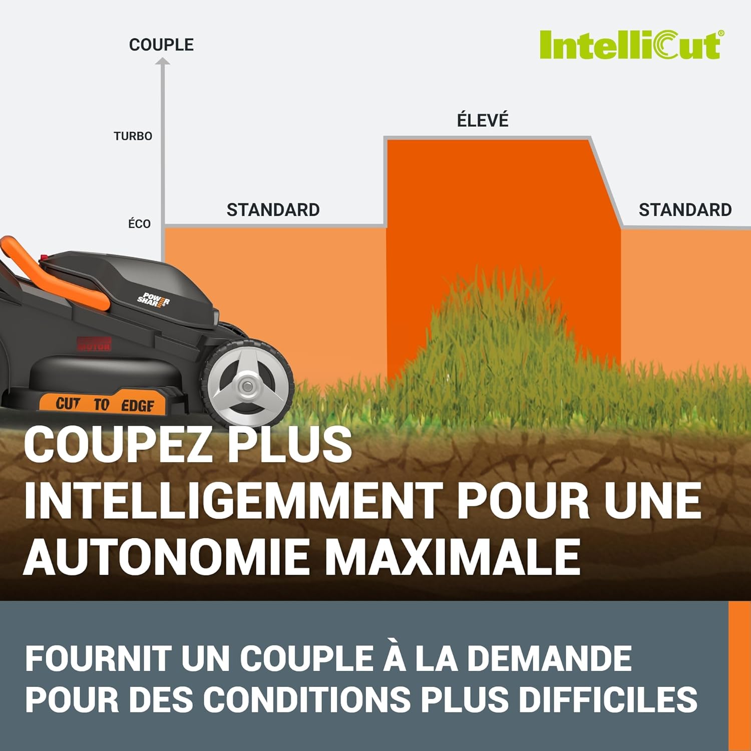 [EFFORTLESS MOWING AND FINISHING] The cordless lawnmower with Intellicut technology automatically adjusts its power according to the grass density, while the 2-in-1 grass trimmer ensures clean, precise edges.