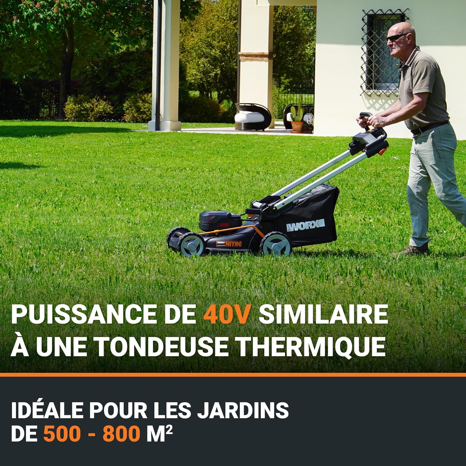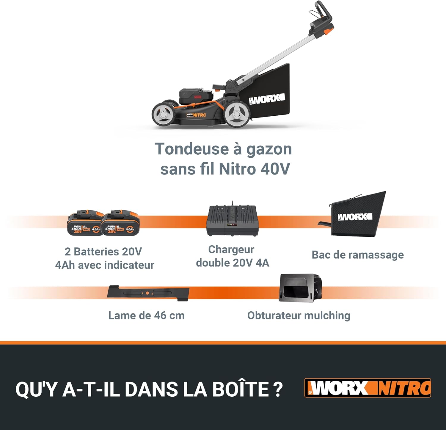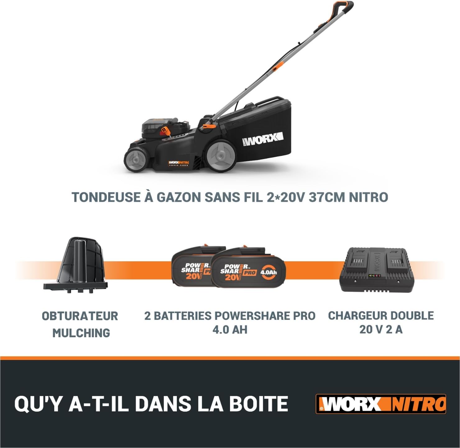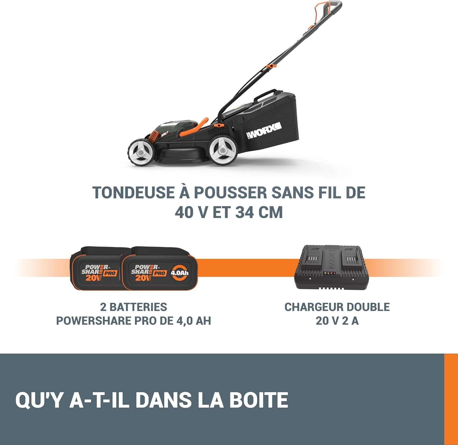 WORX ESSENTIAL GARDEN PACK: 40V Lawnmower (460m2) + 20V Grass Trimmer + Two 4Ah Batteries and One 2Ah Battery + Dual and Single Chargers (Ideal for Garden Maintenance). Achieve a perfectly manicured lawn with the WORX WG779E.1 Lawnmower + WG163E.1 Grass Trimmer pack. Thanks to Intellicut? technology, the mower automatically adjusts its power for efficient cutting, while its Cut to Edge function allows you to cut grass right up to the edges. Complete the finishing touch with the 2-in-1 grass trimmer, which transforms into an edger for clean, precise lines. Comfortable and ergonomic, this pack is ideal for gardens up to 460 m2. Technical specifications of the WG779E.1 lawnmower: Battery pack: 2 x 20V MAX/4Ah Li-ion Cutting width: 34 cm Cutting height: 20-70 cm Mowing area: up to 460 m2 Grass catcher capacity: 30L Charging time: 2 hours Weight: 12.6 kg Supplied with: 2 x 20V - 4Ah batteries 1 x dual charger 1 x 30L grass catcher Technical specifications of the WG163E.1 string trimmer: Battery pack: 2 x 20V MAX/2Ah Li-ion Cutting diameter: 30 cm Line length: 1 x 3 m Line diameter: 1.65 mm Charging time: 1 hour Weight: 2.4 kg Supplied with: 1 x 20V - 2Ah battery 1 x charger 1 x spool of cutting line Worx? is a registered trademark of the International Positec Group, Positive Technologies, which has over 6,000 patents filed in the production and creation of innovative tools for the DIY and gardening sector. At Positec, we are here to offer you the best in technology, thanks to intelligently designed products that make your daily life easier and help you achieve your goals. Innovative concepts, manufactured sustainably to leave a better world for future generations.