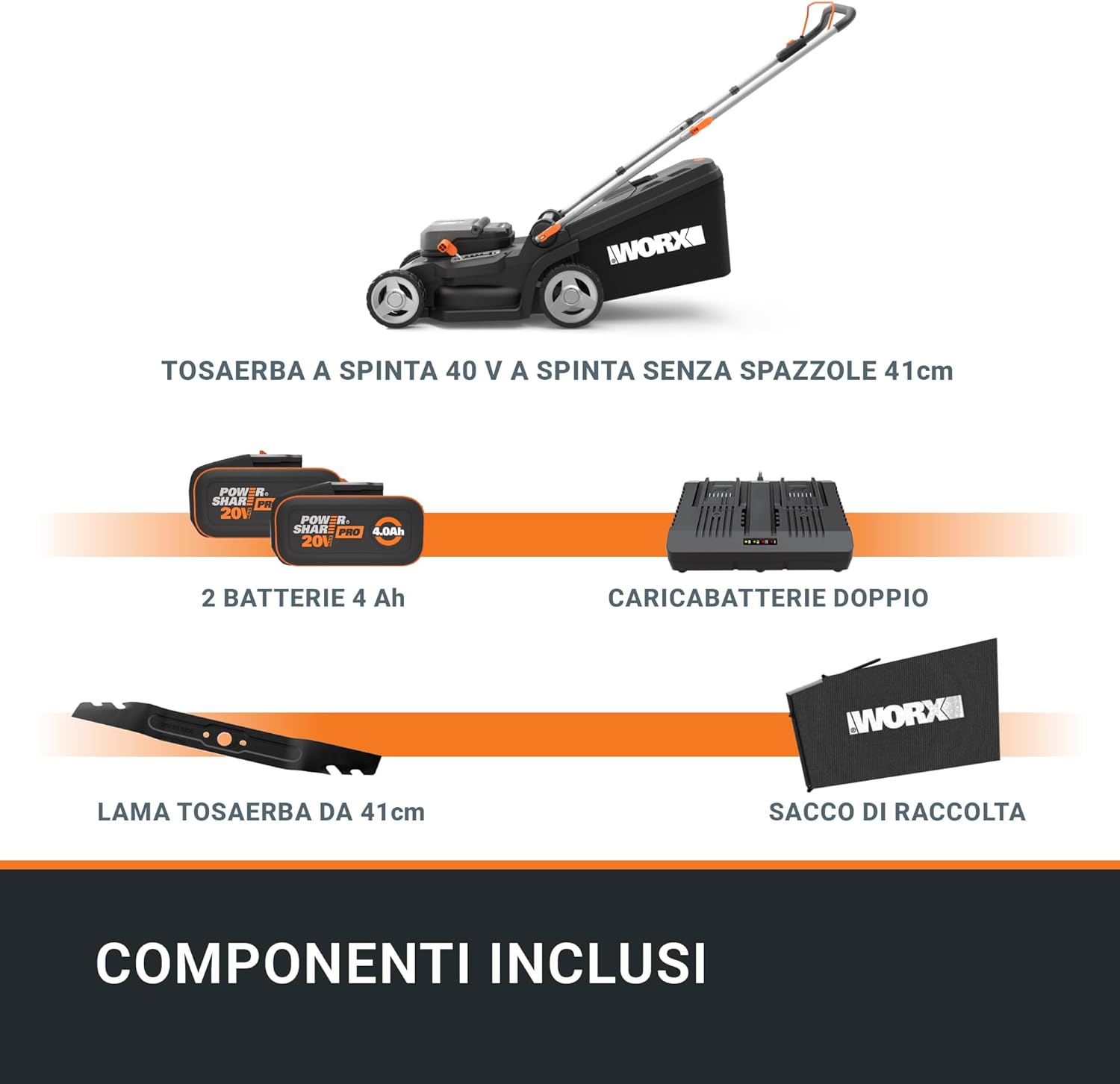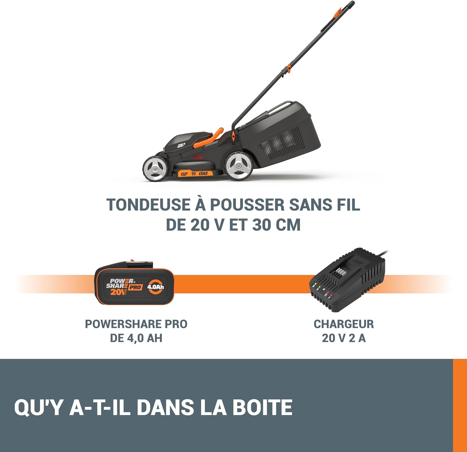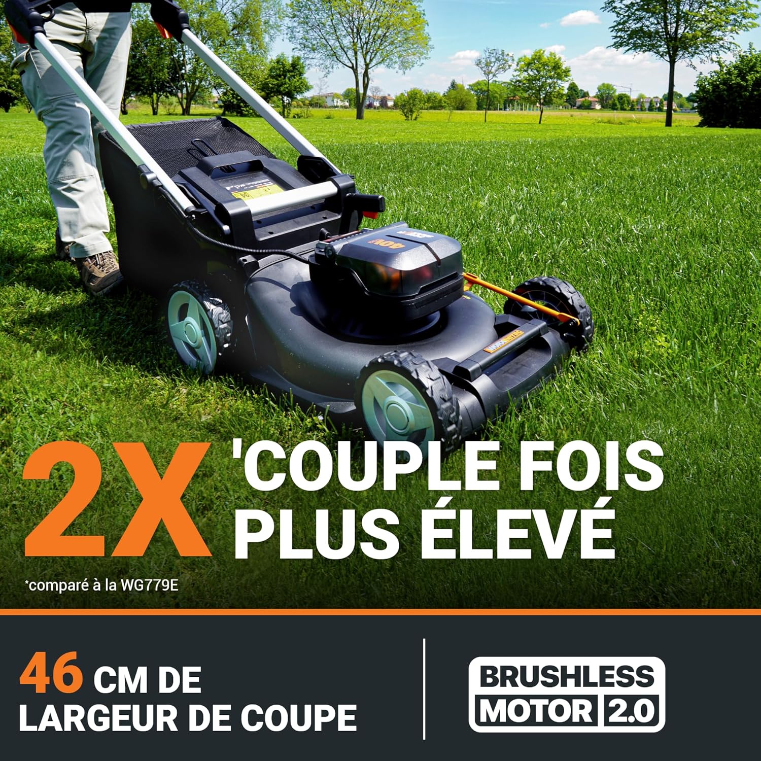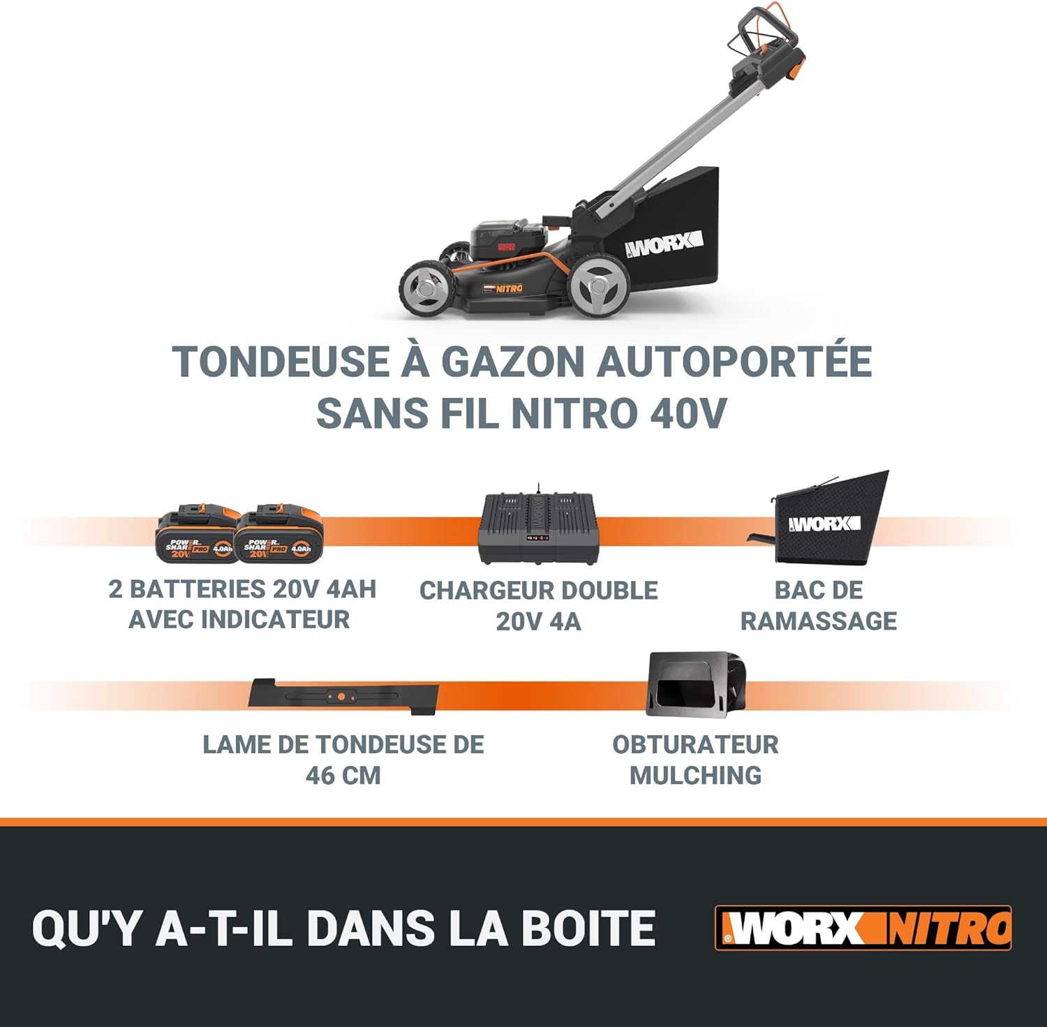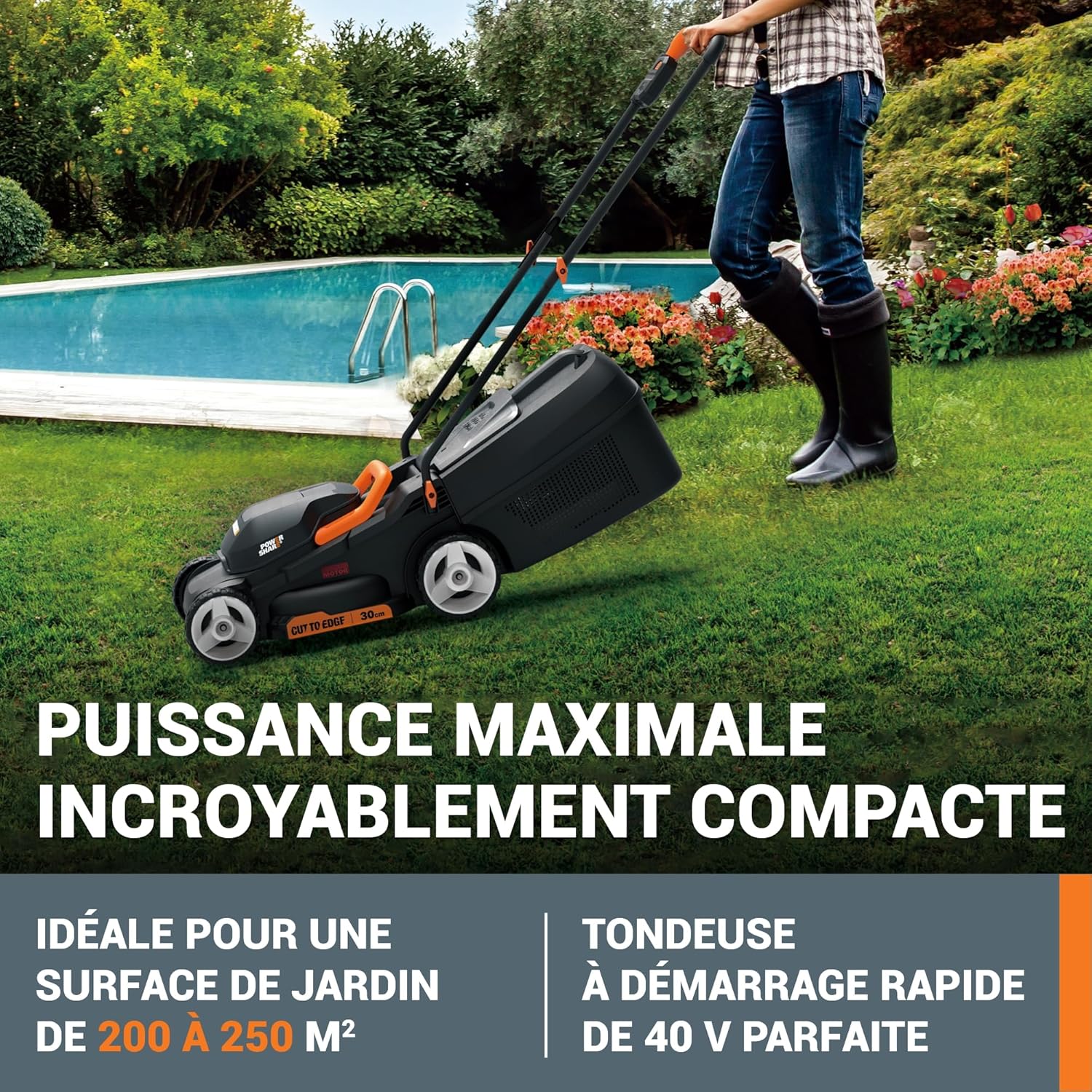 WORX ESSENTIAL GARDEN PACK: 40V Lawnmower (460m2) + 20V Grass Trimmer + Two 4Ah Batteries and One 2Ah Battery + Dual and Single Chargers (Ideal for Garden Maintenance). Achieve a perfectly manicured lawn with the WORX WG779E.1 Lawnmower + WG163E.1 Grass Trimmer pack. Thanks to Intellicut? technology, the mower automatically adjusts its power for efficient cutting, while its Cut to Edge function allows you to cut grass right up to the edges. Complete the finishing touch with the 2-in-1 grass trimmer, which transforms into an edger for clean, precise lines. Comfortable and ergonomic, this pack is ideal for gardens up to 460 m2. Technical specifications of the WG779E.1 lawnmower: Battery pack: 2 x 20V MAX/4Ah Li-ion Cutting width: 34 cm Cutting height: 20-70 cm Mowing area: up to 460 m2 Grass catcher capacity: 30L Charging time: 2 hours Weight: 12.6 kg Supplied with: 2 x 20V - 4Ah batteries 1 x dual charger 1 x 30L grass catcher Technical specifications of the WG163E.1 string trimmer: Battery pack: 2 x 20V MAX/2Ah Li-ion Cutting diameter: 30 cm Line length: 1 x 3 m Line diameter: 1.65 mm Charging time: 1 hour Weight: 2.4 kg Supplied with: 1 x 20V - 2Ah battery 1 x charger 1 x spool of cutting line Worx? is a registered trademark of the International Positec Group, Positive Technologies, which has over 6,000 patents filed in the production and creation of innovative tools for the DIY and gardening sector. At Positec, we are here to offer you the best in technology, thanks to intelligently designed products that make your daily life easier and help you achieve your goals. Innovative concepts, manufactured sustainably to leave a better world for future generations.