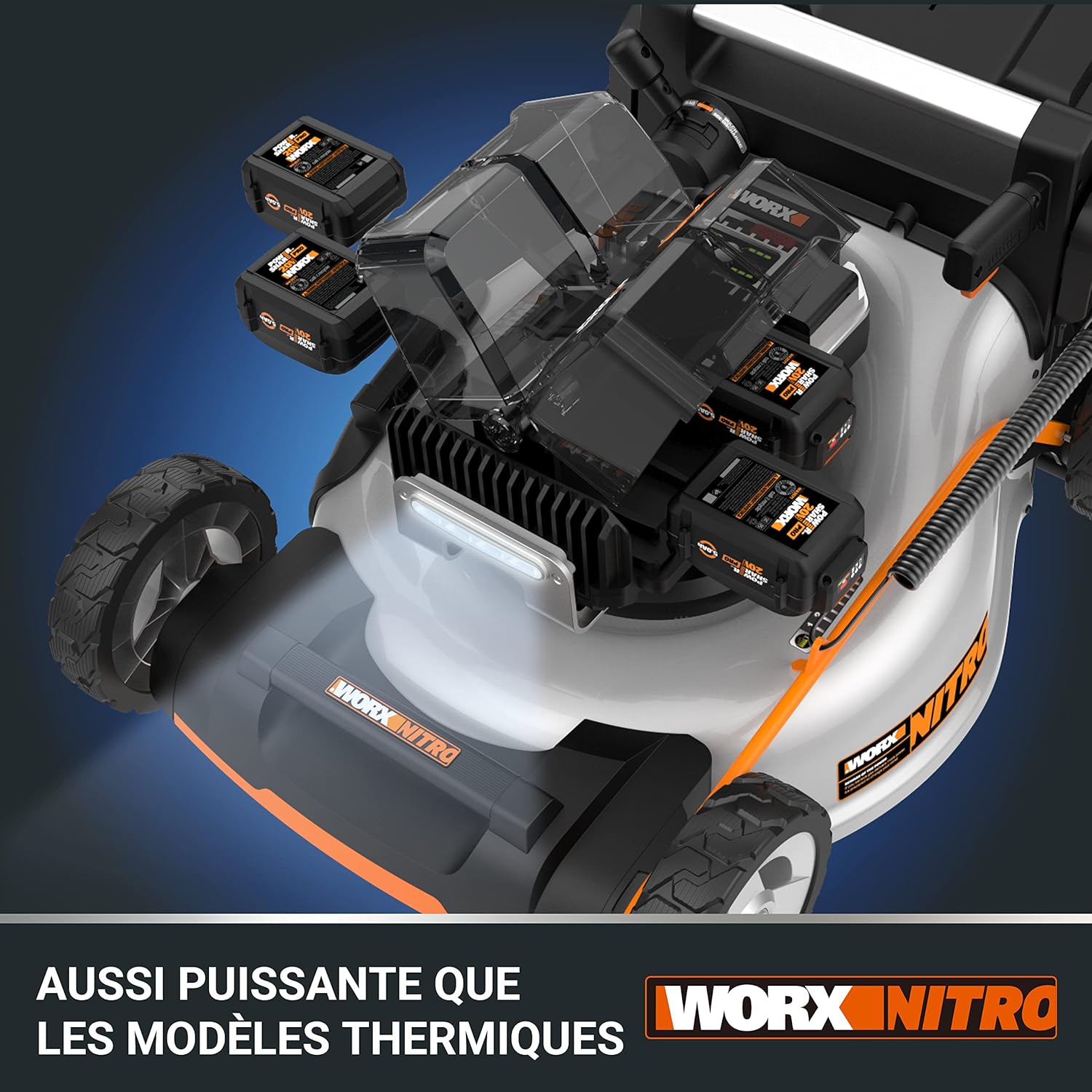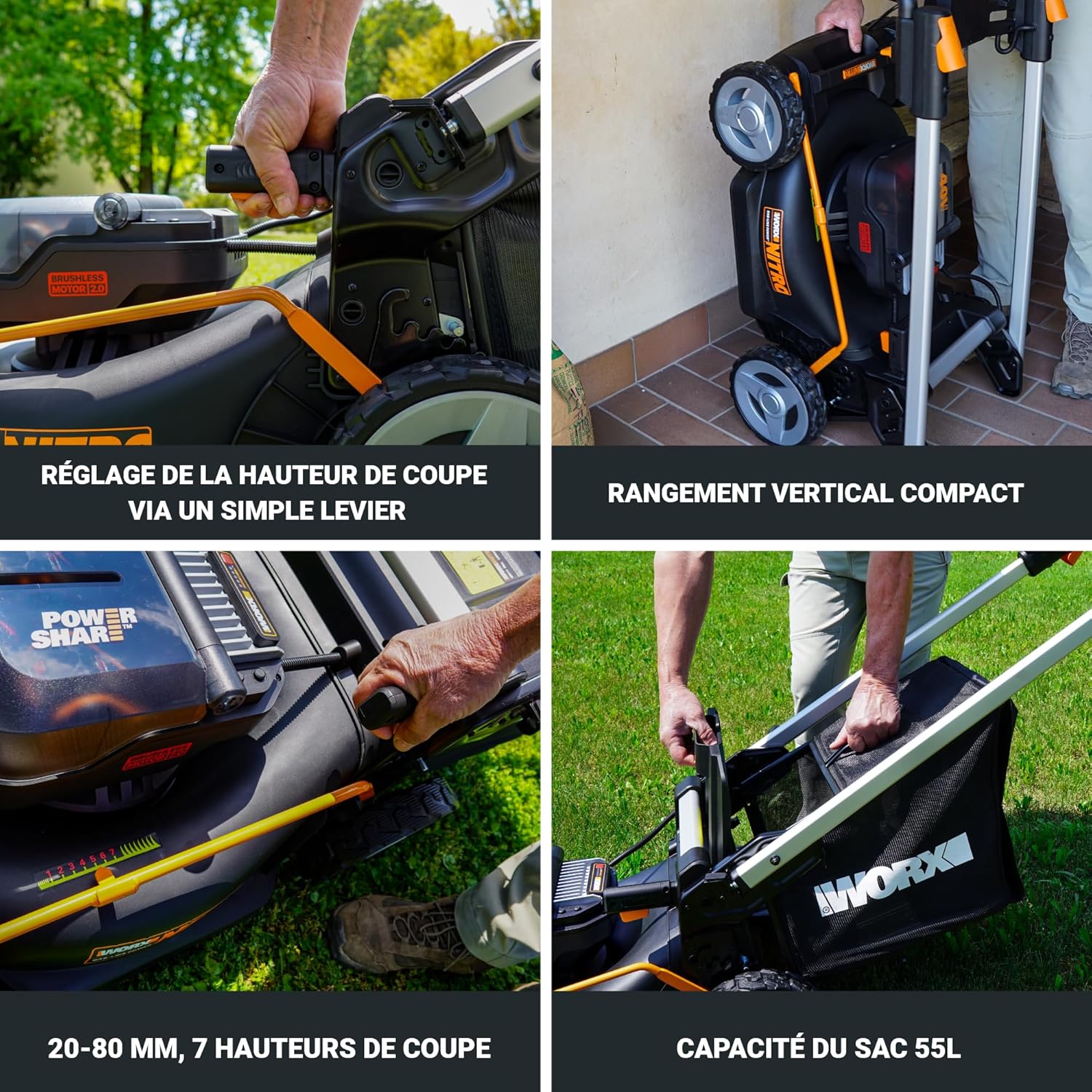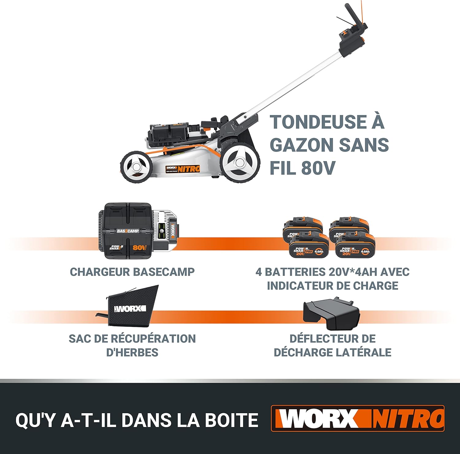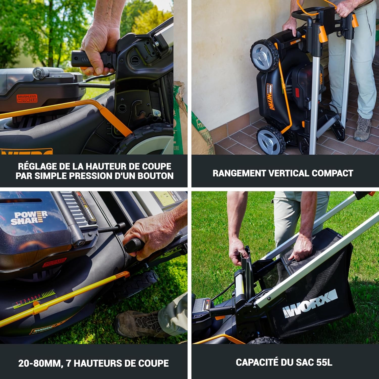 WORX ESSENTIAL GARDEN PACK: 40V Lawnmower (460m2) + 20V Grass Trimmer + Two 4Ah Batteries and One 2Ah Battery + Dual and Single Chargers (Ideal for Garden Maintenance). Achieve a perfectly manicured lawn with the WORX WG779E.1 Lawnmower + WG163E.1 Grass Trimmer pack. Thanks to Intellicut? technology, the mower automatically adjusts its power for efficient cutting, while its Cut to Edge function allows you to cut grass right up to the edges. Complete the finishing touch with the 2-in-1 grass trimmer, which transforms into an edger for clean, precise lines. Comfortable and ergonomic, this pack is ideal for gardens up to 460 m2. Technical specifications of the WG779E.1 lawnmower: Battery pack: 2 x 20V MAX/4Ah Li-ion Cutting width: 34 cm Cutting height: 20-70 cm Mowing area: up to 460 m2 Grass catcher capacity: 30L Charging time: 2 hours Weight: 12.6 kg Supplied with: 2 x 20V - 4Ah batteries 1 x dual charger 1 x 30L grass catcher Technical specifications of the WG163E.1 string trimmer: Battery pack: 2 x 20V MAX/2Ah Li-ion Cutting diameter: 30 cm Line length: 1 x 3 m Line diameter: 1.65 mm Charging time: 1 hour Weight: 2.4 kg Supplied with: 1 x 20V - 2Ah battery 1 x charger 1 x spool of cutting line Worx? is a registered trademark of the International Positec Group, Positive Technologies, which has over 6,000 patents filed in the production and creation of innovative tools for the DIY and gardening sector. At Positec, we are here to offer you the best in technology, thanks to intelligently designed products that make your daily life easier and help you achieve your goals. Innovative concepts, manufactured sustainably to leave a better world for future generations.