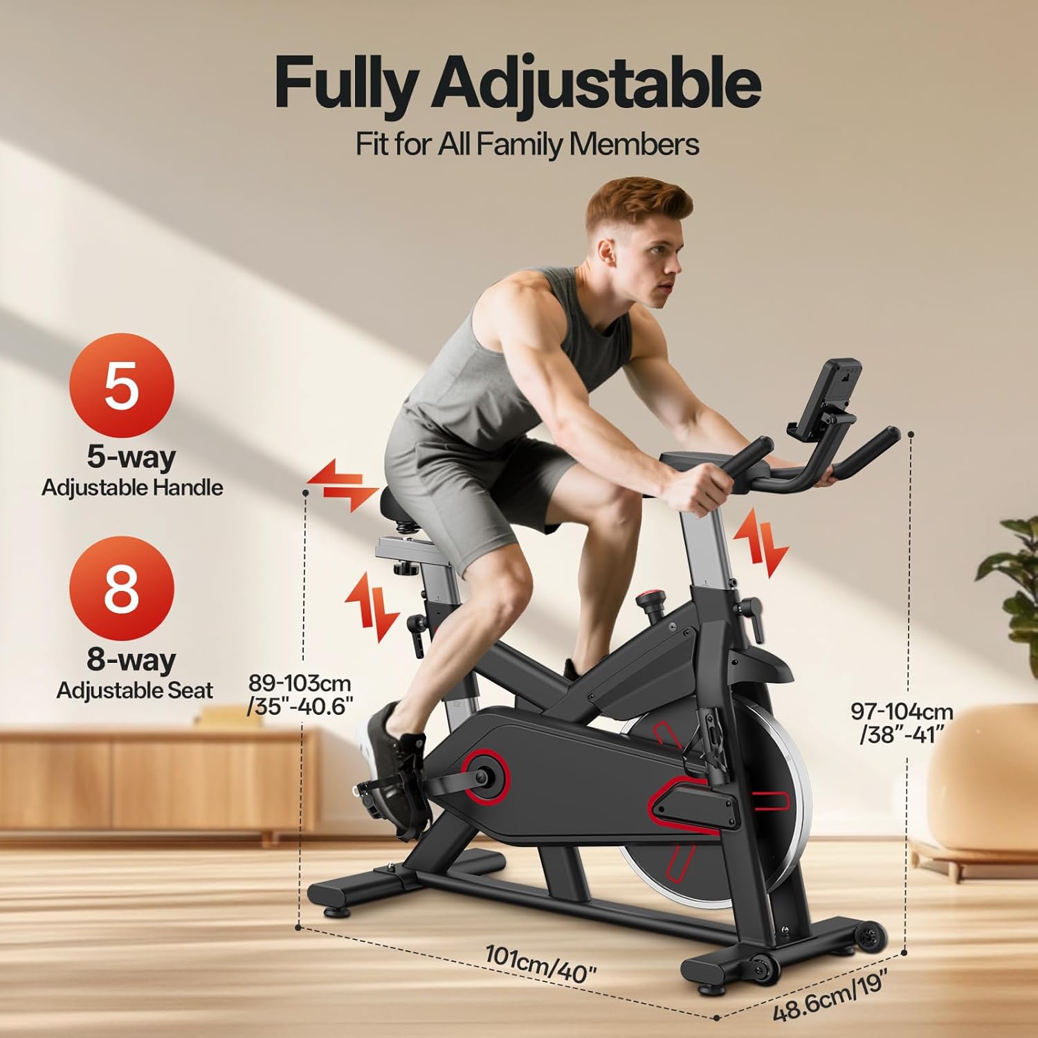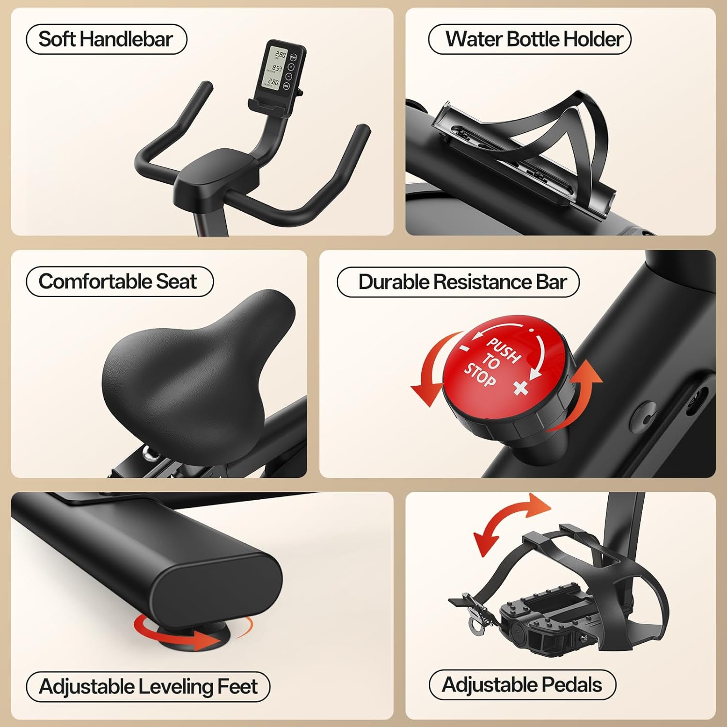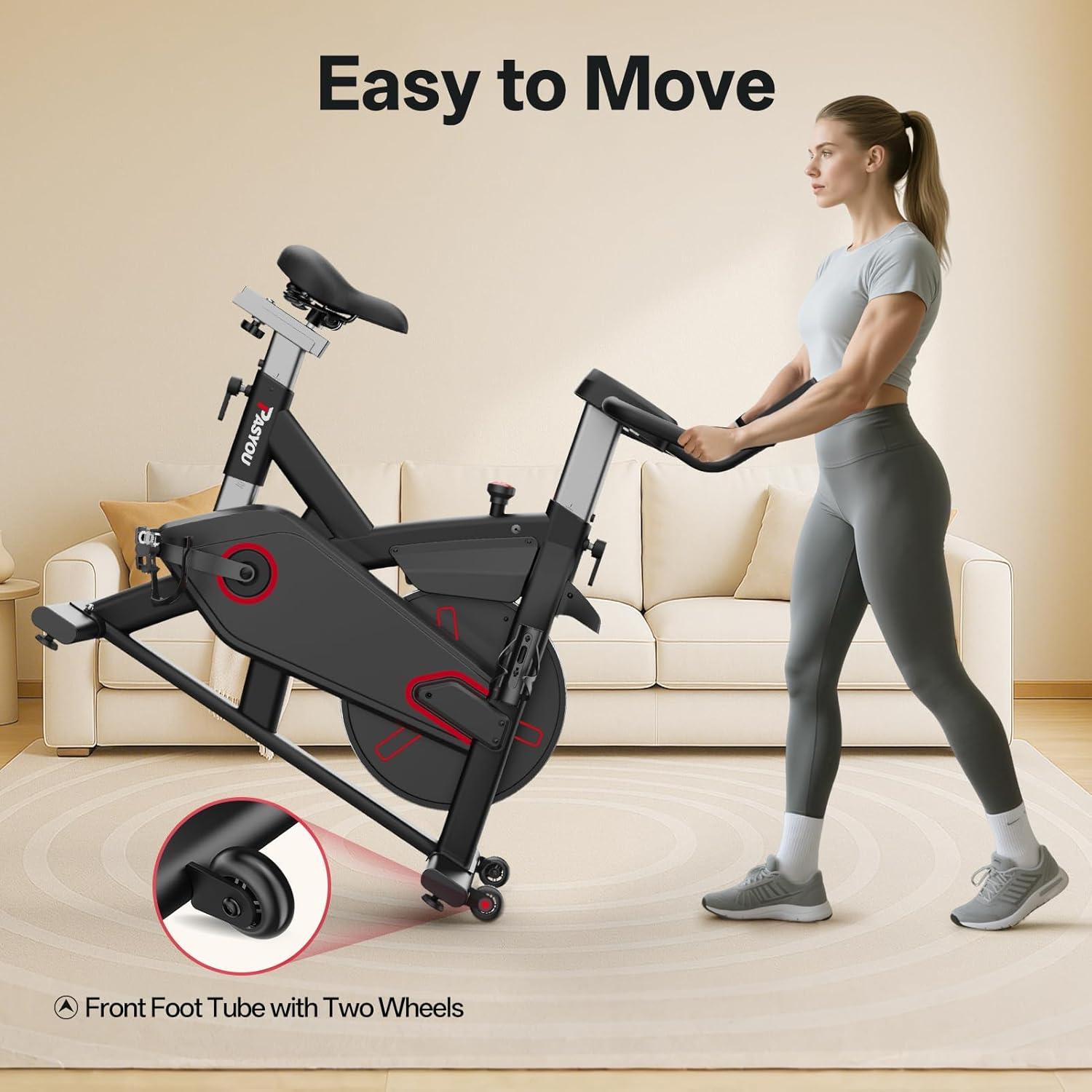 Durable and Stable Spinning Bike: This spinning bike features a triangular design that maintains stability and prevents wobbling even during vigorous exercise. Its sturdy carbon steel frame and 10kg flywheel allow for a maximum load capacity of 136kg, making it ideal for home use. Quiet and Smooth Operation: Our exercise bike's magnetic control system ensures quiet operation even when your baby is sleeping, while the innovative belt drive system guarantees a smooth riding experience. The cast iron flywheel ensures quiet operation and prevents pulley damage. LCD Display and Tablet Holder: The multi-functional LCD display shows time, speed, distance, RPM, and calorie consumption. These modes allow you to easily view all your workout data on the connected spinning bike. Furthermore, the magnetic tablet holder and water bottle holder provide optimal training comfort. Adjustable Handlebars and Seat: The handlebars and seat of this spinning bike are four-way adjustable, ensuring optimal comfort for users of all heights (150cm to 190cm). This product is ideal for home use and suitable for beginners and professionals alike. 30-Day Kinomap Deferred Subscription: Pasyou has established a close partnership with Kinomap, one of the leading training applications on the market!