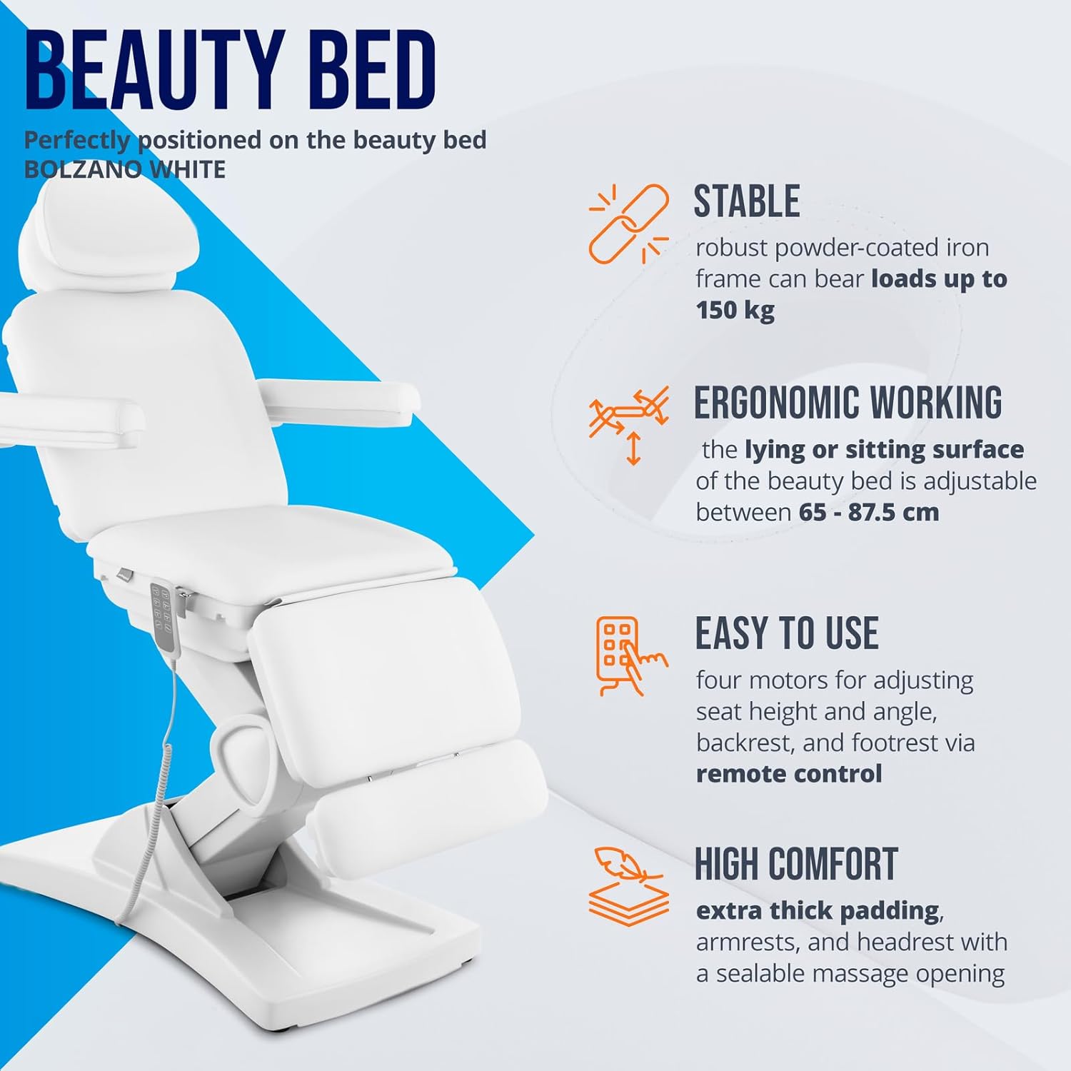 This adjustable motor, featuring height-adjustable seat, chair, backrest, and footrest, makes it ideal for beauty salons, massage parlors, wellness centers, and tattoo parlors. Soft synthetic leather and an ergonomic design ensure unparalleled comfort. The robust construction supports a maximum weight of 150 kg. It comes with a 3.5-meter extra-long power cord. The headrest opening can be closed to ensure comfort even when reclining. Armrests further enhance comfort; they are fully removable and can be raised when needed. The headrest is telescopic (maximum length 14 cm) and fully removable. Model: PHYSA BOLZANO WHITE; Material: Powder-coated iron, synthetic leather; Color: White; Voltage/Frequency: 230 volts/50 Hz; Power: 350 watts; Maximum weight capacity: 150 kg. Backrest adjustment range: 0 - 70Spend; Footrest adjustment range: 0 - 60Spend; Armrest adjustment range: 0 - 180Spend; Seat adjustment range: 0 - 15Spend; Seat height adjustment range: 65 - 87.5 cm; Power cord length: 3.5 meters; Dimensions (W x D x H): 185.00 x 88.00 x 162.00 cm; Weight: 82.40 kg; Scope of delivery: PHYSA BOLZANO white beauty chair, remote control, installation accessories, user manual.