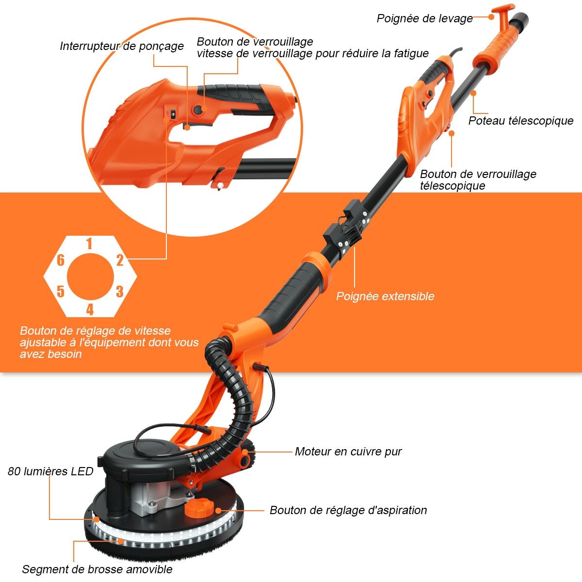 Our drywall sander is the ideal tool for sanding walls and ceilings. It features an automatic dust removal system, providing a dust-free working environment even without a vacuum cleaner. A powerful 750W copper-core motor with 6 speed settings helps you sand walls efficiently. No need to worry about corners or working at heights. This professional sander features a telescopic handle, reaching up to 165cm, allowing you to easily sand ceilings even while standing on the ground. The sander head has a removable edge at the bottom for easy sanding of corners or vertical walls. Furthermore, the sander is foldable for easy storage. A locking button next to the switch ensures the sander always runs at the set speed. This drywall sander also features an LED light for use in low-light conditions. Included are 12 sheets of sandpaper, 2 carbon brushes, and other accessories, ensuring you have all the tools you need to complete any sanding task. Features: Powerful Motor & 6 Speed ??Settings This electric drywall sander features a powerful 750W motor for efficient wall sanding. Six-speed settings allow for adjustable speeds from 800 to 1750 RPM, optimizing sanding efficiency for different situations. An automatic dust removal system collects 99.99% of dust during sanding. A ring of bristles around the head sweeps dust from the wall and collects it below the sander head. Combined with a flexible suction hose and dust bag, it achieves perfect dust removal. A 360Spend rotating sanding disc and LED lighting make sanding corners and vertical walls easy. It also features a dual-color LED light strip, ensuring proper operation even in dimly lit areas. The soft, non-glaring light won't harm your eyes even after prolonged use. The retractable handle and ergonomic design allow for easy ceiling sanding even while standing on the floor. Lightweight and easy to use, it's time-saving and labor-saving, making it ideal for sanding walls during home construction. Abundant Accessories: This professional polisher comes with 12 sandpaper discs, a hose, a dust bag, 2 carbon brushes, 4 washers, a hex wrench, and a carrying bag, ensuring you have all the tools you need to complete any sanding task. It's ideal for sanding interior walls, ceilings, exterior walls, hallways, and more. Product Features: A powerful 750W pure copper motor provides strong performance. 6-speed settings, with a speed range from 800 to 1750 RPM. An automatic dust removal system with a dust bag and hose creates a dust-free working environment. The removable sandpaper discs allow for easy sanding of edges or vertical walls. The multi-directional sanding head allows for flexible sanding. LED lights around the base help you work in the dark. The retractable handle allows for easy sanding of ceilings and other high surfaces. The ergonomic handle provides a comfortable grip. The foldable design facilitates storage and transport. A locking button allows you to release the switch while the machine is running. The product includes 12 sheets of sandpaper, a dust bag, 2 carbon brushes, a carrying bag, and other accessories. Specifications Color: Orange + Black Material: Aluminum + Nylon Net Weight: 5.4kg Gross Weight: 6.28kg Rated Voltage: 220-240V Frequency: 50-60Hz Rated Power: 750W No-load Speed: 800-1750rpm Sandpaper Disc Diameter: 225mm Overall Dimensions: 25 x 15.5 x (140-165) cm (Length x Width x Height) Package Contents: 1 x Wall Sander 12 x Sandpaper Discs (80, 100, 120, 150, 180, 240 grit) 2 x Carbon Brushes 4 x Washers 1 x Vacuum Hose 1 x Dust Bag 1 x Allen Wrench 1 x Handbag 1 x Instruction Manual