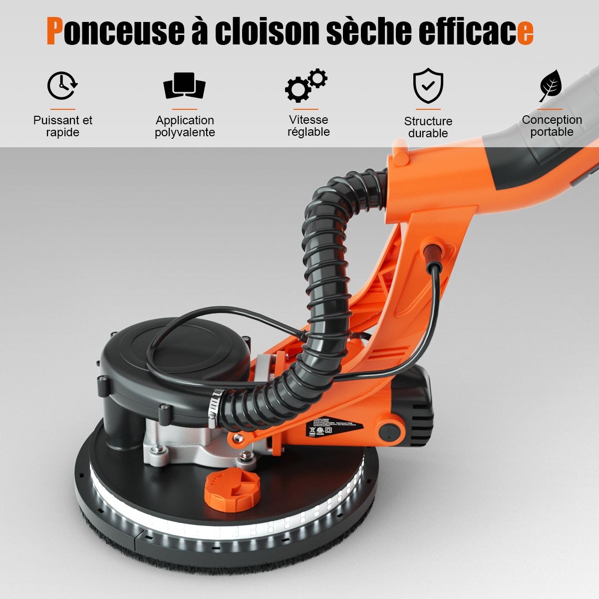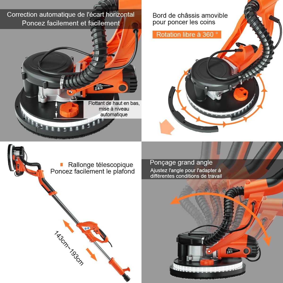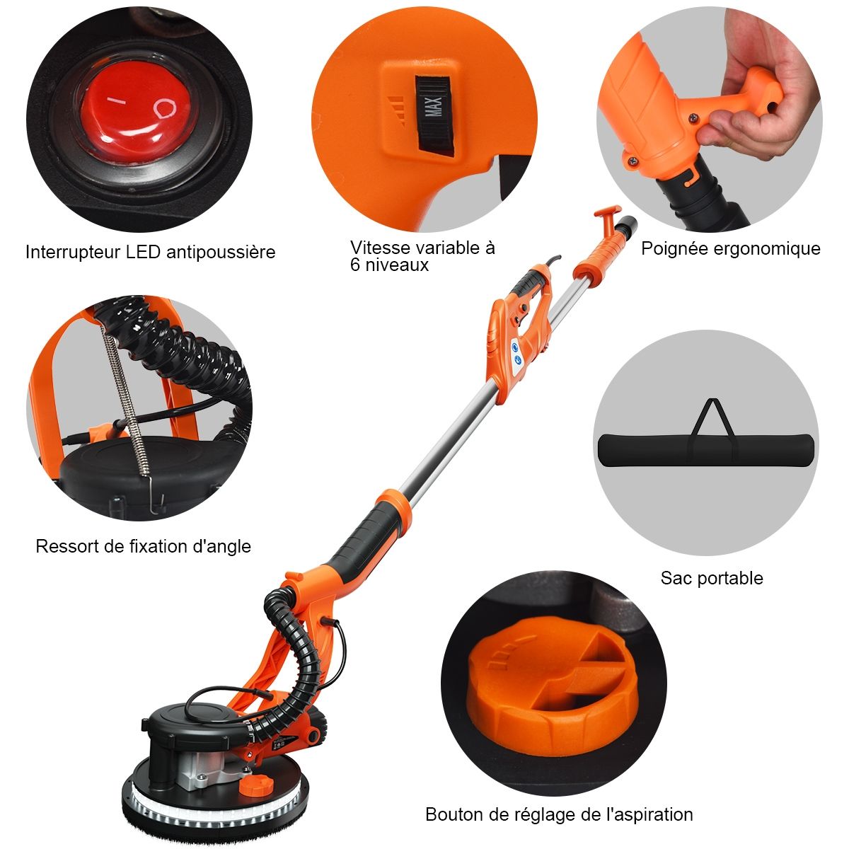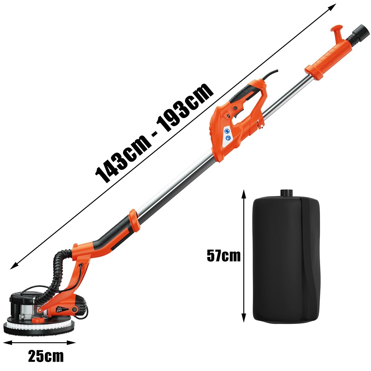 Our innovative 750W drywall sander is designed specifically for sanding walls and ceilings! This sander features an automatic dust removal system, quickly sanding rough, uneven walls and providing a dust-free working environment. Powered by a high-efficiency motor with 6 speed settings, it delivers powerful performance, easily sanding drywall, ceilings, and interior and exterior walls. The sanding head is adjustable to various angles to meet your needs. You can also use a spring-locked angle. Furthermore, the LED light on the sanding head makes working in dimly lit areas easier. Product Features: Automatic Dust Removal System: This drywall sander features an automatic dust removal system that absorbs 99.99% of dust while sanding walls, keeping the surface clean without a vacuum cleaner. Combined with a hose and dust bag, it achieves perfect dust removal. Adjustable Speed ??and Angle: The 6-speed settings allow for easy adjustment to suit the surface condition, with a speed range from 800 rpm to 1750 rpm. Additionally, the sanding pad can rotate in multiple directions, always maintaining close contact with the wall. A spring-locked angle makes sanding ceilings convenient. LED Lights and Removable Edges: This drywall sander features 80 high-brightness LEDs around the bottom of the sanding pad, enhancing illumination in dimly lit work areas. Additionally, the frame edges are removable for easy sanding of corners and vertical walls. Telescopic Handle and 12 Sandpaper Discs: This sander comes with a telescopic handle, allowing for easy sanding of ceilings even while standing on the ground. It also includes 12 different grit round sandpaper discs to meet your various needs. A 750W Cooper motor ensures efficient and reliable power output. This drywall sander automatically corrects for leveling deviations, making sanding a breeze. Features: Equipped with an angle-adjustable spring, detachable frame edges (for sanding corners), rotating head (adjustable to different angles), round brush head (for efficient dust removal), telescopic pole (for sanding ceilings or other high surfaces), powerful 750W motor, automatic dust removal system with dust bag and hose, ultra-durable construction (robust and durable), 6-speed settings (800 to 1750 rpm), automatic horizontal offset correction (improves sanding efficiency), LED lights around the base (for convenient work in the dark), 12 different grit round sandpaper discs (2 each of 80, 100, 120, 150, 180, and 240 grit), and an ergonomic handle (comfortable grip for easy ceiling sanding). Specifications: Frequency: 50Hz; Weight: Gross weight: 6.48kg; Color: Orange + Black; Length: 143-193cm; Rated power: 750W; Material: Aluminum + Nylon; Sanding disc diameter: 250mm; Rated voltage: 220-240V; No-load speed: 800-1750rpm; Package includes: 1 x Dryboard Sander; 12 x Sandpaper; 1 x Hose; 1 x Vacuum Cleaner Bag; 1 x Hand Bag; 1 x Hex Wrench; 1 x Spring; 2 x Carbon Fiber Brushes; 4 x Black Sealing Rings; 4 x Washers; 2 x Screws; 1 x Instruction Manual