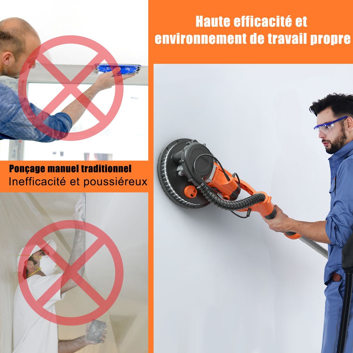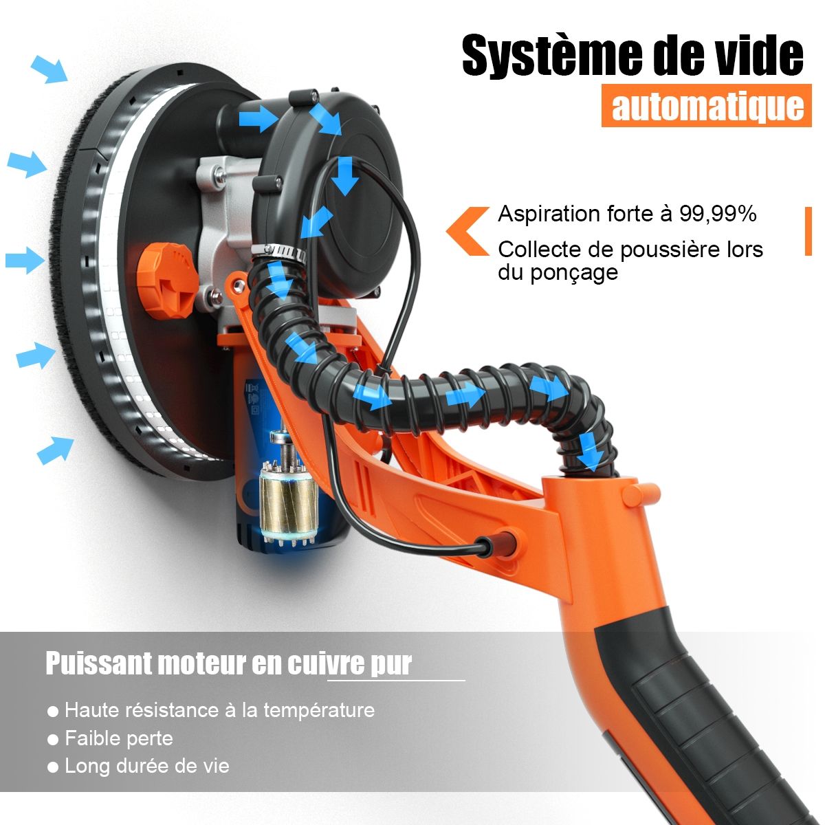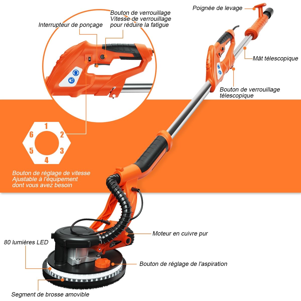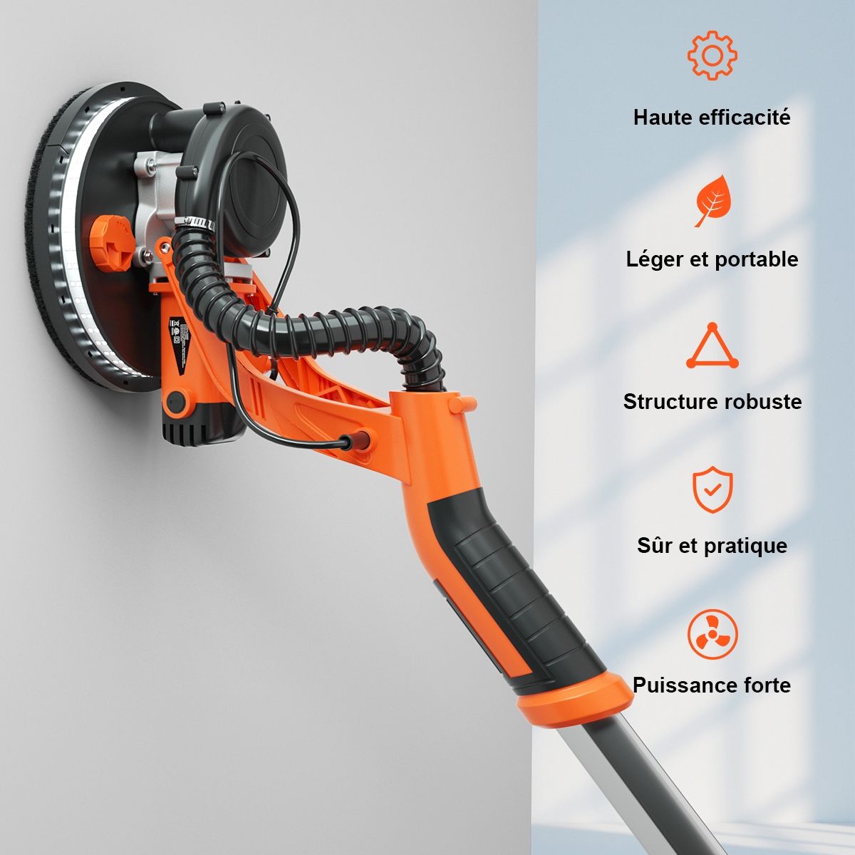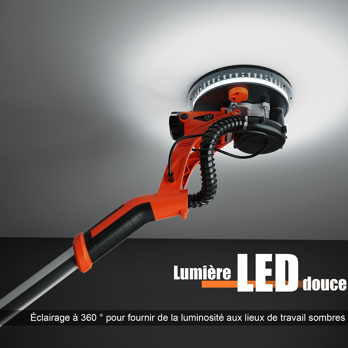 Our innovative 750W drywall sander is designed specifically for sanding walls and ceilings! This sander features an automatic dust removal system, quickly sanding rough, uneven walls and providing a dust-free working environment. Powered by a high-efficiency motor with 6 speed settings, it delivers powerful performance, easily sanding drywall, ceilings, and interior and exterior walls. The sanding head is adjustable to various angles to meet your needs. You can also use a spring-locked angle. Furthermore, the LED light on the sanding head makes working in dimly lit areas easier. Product Features: Automatic Dust Removal System: This drywall sander features an automatic dust removal system that absorbs 99.99% of dust while sanding walls, keeping the surface clean without a vacuum cleaner. Combined with a hose and dust bag, it achieves perfect dust removal. Adjustable Speed ??and Angle: The 6-speed settings allow for easy adjustment to suit the surface condition, with a speed range from 800 rpm to 1750 rpm. Additionally, the sanding pad can rotate in multiple directions, always maintaining close contact with the wall. A spring-locked angle makes sanding ceilings convenient. LED Lights and Removable Edges: This drywall sander features 80 high-brightness LEDs around the bottom of the sanding pad, enhancing illumination in dimly lit work areas. Additionally, the frame edges are removable for easy sanding of corners and vertical walls. Telescopic Handle and 12 Sandpaper Discs: This sander comes with a telescopic handle, allowing for easy sanding of ceilings even while standing on the ground. It also includes 12 different grit round sandpaper discs to meet your various needs. A 750W Cooper motor ensures efficient and reliable power output. This drywall sander automatically corrects for leveling deviations, making sanding a breeze. Features: Equipped with an angle-adjustable spring, detachable frame edges (for sanding corners), rotating head (adjustable to different angles), round brush head (for efficient dust removal), telescopic pole (for sanding ceilings or other high surfaces), powerful 750W motor, automatic dust removal system with dust bag and hose, ultra-durable construction (robust and durable), 6-speed settings (800 to 1750 rpm), automatic horizontal offset correction (improves sanding efficiency), LED lights around the base (for convenient work in the dark), 12 different grit round sandpaper discs (2 each of 80, 100, 120, 150, 180, and 240 grit), and an ergonomic handle (comfortable grip for easy ceiling sanding). Specifications: Frequency: 50Hz; Weight: Gross weight: 6.48kg; Color: Orange + Black; Length: 143-193cm; Rated power: 750W; Material: Aluminum + Nylon; Sanding disc diameter: 250mm; Rated voltage: 220-240V; No-load speed: 800-1750rpm; Package includes: 1 x Dryboard Sander; 12 x Sandpaper; 1 x Hose; 1 x Vacuum Cleaner Bag; 1 x Hand Bag; 1 x Hex Wrench; 1 x Spring; 2 x Carbon Fiber Brushes; 4 x Black Sealing Rings; 4 x Washers; 2 x Screws; 1 x Instruction Manual