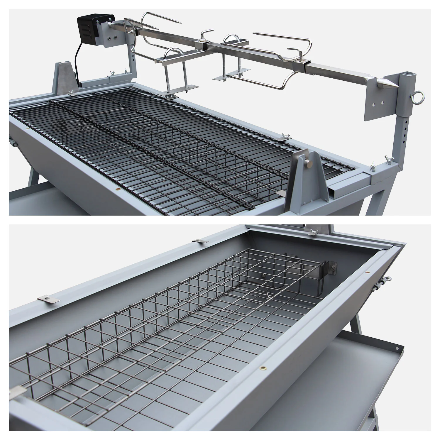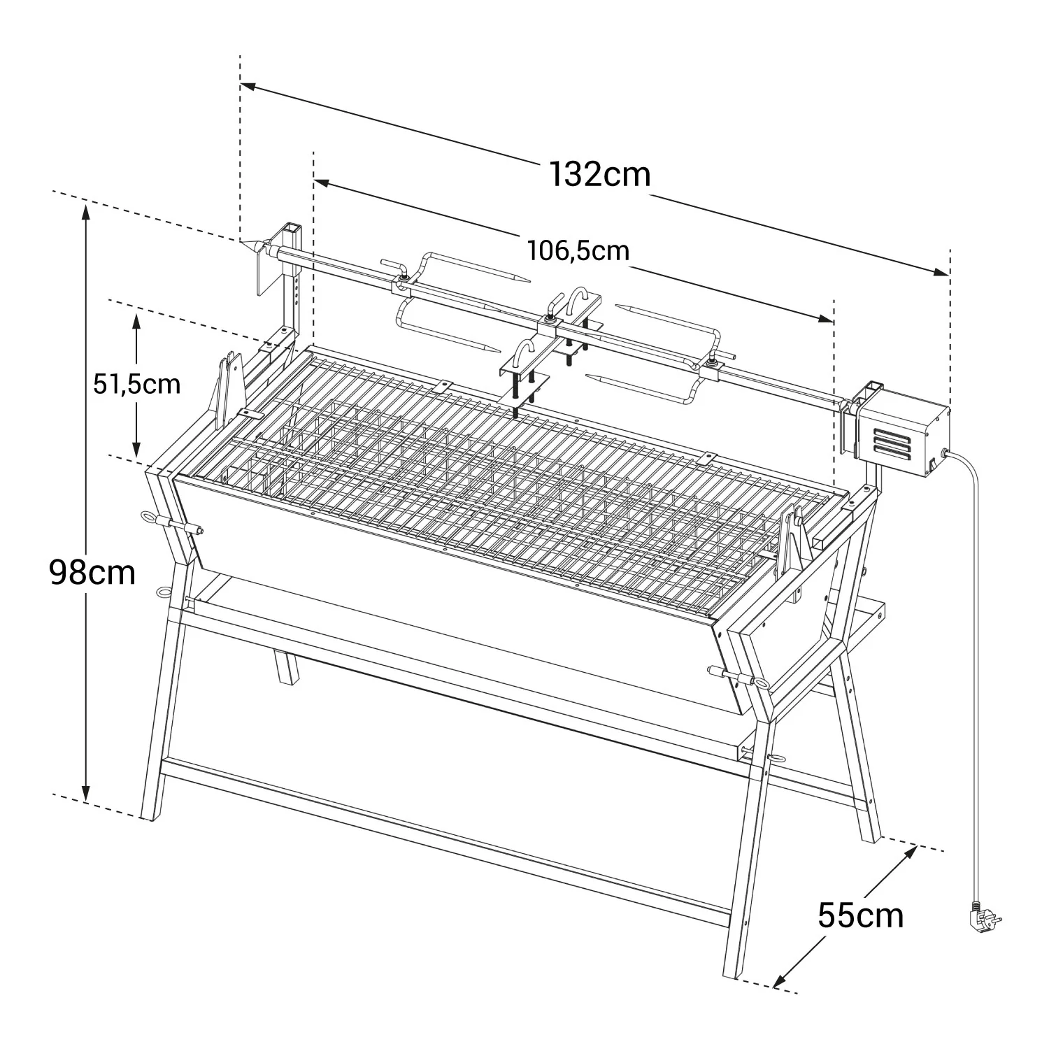 The LISBOA tilting grill is the perfect choice for family gatherings or enjoying delicious barbecues at home! It features a 90Spend tilted cooking chamber that ensures meats are heated evenly for perfect results. A drip tray under the grill forks allows you to easily apply sauces to your grill throughout the meal. This grill is electric, while the barbecue grill uses charcoal. The best part about this grill is its dual-function design: it can be used as both a barbecue grill and a grill. Detailed Information: Dimensions: - Grill rack: 132cm (L) * 55cm (W) * 98cm (H) - Cooking chamber: 106cm (L) * 51cm (W) * 24cm (H) - Cooking surface: 106.5cm (L) * 51.5cm (W) - Cooking height: 58.5cm (H) Material: - Cooking chamber: Painted steel with high-temperature resistant paint - Frame: Painted steel - Grill rack: Stainless steel - Combustion basket: Steel + rust-proof paint Color: - Frame: Gray - Cooking chamber: Gray Optional Configurations: - Number of cooking layers: 1 - 1 rotisserie fork + rotating motor (maximum load 30kg) - 1 grease collection tray - 2 removable cooking racks - 1 rotisserie fork with 2 hooks - Side roasting - 90Spend tilted cooking chamber Other Information: - Standard: NF EN 1860-1 - Assembly required (instructions included) - Warranty: 2 years Delivery: LISBOA Tilting Rotary BBQ Grill includes: 1 grill. Door-to-door delivery to your doorstep or building entrance. Delivered in 2 packages: Package 1: 127 cm (L) * 60.5 cm (W) * 18.5 cm (H) - Gross weight: 27.5 kg / Net weight: 25.3 kg; Package 2: 57 cm (L) * 31.5 cm (W) * 16.5 cm (H) - Gross weight: 8.1 kg / Net weight: 7.3 kg