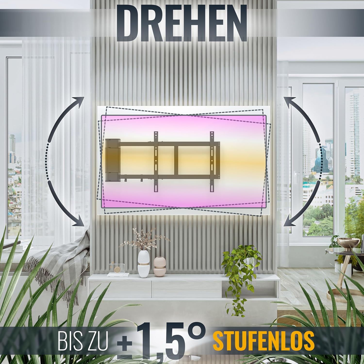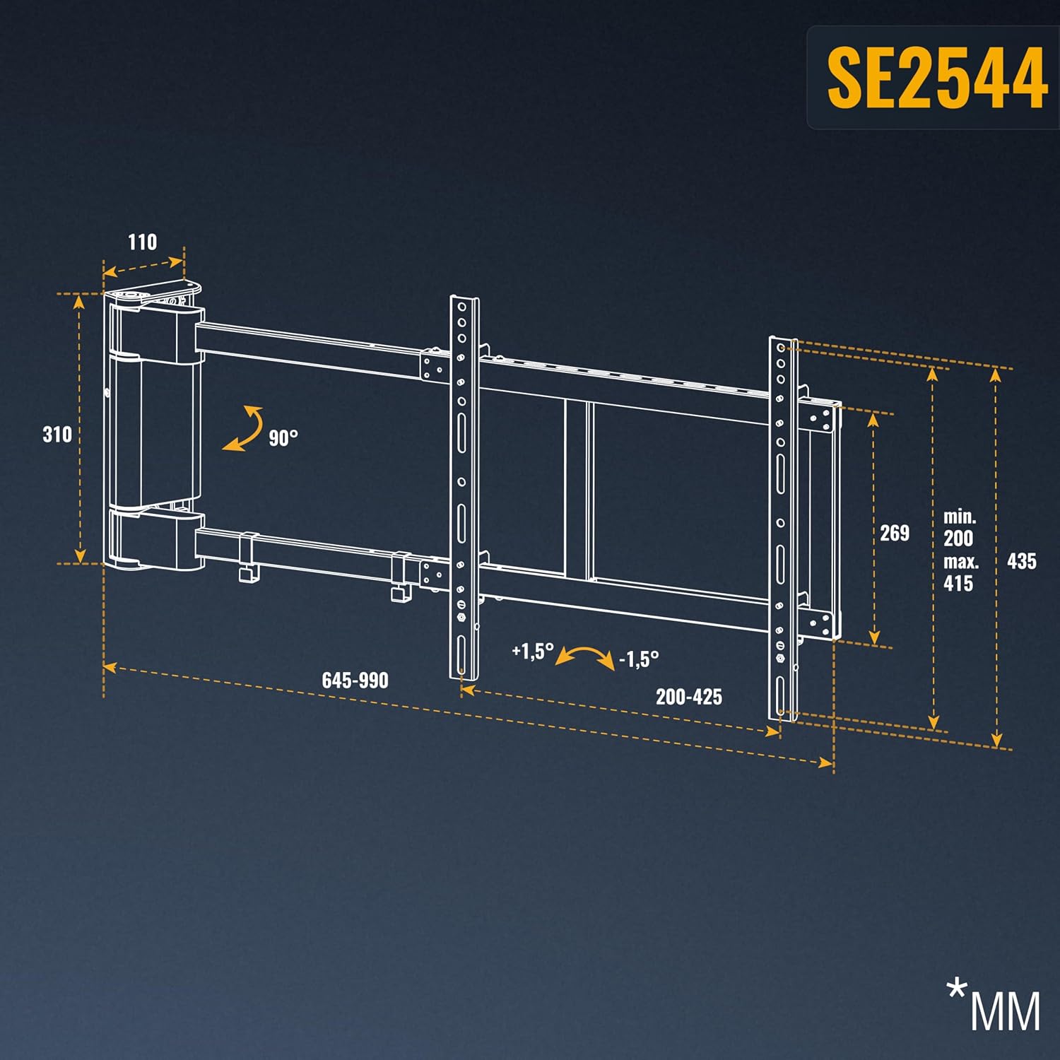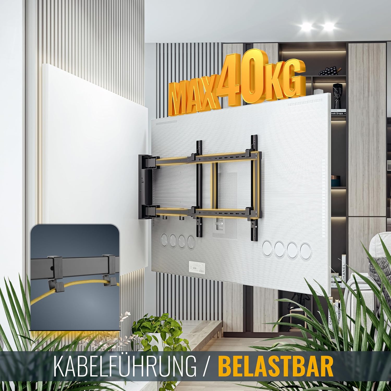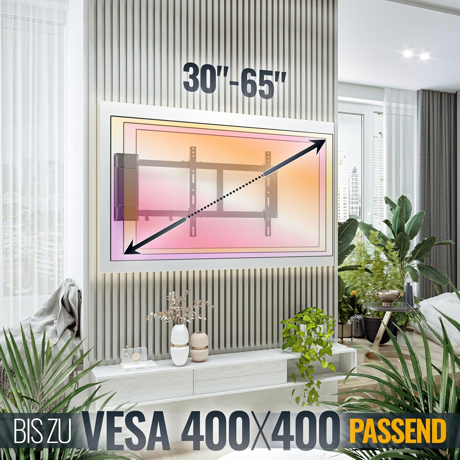 This all-around electronic wall mount bracket is suitable for plasma smart TVs, DVB-T2 satellite TVs, 4K ultra-high-definition TVs, 1080p TVs, and full HD TVs. It boasts strong load-bearing capacity, flexible rotation, and is compatible with various installation methods including flat-screen TVs, desktops, rotating, and height-adjustable mounts. This high-fidelity TV wall mount bracket is suitable for various scenarios such as living rooms, apartments, furniture, and home theaters, and comes with a high-definition cable management clip. Ultra-thin telescopic wall mount bracket - VESA compliant - Hole spacing: 200 x 200, 400 x 200, 400 x 400, 400 x 400, 600 x 400. Height-adjustable rotating hinged platform - Diagonal diameter: 76.2 cm, 81.3 cm, 94 cm, 101.6 cm, 106.7 cm, 109.2 cm, 111.8 cm, 114.3 cm, 116.8 cm, 119.4 cm. Meters, compatible with most mainstream brands, adjustable horizontal angle - 90-degree rotation when screen size is up to 120 cm - Wall spacing: 52 mm - Maximum 1012 mm - Maximum load: 39.9 kg - Empty weight: 8.2 kg - Requires a European standard three-prong plug to British standard three-prong plug adapter. The RICOO motorized TV wall mount brings a relaxed and comfortable viewing experience to your living room. This wall mount is rotatable and electrically adjustable, easily operated with a remote control. Achieve perfect visual effects and create an elegant atmosphere from any viewing angle. Our TV wall mount is adjustable in length to your preference. Whether you want to place the TV close to or far from the wall, our wall mount provides the flexibility and freedom you need. Our easy-to-use bracket is quick and easy to install, allowing you to adjust the TV to your ideal position instantly. Experience ease, comfort, and stability. 1. Adjust viewing angle 2. Practical solution 3. Multi-functional stand 4. Rotating stand 5. Adjustable length 1. VESA mounting holes 2. Measure screen size 3. Connection check Recommended screen diagonal: Approx. 76 cm - 165 cm (30 inches - 65 inches) Supports VESA standards: 200x200 | 200x300 | 200x400 | 300x200 | 300x300 | 300x400 | 400x200 | 400x300 | 400x400 Rotation range: 0Spend to 90Spend Tilting range: None Rotating front panel: None Load capacity: Approx. Net weight: 40 kg; Net weight: 8 kg; Distance from wall: Approx. 50 mm (0Spend position); Special features: Motorized stand with remote control; Wall panel dimensions (width x Height: 11 cm x 31 cm; Material: Cold-rolled steel; Important Note: When choosing a screen bracket, the VESA standard (hole spacing on the TV) is not the deciding factor. This bracket is also suitable for screens with diagonal dimensions smaller or larger than those shown in the product description. Just ensure that the VESA hole spacing is within the bracket's load-bearing range and does not exceed the bracket's maximum load capacity. Scope of Supply: Bracket (pre-assembled), infrared remote control (excluding AAA batteries); Complete installation accessories: washers, gaskets; Includes screw set: screws and expansion bolts for solid concrete walls, TV screws (various lengths).