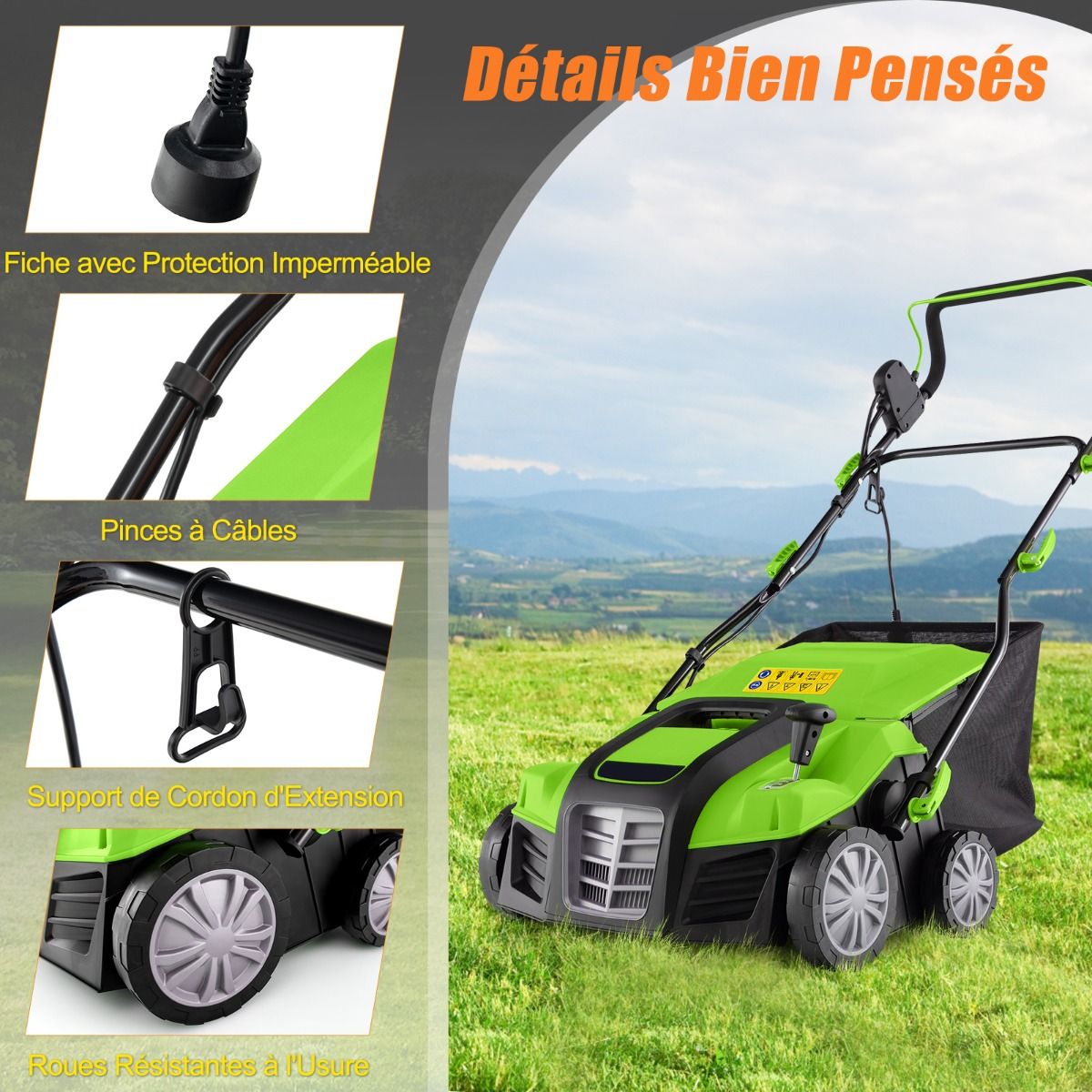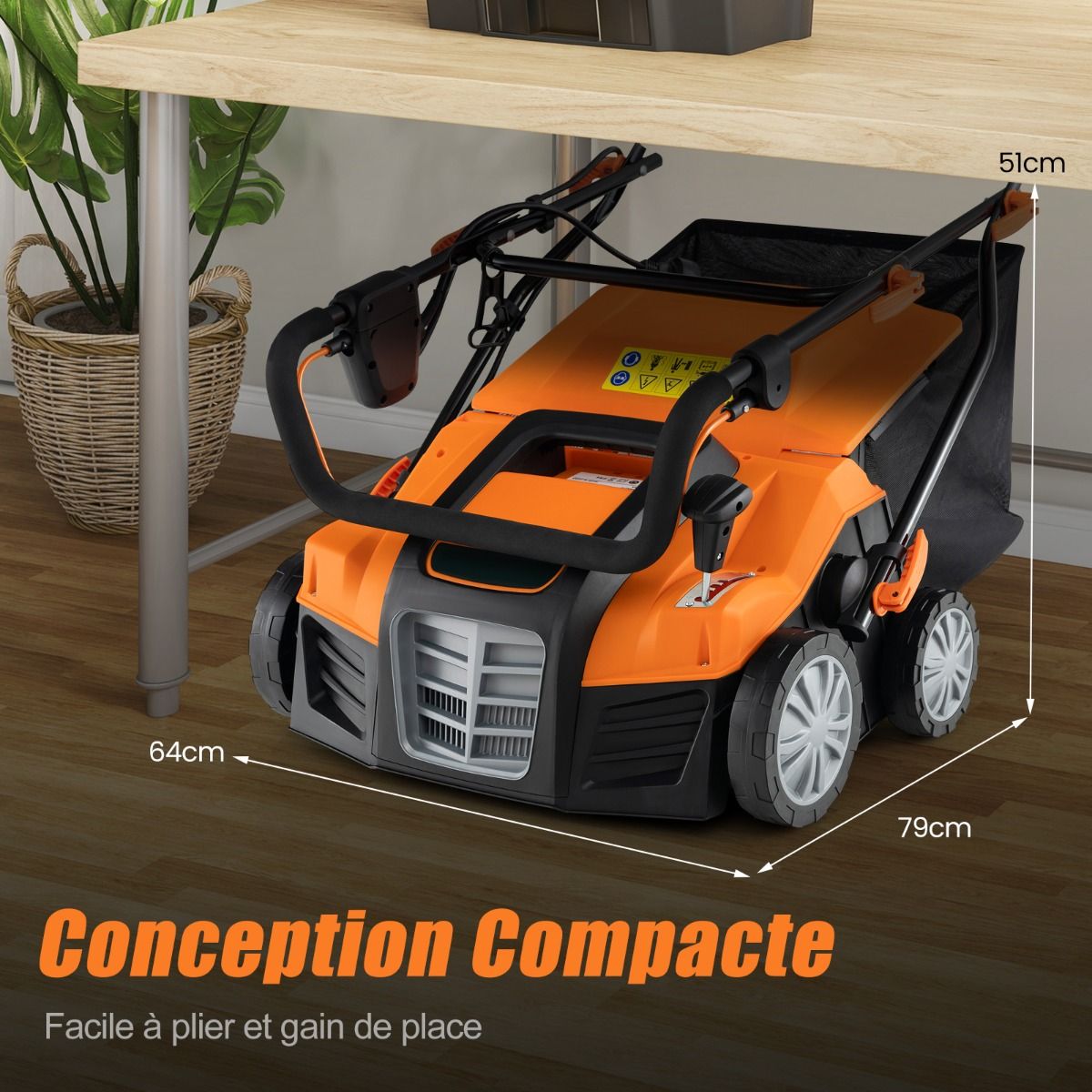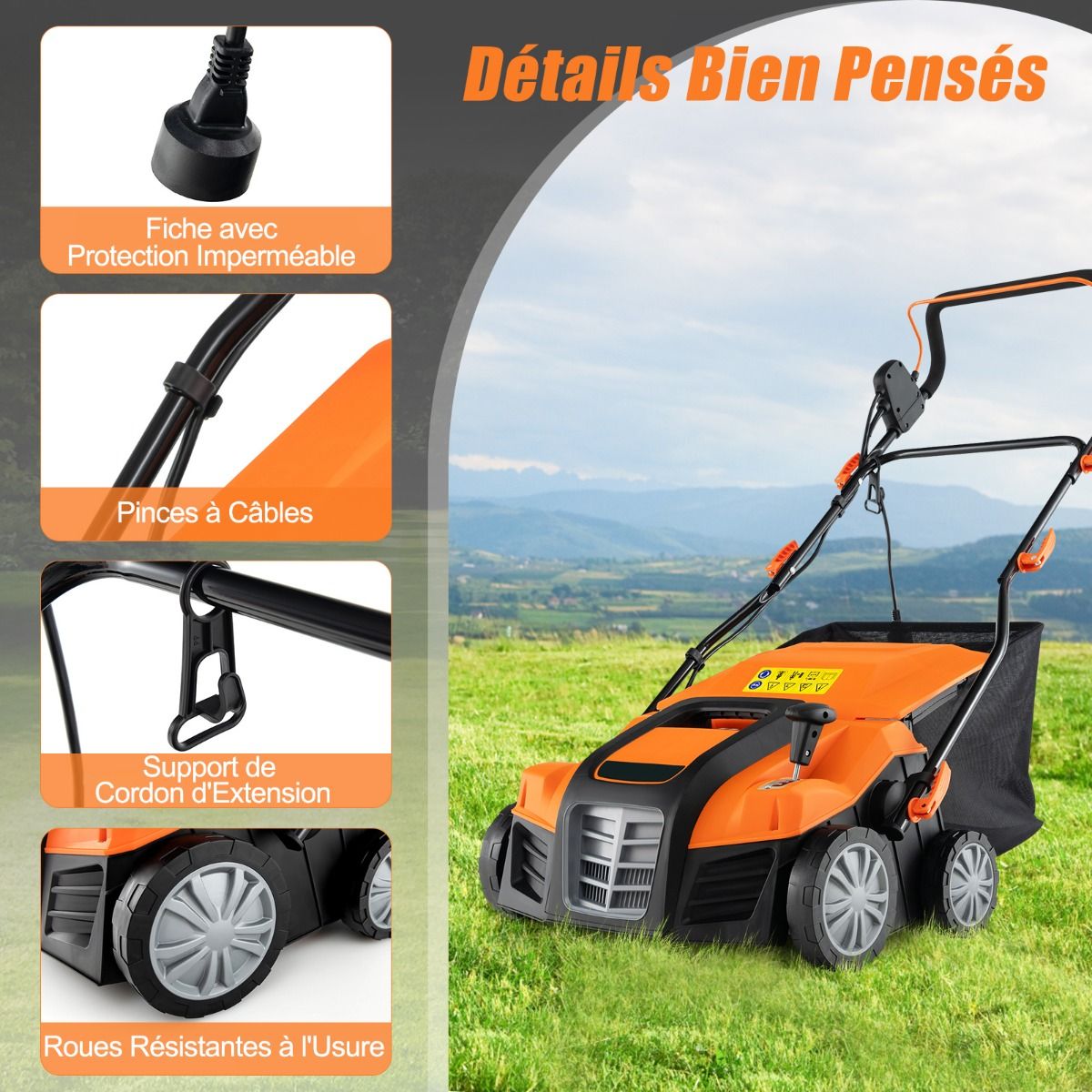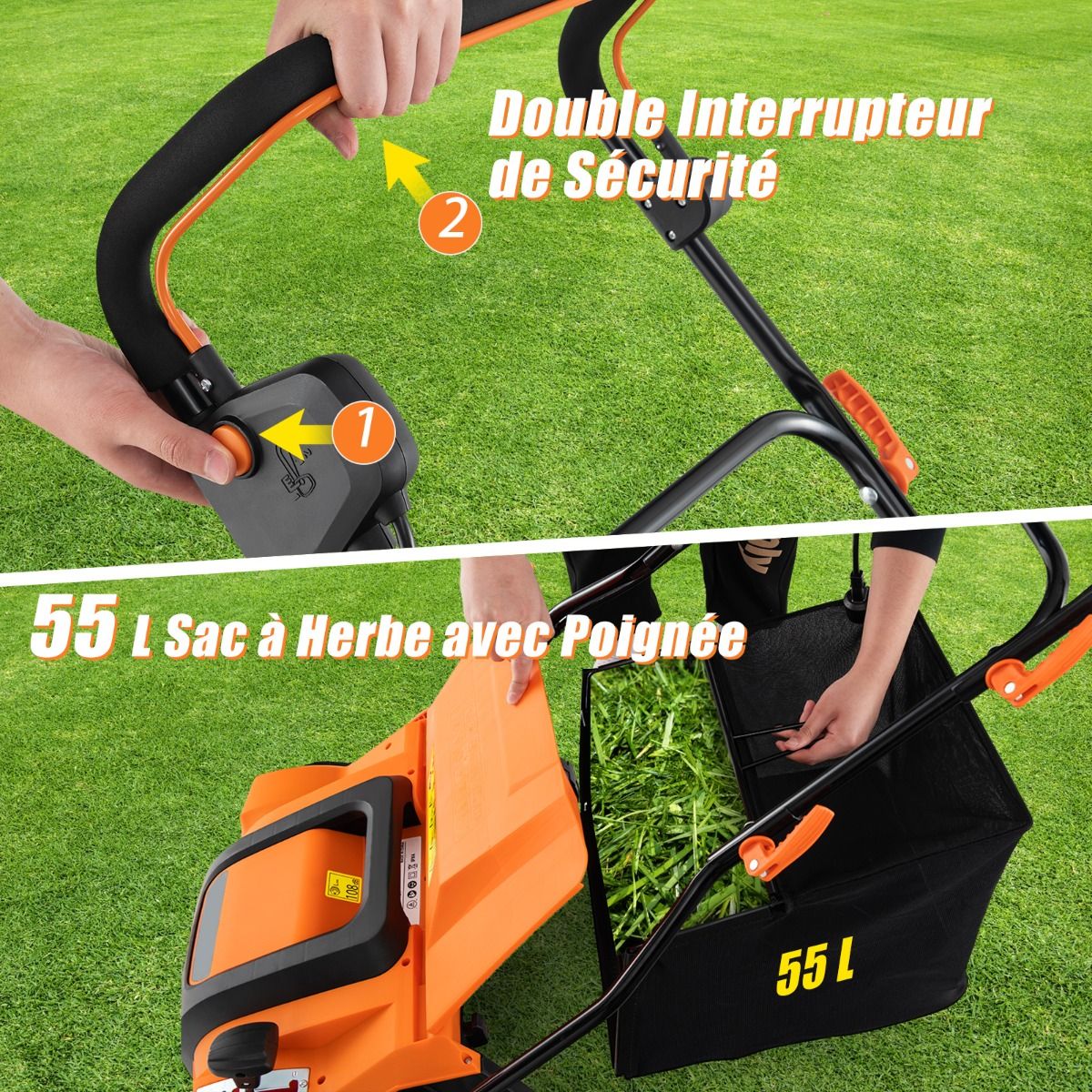 Make lawn care easier with our electric lawn mower and tiller. Its powerful motor and 41cm cutting width save you time and effort. A large-capacity grass bin makes debris removal easy. Equipped with two interchangeable blades, each with 5 depth settings, it precisely removes dead grass or loosens the soil. It features a dual safety switch and a waterproof plug. The foam-wrapped handle is height-adjustable in 3 positions and its foldable design makes it easy to store. Function: A 2-in-1 lawn mower and tiller, equipped with lawn and tiller blades, this foldable push-type machine removes weeds from your lawn. Interchangeable blades are suitable for different uses, offering 5 depth settings to suit various lawn conditions. Wide operating width, powerful performance: This electric lawn mower features a powerful 15A motor with speeds up to 3500 rpm and a cutting width of up to 41cm, effectively improving lawn condition, saving you time and effort while delivering professional-grade mowing results. Safe and Convenient Operation: This lawn mower is designed for safety and ease of use, equipped with a waterproof plug and dual safety switches. Simply press the button and pull the metal handle to start. The three-position height-adjustable handle design is convenient for users of different heights. Large-Capacity Removable Grass Bag: This lawn mower comes with a large 55-liter grass bag, reducing the frequency of emptying and improving work efficiency. Furthermore, the convenient handle design allows you to easily remove the grass bag and empty dead grass and debris. Foldable Design for Easy Storage: This 2-in-1 foldable lawn mower folds down to a compact size, taking up minimal space, making it ideal for keeping your garage tidy and organized. Powerful Span Features: Strong span; 41cm wide working width for high cutting efficiency; 3500rpm powerful motor for high performance; 3 height adjustable settings for users of different heights; Equipped with one weeding blade and one loosening blade for versatility; 5 depth control settings to adapt to various lawn conditions; 55L weed bag with handle, eliminating the need for frequent drainage; Double safety switch and waterproof plug for your safety; Power cord clip and extension cord holder for easy cord management; Wear-resistant PP wheels ensure smooth movement on the lawn; Easy folding for space-saving and convenient storage; Lightweight design and large foam-wrapped handle for easy pushing and pulling. Specifications: h4; Colors: Orange and Black/Green; Material: PP, PE, Polyester, Metal; Product Dimensions (handle at highest position): 109 x 64 x 113 cm (L x W x H); Folded Dimensions: 79 x 64 x 51 cm (L x W x H); Adjustable Height: 113 cm 104 cm 95 cm; Stubble Blade Length: 42 cm Specifications: Stubble blade length: 42 cm; Cutting width: 41 cm; Adjustable cutting depth: 6 mm - 3 mm - 6 mm - 9 mm - 12 mm; Stubble bag capacity: 55 liters; Power cord length: 95 cm x 35 cm; Rated voltage: 220-240 volts; Rated frequency: 50 Hz; Rated current: 15 amps; Motor speed: 3,500 rpm; Motor current: 15 amps; Net weight: 13.5 kg; Package includes: 1 x Electric lawn mower and shredder; 1 x Lawn blade; 1 x Stubble blade; 1 x Stubble bag; 1 x User guide.