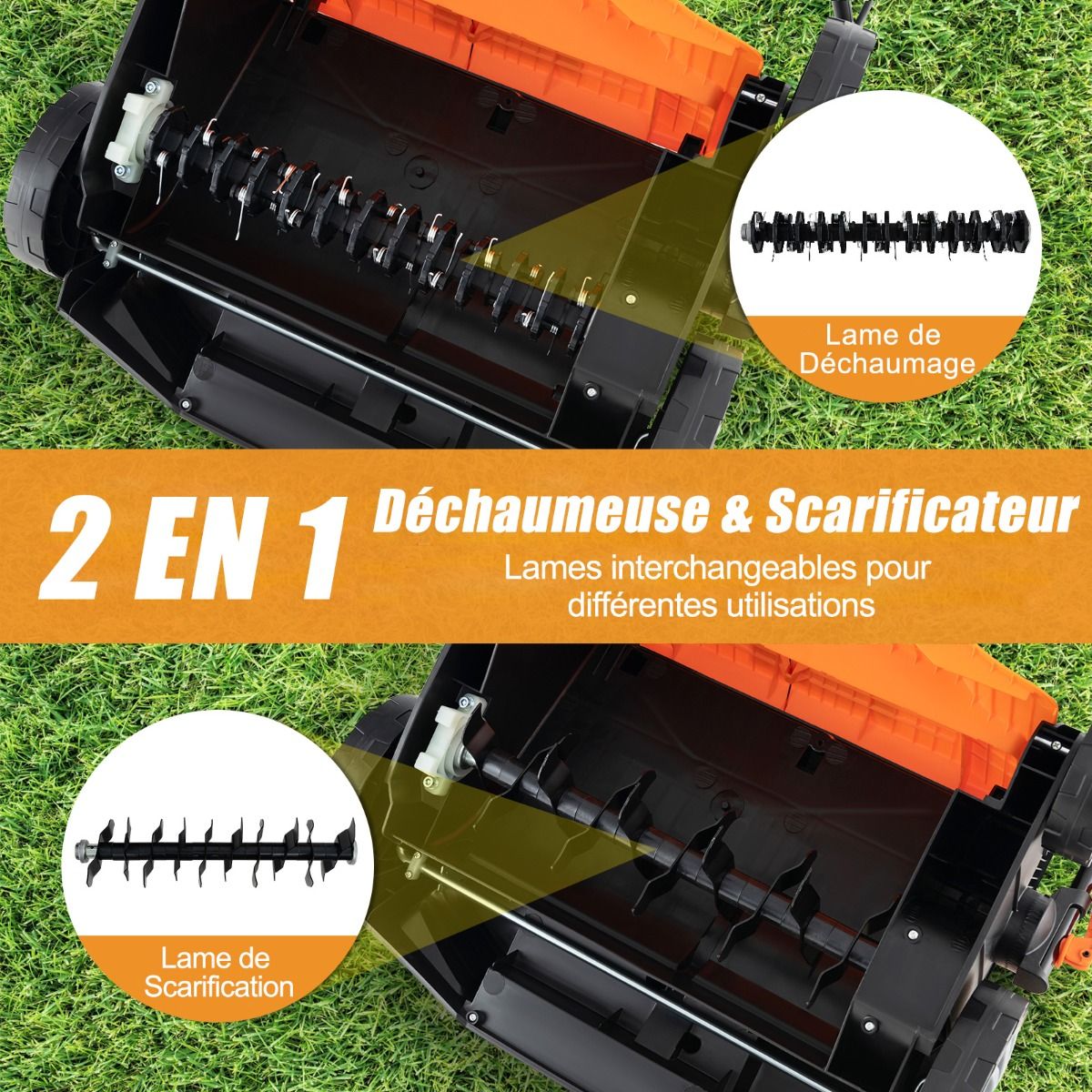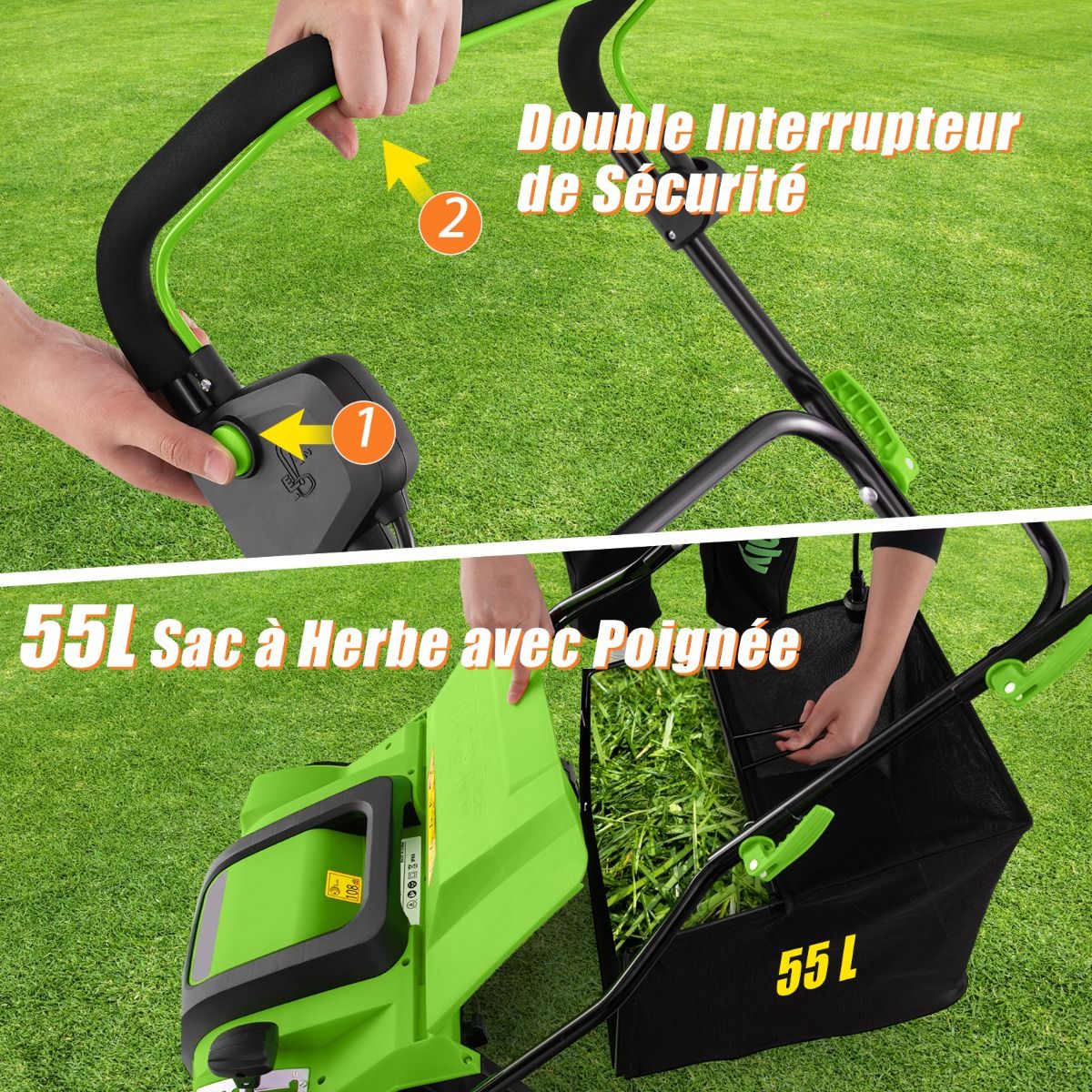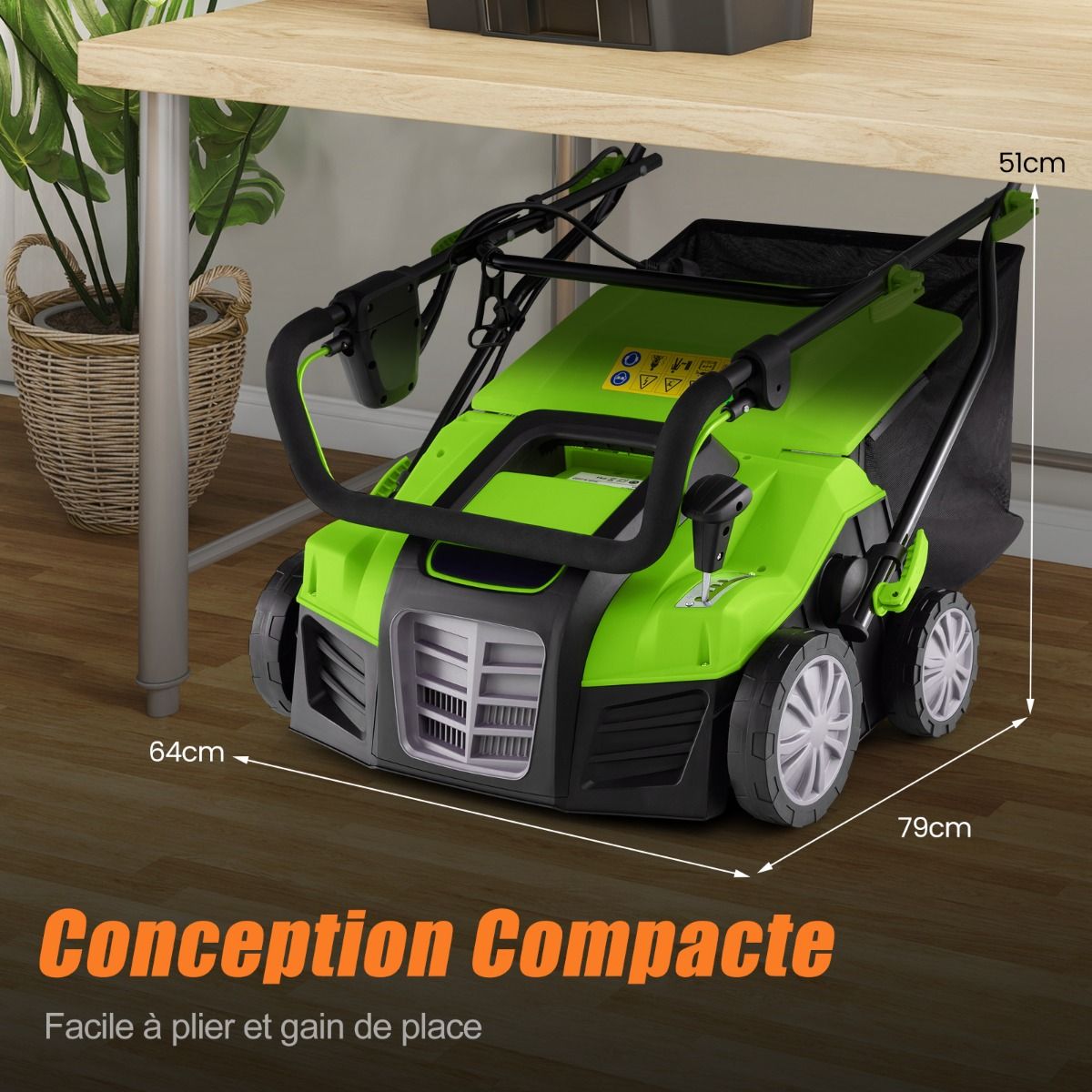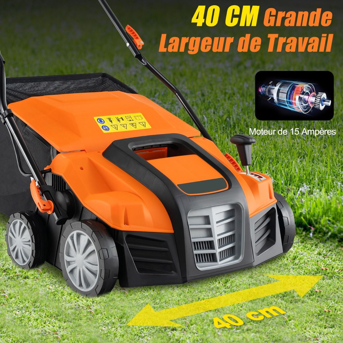 Make lawn care easier with our electric lawn mower and tiller. Its powerful motor and 41cm cutting width save you time and effort. A large-capacity grass bin makes debris removal easy. Equipped with two interchangeable blades, each with 5 depth settings, it precisely removes dead grass or loosens the soil. It features a dual safety switch and a waterproof plug. The foam-wrapped handle is height-adjustable in 3 positions and its foldable design makes it easy to store. Function: A 2-in-1 lawn mower and tiller, equipped with lawn and tiller blades, this foldable push-type machine removes weeds from your lawn. Interchangeable blades are suitable for different uses, offering 5 depth settings to suit various lawn conditions. Wide operating width, powerful performance: This electric lawn mower features a powerful 15A motor with speeds up to 3500 rpm and a cutting width of up to 41cm, effectively improving lawn condition, saving you time and effort while delivering professional-grade mowing results. Safe and Convenient Operation: This lawn mower is designed for safety and ease of use, equipped with a waterproof plug and dual safety switches. Simply press the button and pull the metal handle to start. The three-position height-adjustable handle design is convenient for users of different heights. Large-Capacity Removable Grass Bag: This lawn mower comes with a large 55-liter grass bag, reducing the frequency of emptying and improving work efficiency. Furthermore, the convenient handle design allows you to easily remove the grass bag and empty dead grass and debris. Foldable Design for Easy Storage: This 2-in-1 foldable lawn mower folds down to a compact size, taking up minimal space, making it ideal for keeping your garage tidy and organized. Powerful Span Features: Strong span; 41cm wide working width for high cutting efficiency; 3500rpm powerful motor for high performance; 3 height adjustable settings for users of different heights; Equipped with one weeding blade and one loosening blade for versatility; 5 depth control settings to adapt to various lawn conditions; 55L weed bag with handle, eliminating the need for frequent drainage; Double safety switch and waterproof plug for your safety; Power cord clip and extension cord holder for easy cord management; Wear-resistant PP wheels ensure smooth movement on the lawn; Easy folding for space-saving and convenient storage; Lightweight design and large foam-wrapped handle for easy pushing and pulling. Specifications: h4; Colors: Orange and Black/Green; Material: PP, PE, Polyester, Metal; Product Dimensions (handle at highest position): 109 x 64 x 113 cm (L x W x H); Folded Dimensions: 79 x 64 x 51 cm (L x W x H); Adjustable Height: 113 cm 104 cm 95 cm; Stubble Blade Length: 42 cm Specifications: Stubble blade length: 42 cm; Cutting width: 41 cm; Adjustable cutting depth: 6 mm - 3 mm - 6 mm - 9 mm - 12 mm; Stubble bag capacity: 55 liters; Power cord length: 95 cm x 35 cm; Rated voltage: 220-240 volts; Rated frequency: 50 Hz; Rated current: 15 amps; Motor speed: 3,500 rpm; Motor current: 15 amps; Net weight: 13.5 kg; Package includes: 1 x Electric lawn mower and shredder; 1 x Lawn blade; 1 x Stubble blade; 1 x Stubble bag; 1 x User guide.