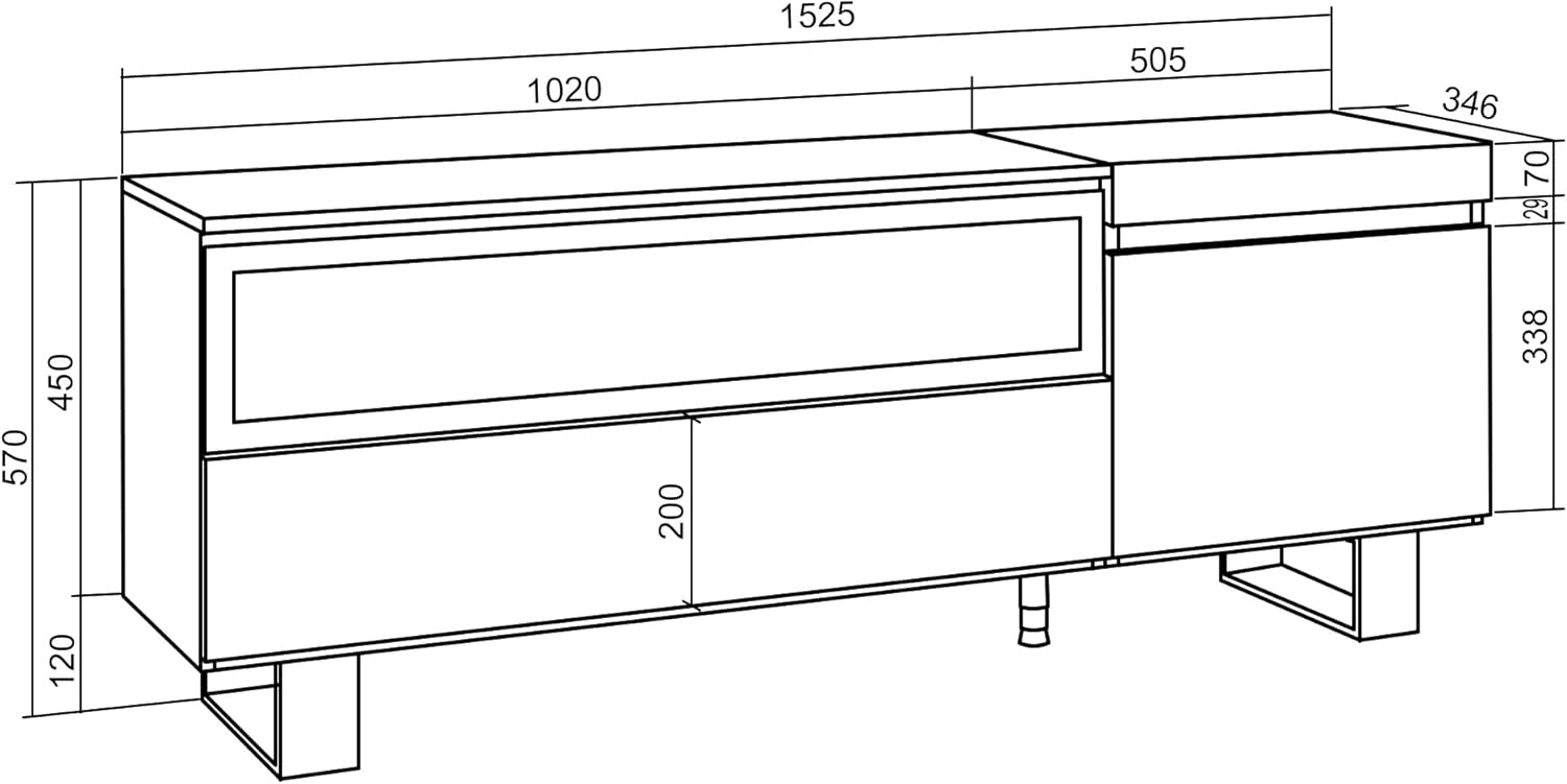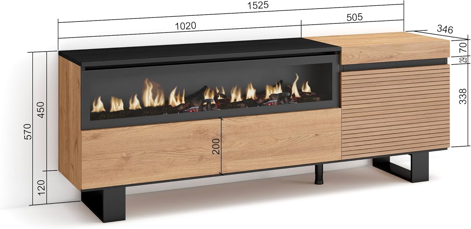 LED Electric Fireplace. Dimensions: 102 cm wide, 21 cm high. Realistic 3D flame effect. No burns due to the absence of a heat source. Power: 34 watts. Comes with a remote control and three adjustable brightness levels. Industrial-style metal legs. Dimensions: 12 cm high, 8 cm wide, 33 cm deep. Black. TV cabinet with storage space for your electronic devices and pull-down doors. Module dimensions: 102 cm wide, 45 cm high, 35 cm deep. Oak and black finish showcasing high-quality porous wood grain. TV cabinet with doors, offering ample storage space. Module dimensions: 51 cm wide, 45 cm high, 35 cm deep. Oak and black finish showcasing high-quality porous wood grain. Easy assembly: Skraut Home furniture is easy to assemble and comes with clear and detailed instructions. Enjoy your new furniture quickly without special tools. The electric fireplace is powered by a power outlet and requires no batteries. The remote control requires batteries but is not included. Product Description: LED Electric Fireplace. Dimensions: 102 cm wide, 21 cm high. Realistic 3D flame effect. No burns due to the absence of a heat source. Power: 34 watts. Includes remote control and 3-level brightness adjustment. Industrial-style metal legs. Dimensions: 12 cm high, 8 cm wide, 33 cm deep. Black. TV cabinet with storage space for your electronic devices and features pull-down doors. Module dimensions: 102 cm wide, 45 cm deep. 35 cm high, 35 cm deep. Oak and black finish with high-quality porous wood grain. TV cabinet with doors, offering ample storage space. Module dimensions: 51 cm wide, 45 cm high, 35 cm deep. Oak and black finish with high-quality porous wood grain.