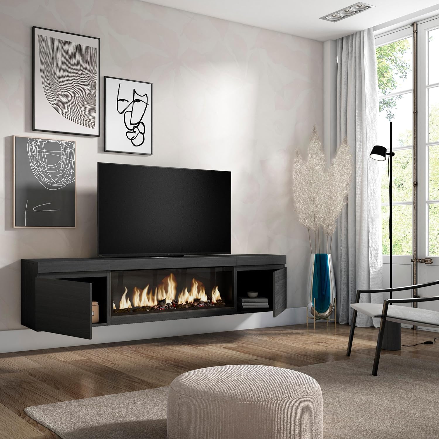 Skraut Home | TV Stand | TV Bench | Large Storage Space | 210 | for TVs up to 80" | XXL Electric Fireplace | Wall-Mounted | Modern Style | Black