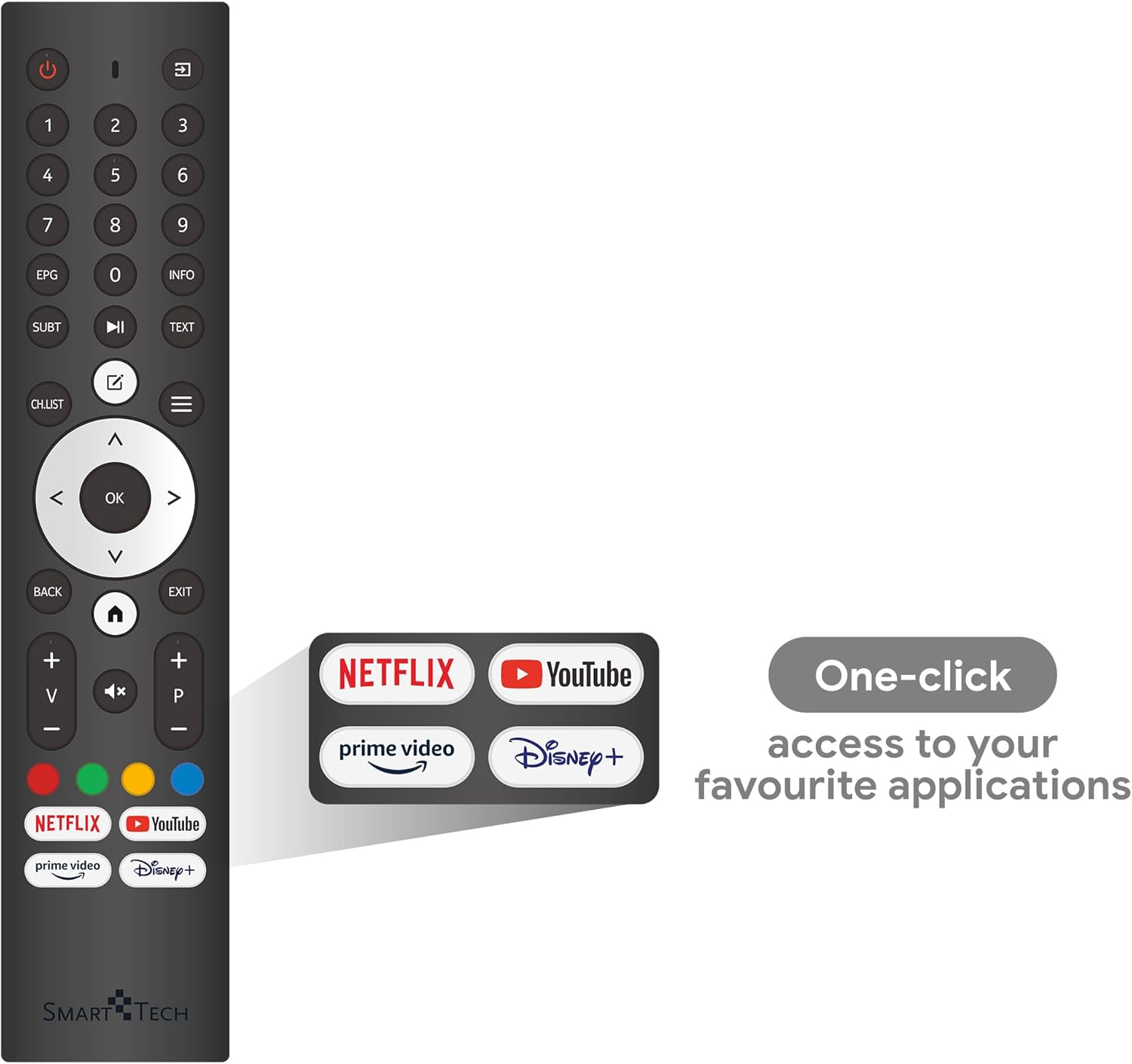 Vidaa Smart TV. Access to Netflix, YouTube, Prime Video, Disney+, Molotov, and more. Full HD resolution: 1920*1080. Hotel mode; wall mount: VESA 200*200. Supports Chromecast and Dolby audio. Equipped with Wi-Fi, Bluetooth, 2 USB ports, 3 HDMI ports, and a 3.5mm headphone jack. The Smart Tech 40FV02V TV will immerse you in a stunning entertainment experience. This TV boasts exceptional Full HD picture quality, delivering incredibly sharp images and vibrant colors, making every frame lifelike. With its integrated smart TV features, you can easily browse a vast library of content. Instantly access your favorite streaming apps, thousands of movies and TV shows, and a variety of online TV channels to create a personalized entertainment experience. The Smart Tech 40FV02V TV features a 40-inch screen, allowing you to fully immerse yourself in your favorite entertainment content, whether you're watching movies with your family, playing exciting video games, or following your favorite TV shows. Built-in Bluetooth technology lets you enjoy wireless connectivity with ease. Instantly connect to compatible devices to stream music, videos, and other exciting content directly to your screen. The Smart Tech 40FV02V TV combines superior performance with elegant design, blending seamlessly into any home decor. Its stylish design and ultra-narrow bezel add a modern touch to your home. The Smart Tech 40FV02V TV ensures you don't miss a single detail, providing an unforgettable entertainment experience. Redefining the way you watch TV! 40-inch (101 cm) Smart TV; Vidaa; Hotel Mode; Central Stand; 2 USB Ports; 3 HDMI Ports; 3.5 mm Headphone Jack; Full HD Resolution: 1920*1080.