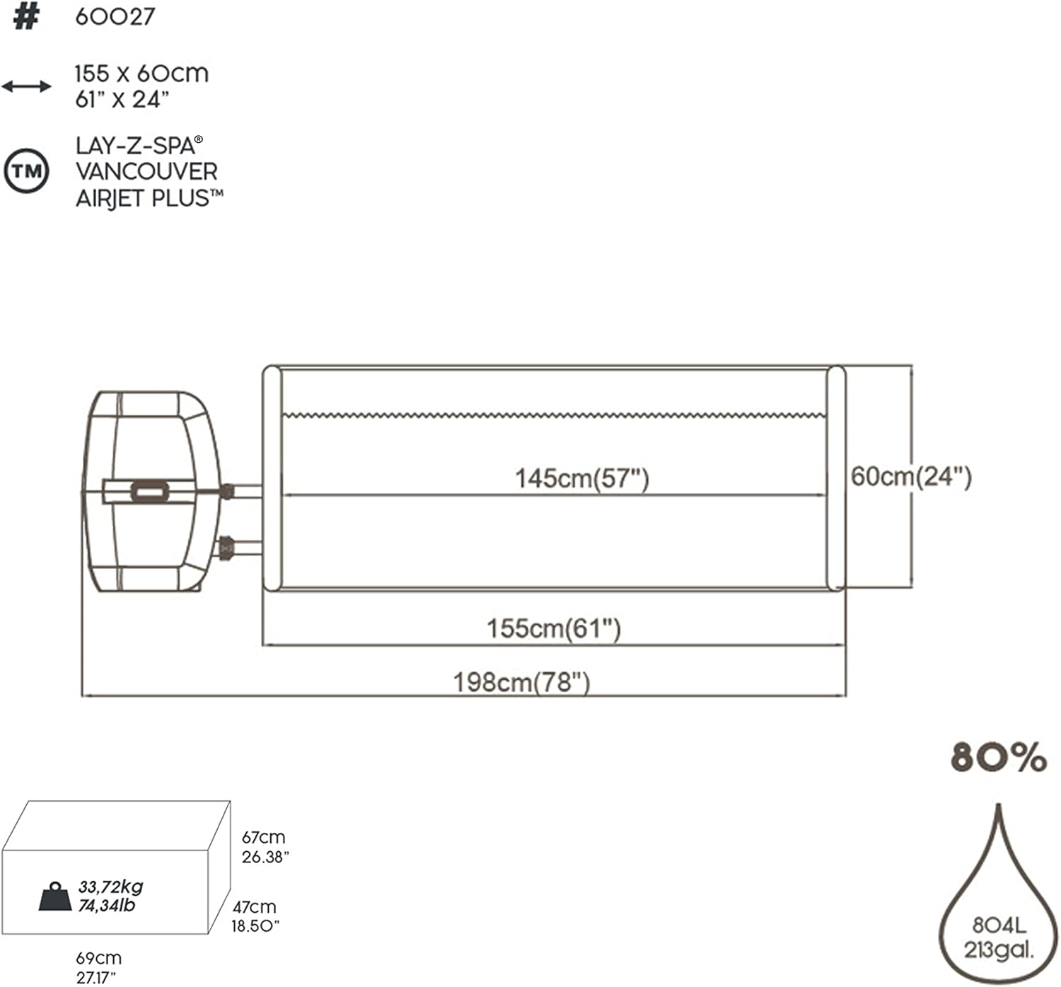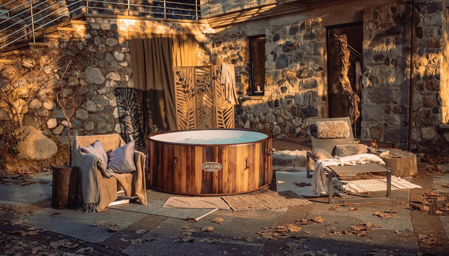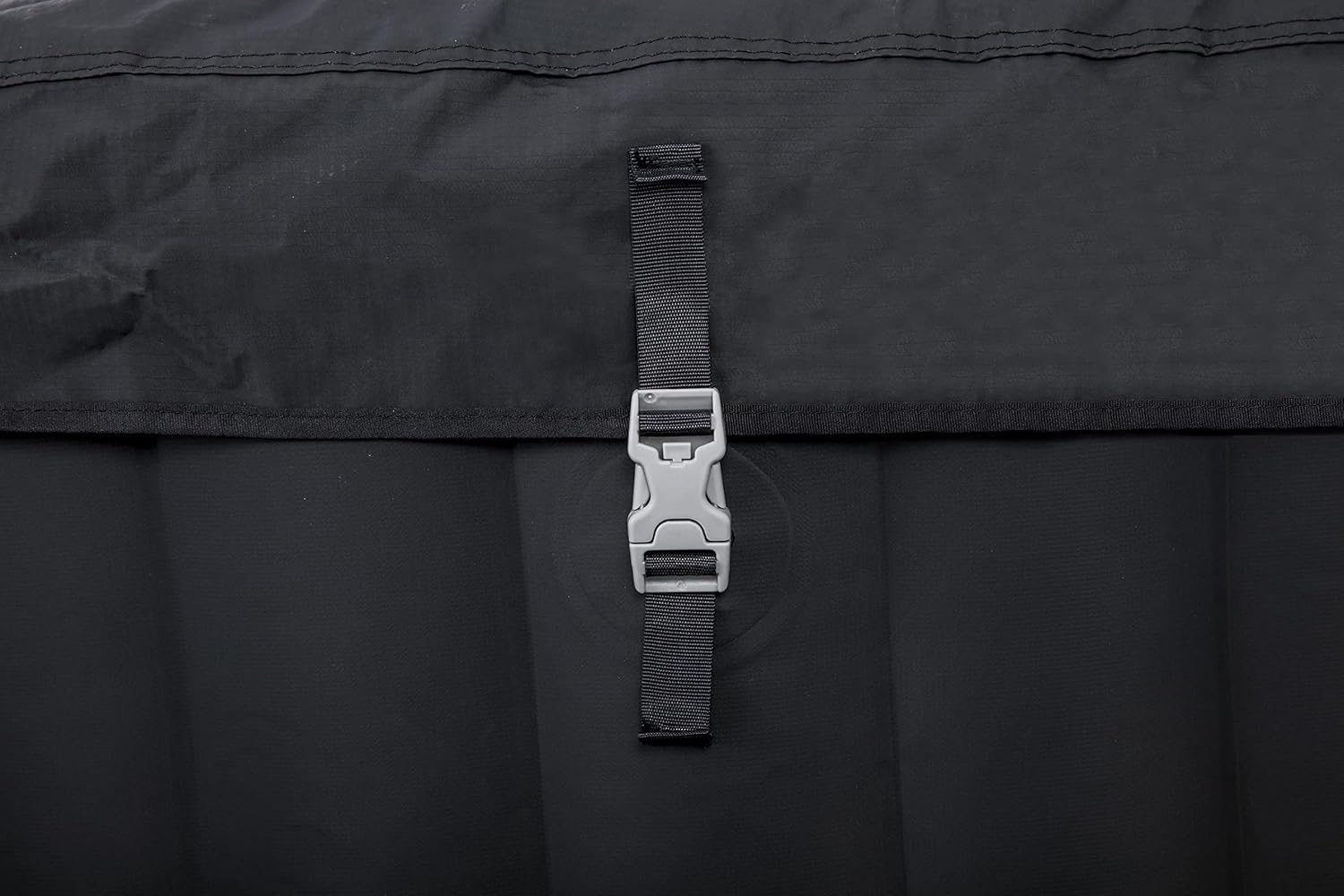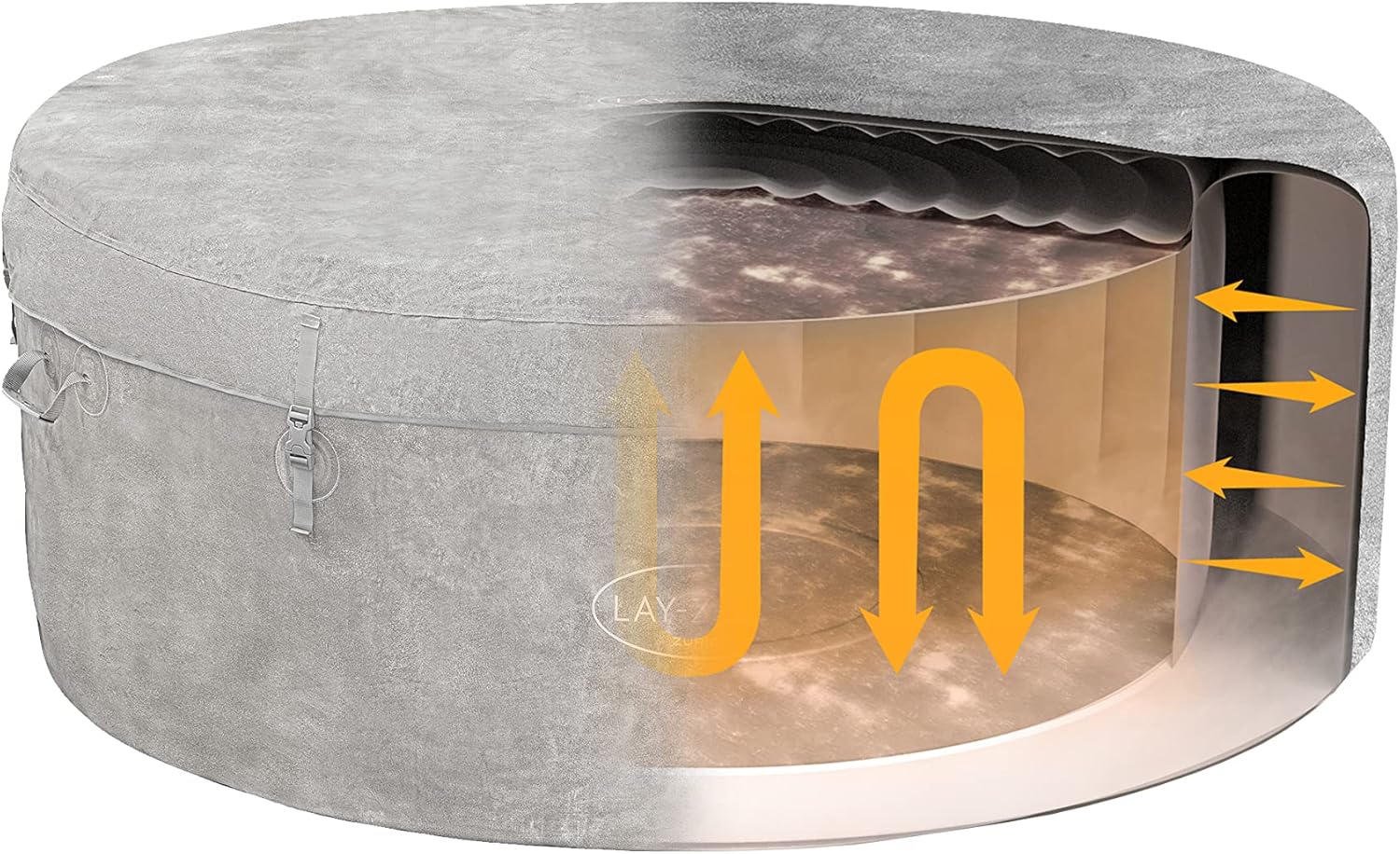 About this item: Massage System: Its 120 AirJets release warm air into the water, enveloping you in a soothing, bubbling bath: a true relaxation session. Technologies: The DuraPlus material undergoes rigorous testing to ensure superior durability and maintains its shape regardless of the number of inflations and deflations. Freeze Shield System: The Freeze Shield automatic heating function protects the pump and liner from frost damage. ChemConnect Dispenser: The ChemConnect automatic chlorine dispenser maintains a stable chlorine level and ensures even distribution. Contents: 1 spa, 1 insulating cover, 1 spa pump, 1 filter cartridge (VI), 1 ChemConnect dispenser, 1 repair patch. The Lay-Z-Spa Rejuvenating Massage System offers an affordable, convenient, and easy-to-install spa experience for total relaxation. With its various massage technologies, the Lay-Z-Spa is the best way to relax and recharge, right at home. DuraPlus Technology is a reinforced material composed of two layers of laminated PVC and a polyester mesh. This material undergoes rigorous testing to guarantee superior durability. The robust structure of our spas is designed to ensure structural stability while maintaining a soft and comfortable surface. Your spa will retain its shape no matter how many times it's inflated and deflated. Our touch-sensitive filtration pump combines design and functionality. It inflates the spa, heats the water up to 40Spend, filters the water to maintain maximum cleanliness, and activates the massage system. A touch control panel connected to the pump allows you to manage all spa functions while comfortably seated inside. The pump also includes cup holders and a convenient flat storage compartment. Our innovative Freeze Shield system lets you enjoy your spa year-round. This automatic heating system prevents the water from freezing by activating at 6Spend and deactivating at 10Spend. Freeze Shield automatically increases water circulation when temperatures are low and protects the pump and liner from frost damage.