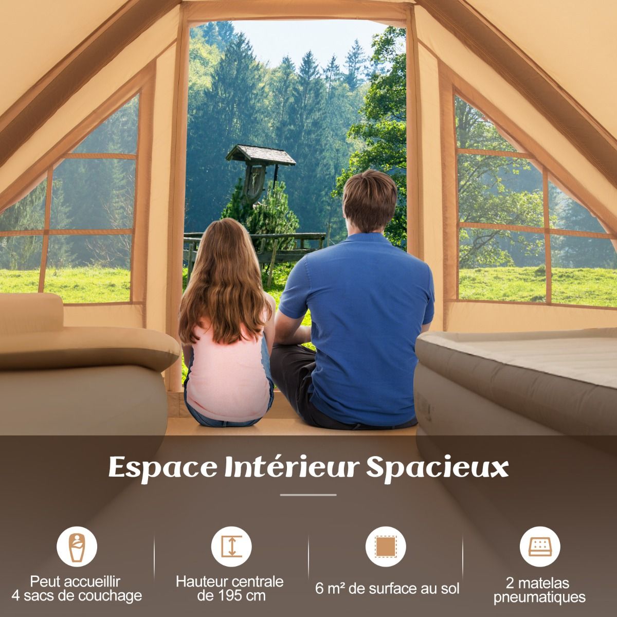 • Inflatable Camping Tent 6m2 for 4-6 People, Windproof and Waterproof Cotton Tent with Pump, 7 Mosquito Net Windows, Beige -