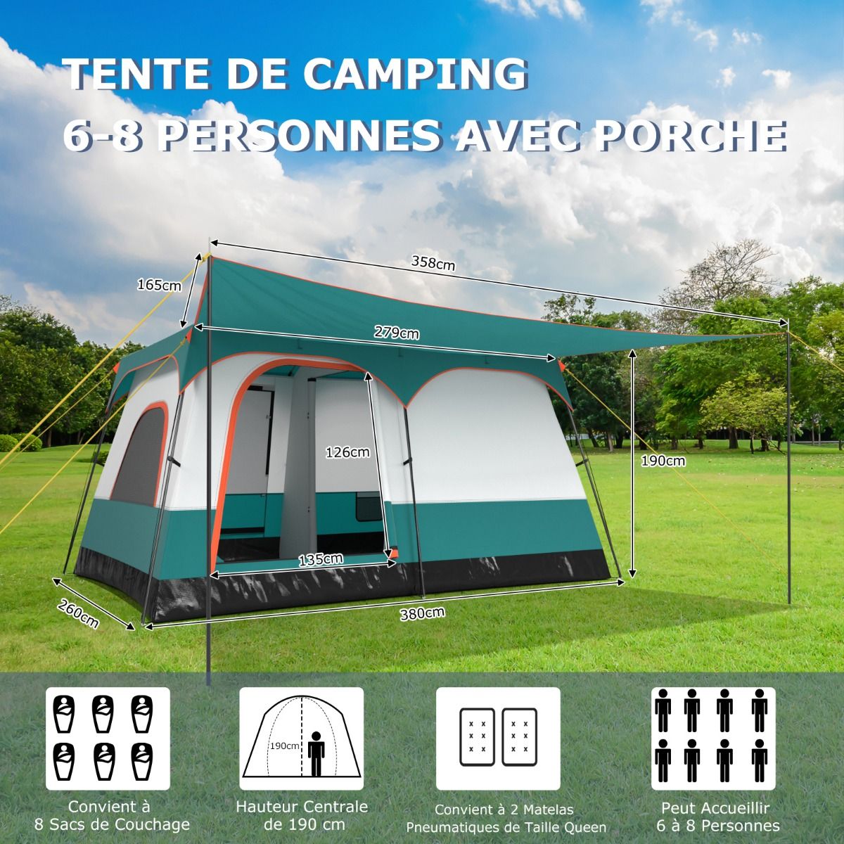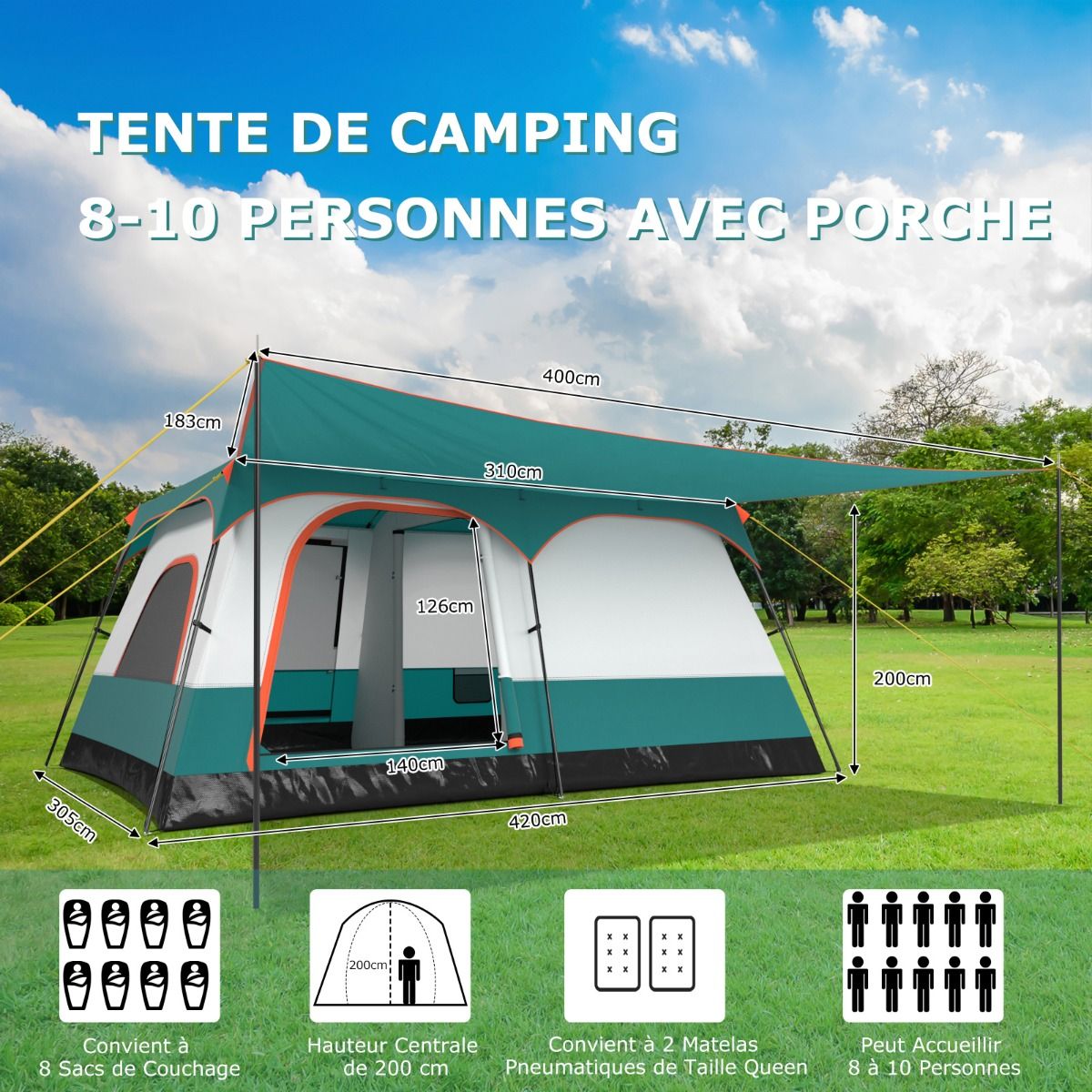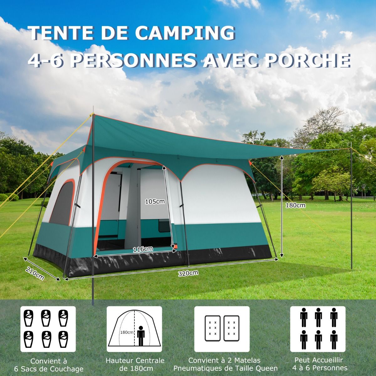 Our camping tent features two partitioned rooms, providing ample space for relaxation and outdoor activities. A large awning also offers additional relaxation space. Two doors and two mesh windows provide excellent ventilation and views. The tent comes with a removable rain cover and waterproof groundsheet to ensure you stay dry in any weather. Included tent pegs and guy lines securely hold the tent in place, making it easy to fold and store in the included packing bag. Product Features: Spacious Family Shelter This large camping tent measures 320 x 210 x 180 cm, 380 x 260 x 190 cm, or 420 x 305 x 200 cm, comfortably accommodating 4-6, 6-8, or 8-10 people, making it ideal for family outings. The tent easily accommodates 6-8 sleeping bags or 2 double air mattresses, ensuring a comfortable sleep. The tent's center height is 180 cm, 190 cm, or 200 cm, allowing for comfortable standing and movement. Dual-compartment design & large awning: The spacious interior features flexible partitions that can divide the tent into two private spaces or create a large open area. Additionally, a large awning extends the living space, allowing you to place tables and chairs for a comfortable outdoor experience. Waterproof materials: The tent features a removable Oxford cloth waterproof outer tent with a 1000mm PU coating, effectively protecting against light rain (Note: Do not use in heavy rain). Furthermore, the tent floor has a 3000mm PU waterproof coating to ensure a dry and comfortable interior. Robust and stable structure: This camping tent uses high-strength fiberglass poles, making it sturdy and durable enough to withstand various weather conditions. For further stability, the tent is equipped with 16 metal tent pegs and 8 guy lines to securely hold each corner. Foldable and portable design: This outdoor tent easily folds into a compact size and fits into a portable storage bag for easy storage and transport. This tent is suitable for a variety of outdoor activities, such as fishing, camping, family picnics, music festivals, or travel. Features: Sturdy and durable, offering spacious 2-room accommodation for 4-6, 6-8, or 8-10 people. The tent with an awning provides additional shade, allowing you to relax outdoors. Mesh doors and windows ensure air circulation while keeping pests out. The door features a smooth two-way zipper and locking loops for easy entry and exit. The mesh canopy design allows you to stargaze and enjoy nature at night. It features a weather-resistant double-layered canopy with a 1000mm PU coating to keep you dry and comfortable. The groundsheet has a 3000mm PU coating for waterproofing, resisting mud and rain. Supported by sturdy fiberglass poles and secured with strong connectors, ensuring excellent strength. Metal tent pegs and guy lines enhance wind resistance. Metal poles with special markings and different colors facilitate quick and easy setup. Includes a compact storage bag for easy carrying. Easy to carry, take it anywhere. It features a lantern hook at the top for hanging lights (not included) at night. An internal storage bag is included for storing small items. Specifications Colors: Blue, Green Material: Oxford cloth, PE, fiberglass poles Product Dimensions: 320 x 210 x 180 cm (L x W x H) 380 x 260 x 190 cm (L x W x H) 420 x 305 x 200 cm (L x W x H) Door Dimensions: 116 x 105 cm (L x H) 135 x 126 cm (L x H) 140 x 126 cm (L x W x H) Capacity: 4-6 people 6-8 people 8-10 people, 2 double mattresses, 6 sleeping bags Net Weight: 9 kg 12 kg 13 kg Package Includes: 1 camping tent 1 accessory bag 1 carrying bag 1 outer tent 16 ground pegs 8 drawstrings 1 user manual