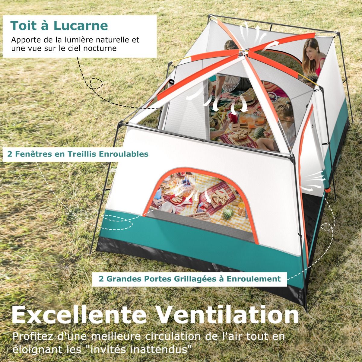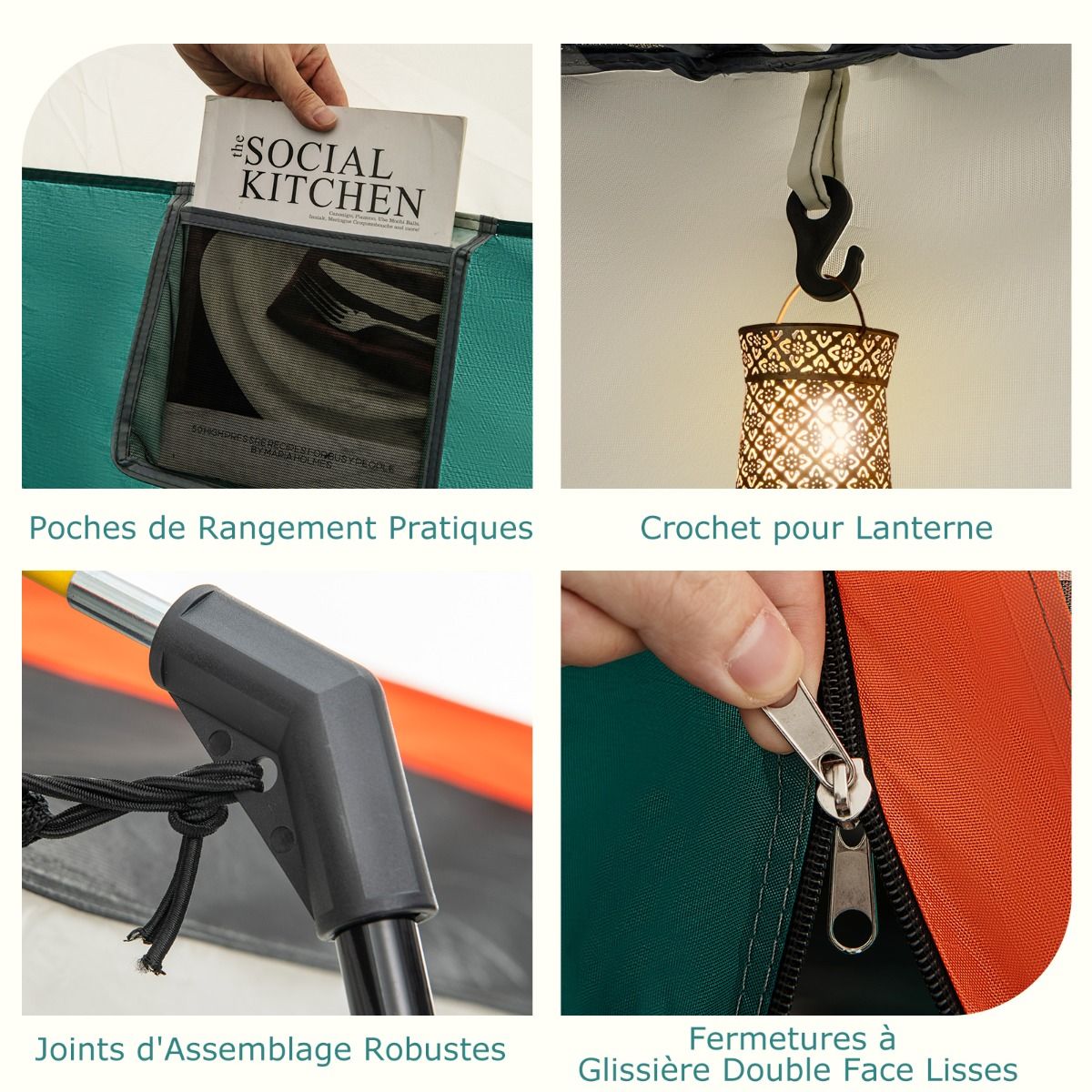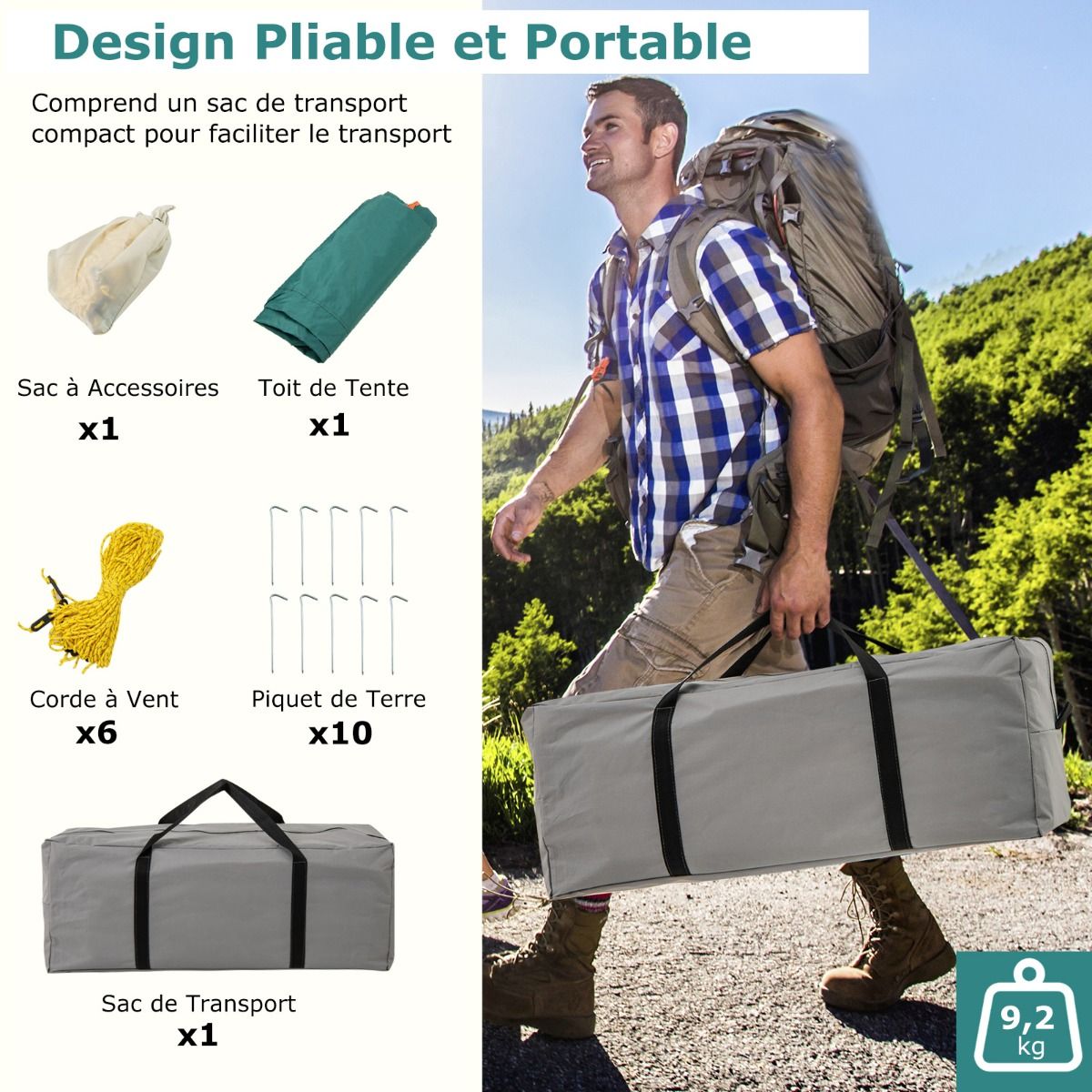 Our camping tent features two partitioned rooms, providing ample space for relaxation and outdoor activities. A large awning also offers additional relaxation space. Two doors and two mesh windows provide excellent ventilation and views. The tent comes with a removable rain cover and waterproof groundsheet to ensure you stay dry in any weather. Included tent pegs and guy lines securely hold the tent in place, making it easy to fold and store in the included packing bag. Product Features: Spacious Family Shelter This large camping tent measures 320 x 210 x 180 cm, 380 x 260 x 190 cm, or 420 x 305 x 200 cm, comfortably accommodating 4-6, 6-8, or 8-10 people, making it ideal for family outings. The tent easily accommodates 6-8 sleeping bags or 2 double air mattresses, ensuring a comfortable sleep. The tent's center height is 180 cm, 190 cm, or 200 cm, allowing for comfortable standing and movement. Dual-compartment design & large awning: The spacious interior features flexible partitions that can divide the tent into two private spaces or create a large open area. Additionally, a large awning extends the living space, allowing you to place tables and chairs for a comfortable outdoor experience. Waterproof materials: The tent features a removable Oxford cloth waterproof outer tent with a 1000mm PU coating, effectively protecting against light rain (Note: Do not use in heavy rain). Furthermore, the tent floor has a 3000mm PU waterproof coating to ensure a dry and comfortable interior. Robust and stable structure: This camping tent uses high-strength fiberglass poles, making it sturdy and durable enough to withstand various weather conditions. For further stability, the tent is equipped with 16 metal tent pegs and 8 guy lines to securely hold each corner. Foldable and portable design: This outdoor tent easily folds into a compact size and fits into a portable storage bag for easy storage and transport. This tent is suitable for a variety of outdoor activities, such as fishing, camping, family picnics, music festivals, or travel. Features: Sturdy and durable, offering spacious 2-room accommodation for 4-6, 6-8, or 8-10 people. The tent with an awning provides additional shade, allowing you to relax outdoors. Mesh doors and windows ensure air circulation while keeping pests out. The door features a smooth two-way zipper and locking loops for easy entry and exit. The mesh canopy design allows you to stargaze and enjoy nature at night. It features a weather-resistant double-layered canopy with a 1000mm PU coating to keep you dry and comfortable. The groundsheet has a 3000mm PU coating for waterproofing, resisting mud and rain. Supported by sturdy fiberglass poles and secured with strong connectors, ensuring excellent strength. Metal tent pegs and guy lines enhance wind resistance. Metal poles with special markings and different colors facilitate quick and easy setup. Includes a compact storage bag for easy carrying. Easy to carry, take it anywhere. It features a lantern hook at the top for hanging lights (not included) at night. An internal storage bag is included for storing small items. Specifications Colors: Blue, Green Material: Oxford cloth, PE, fiberglass poles Product Dimensions: 320 x 210 x 180 cm (L x W x H) 380 x 260 x 190 cm (L x W x H) 420 x 305 x 200 cm (L x W x H) Door Dimensions: 116 x 105 cm (L x H) 135 x 126 cm (L x H) 140 x 126 cm (L x W x H) Capacity: 4-6 people 6-8 people 8-10 people, 2 double mattresses, 6 sleeping bags Net Weight: 9 kg 12 kg 13 kg Package Includes: 1 camping tent 1 accessory bag 1 carrying bag 1 outer tent 16 ground pegs 8 drawstrings 1 user manual
