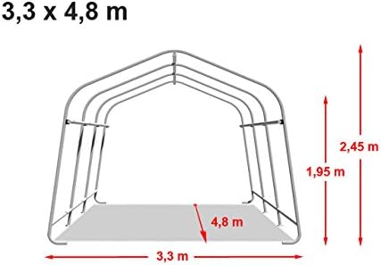General Purpose Awning: Economical garage awning. Provides professional protection for temporary storage of cars, boats, and lawns. High-Quality Tarpaulin: All tarpaulins are made of 450N polyethylene (PE), offering UV resistance and 100% water resistance. Seams are heat-sealed, making it the highest quality PE material on the market. The one-piece roof design ensures effective stability. Steel Structure: The structure is very robust, bolted in place, with steel fittings approximately 38mm thick. Chrome-plated steel meets DIN 55633 corrosion resistance standards. Easy Assembly: The product includes sturdy guy ropes, dedicated anchors, and assembly instructions in French. Coming Soon: Economical garage and storage awning. The product includes a galvanized steel frame, roof tarpaulin, gable tarpaulin with ventilation windows, anchor piles, and assembly instructions. Garage Tent: Robust and durable vehicle shelter. This sturdy garage tent protects your vehicle from the elements. It features a robust structure and uses 450N polyethylene tarpaulin, securely fastened to the frame via a special tensioning system. This garage tent offers high UV protection. A sturdy zipper system at the entrance allows for quick and easy opening and closing. Integrated ventilation baffles ensure optimal airflow and reduce moisture buildup. It provides shelter and protection for cars, motorcycles, bicycles, machinery, equipment, etc. Safely store products and goods. Quickly set up storage or production areas. Temporarily store grass. Protect foundations and construction sites, providing a protective structure for renovation projects. Economical and an ideal alternative to permanent structures. Safety Notice: This tent has not been tested for wind and snow loads. Therefore, we are not liable for any damage caused by it. Please set up the tent according to the instructions. If it is only light snow, please clear the snow from the roof immediately. If the wind increases, please use our weatherproof kit. In case of strong winds or snowfall, we recommend that you temporarily dismantle the tent. For more safety information, please refer to the assembly instructions. We are not responsible for any direct or indirect loss of persons, animals, or property caused during the tent setup process.