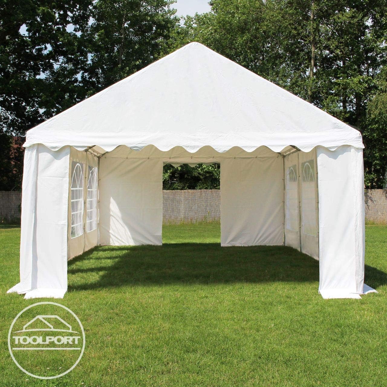 The ideal tent for all kinds of parties: This budget-friendly tent series lets you quickly create a comfortable party space! High-quality canvas: Made of 700N PVC canvas, it boasts superior quality, a one-piece molding, and is sturdy and durable. Side air deflectors ensure optimal airflow and temperature regulation. Galvanized steel frame: Utilizing only galvanized steel tubing approximately 38mm in diameter and fittings approximately 42mm in diameter. Wing-nut bolt connections provide strong load-bearing capacity and easy assembly. Ready to use, easy installation: Securely fastened to the ground using ground pegs and ropes. Simple assembly instructions and numbered steel tubing allow for quick assembly. Product includes: Party tent, including: steel frame, roof canvas, side canvas, entrance with zippered door, ropes, ground pegs, and assembly instructions. PVC party tent: Sturdy and durable, quick to set up. This budget-friendly party tent frame is very easy to assemble. Fully galvanized steel tubing is corrosion-resistant. The PVC tarpaulin offers high UV protection (UPF 50+) and effective rain protection (100% waterproof). The 2-meter-long side canopy can be installed or removed as needed, allowing for various layout options! Safety Notice: This tent has not been tested for wind and snow loads. Therefore, we are not responsible for any damage caused by it. Please set up the tent according to the instructions. In case of light snow, please immediately clear the snow from the top of the tent. When the wind increases, please use our weatherproof kit. In case of strong winds and heavy snow, it is recommended to temporarily dismantle the tent.