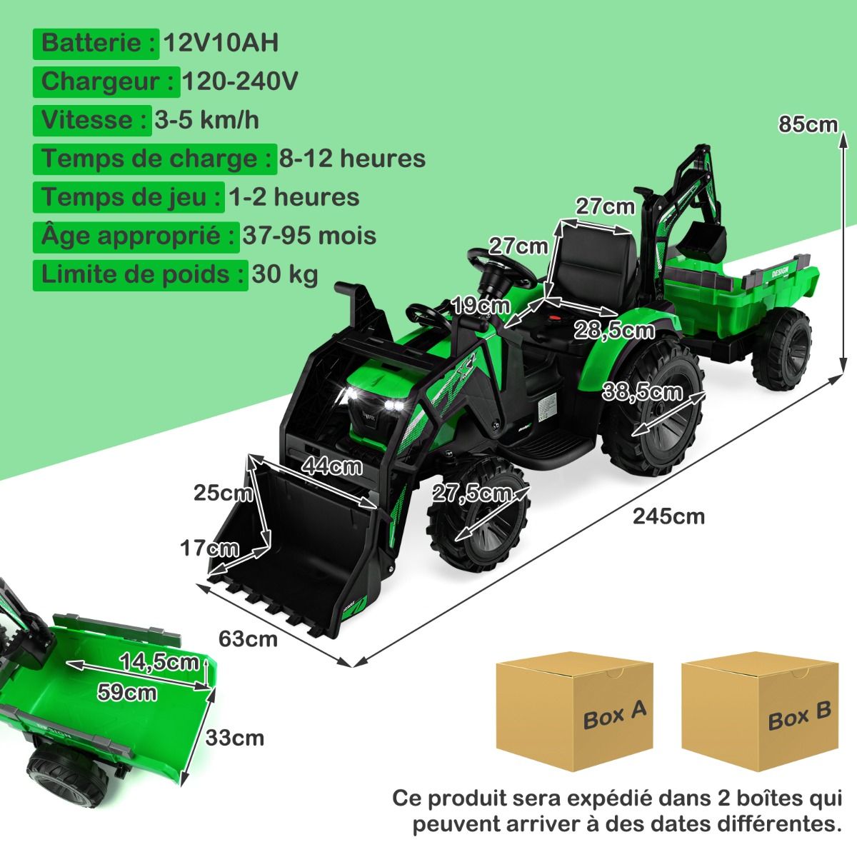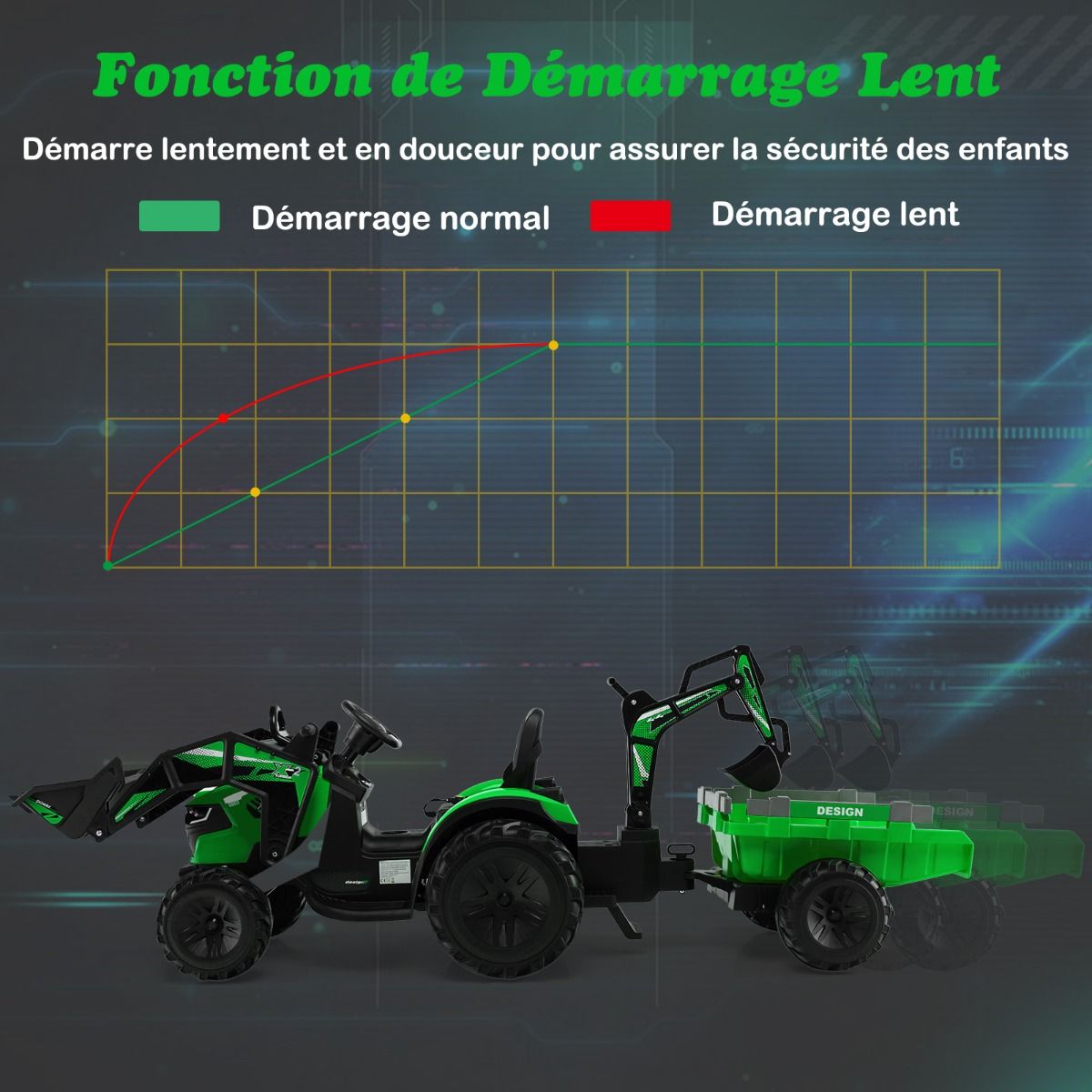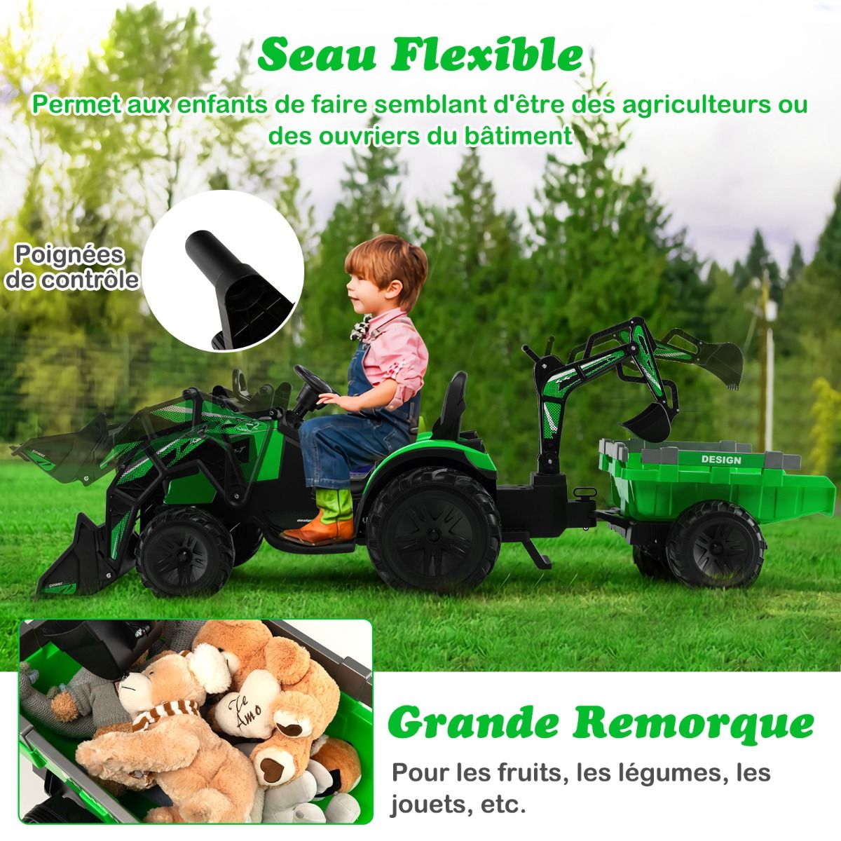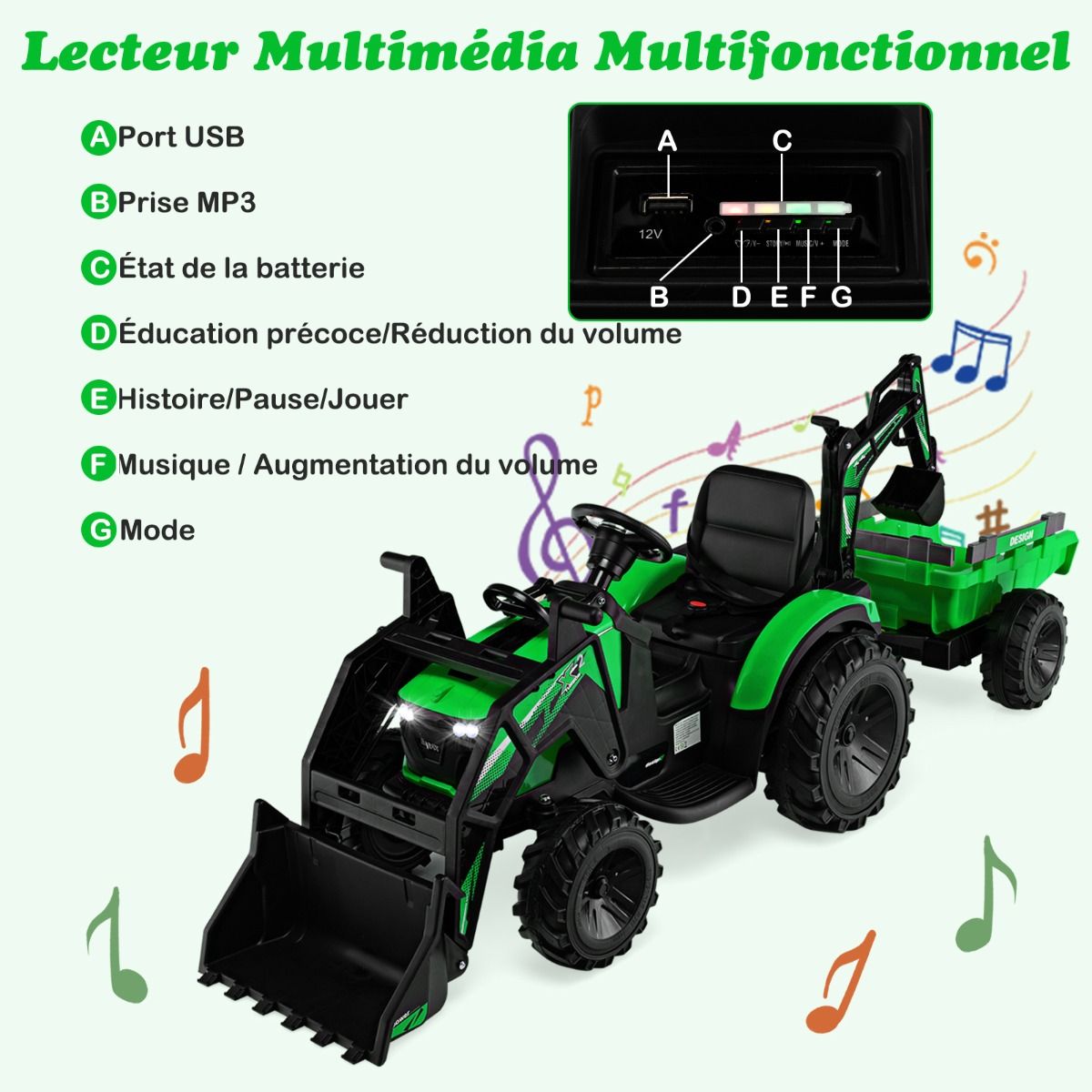 • 12V Electric Tractor for Children, 3-5 km/h, Remote Control, MP3, USB, Green/Yellow -