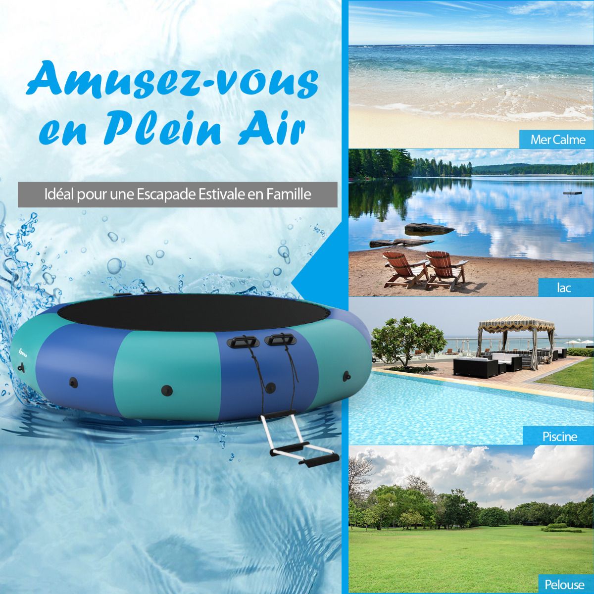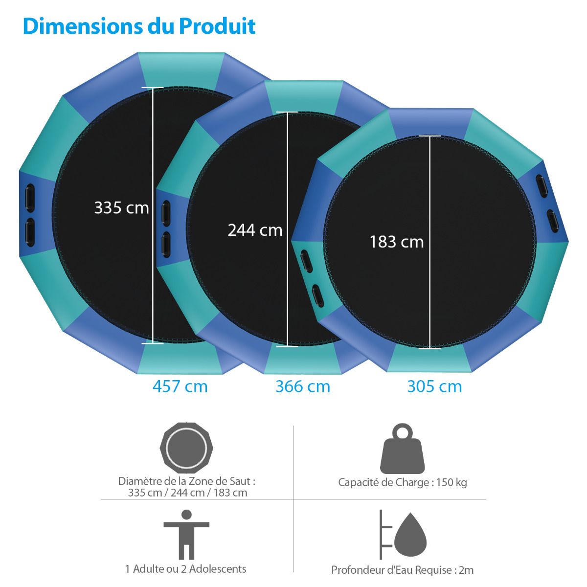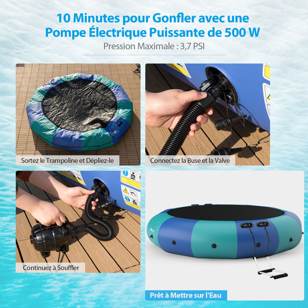 Have you ever experienced the thrill of jumping on water? We recommend this water trampoline for a unique and unparalleled experience. Made from PVC, nylon fabric, and elastic rope, it combines excellent elasticity and durability. Tear-resistant, waterproof, and weatherproof, this trampoline has a maximum weight capacity of 150 kg, making it ideal for water activities. It also features a three-tiered rope ladder and multiple sturdy handrails for easy access to the platform to relax after swimming. Furthermore, once anchored, it can also serve as a great platform for sunbathing or fishing. The kit includes a powerful electric air pump to help you inflate quickly and get into the water easily. Bring it home and enjoy your vacation! Features: Sturdy and durable, extra-large bounce area, endless fun. This water trampoline features a large bounce surface, already secured to the support frame. With a maximum weight capacity of 150 kg, it can comfortably accommodate one adult or two teenagers jumping simultaneously. Compared to land trampolines, this inflatable trampoline lets you enjoy the thrill of jumping in cool water. Easy to Portable and Set Up: This compact inflatable trampoline is easy to carry, allowing you to bounce around in the water even when you're far from home. It also features a powerful electric air pump that inflates in just 10 minutes, letting you quickly get into the water! Complete Accessories: To ensure a safe and fun water trampoline experience, we include a 500W electric air pump, rope ladder, 3 mooring ropes, and an anchor in the package. You can fill the anchor with water or sand and secure it to the trampoline for increased stability in the water. Durable and Weatherproof Materials: Our water trampoline is designed for lasting outdoor fun. It uses high-quality elastic bands and durable nylon fabric, instead of metal springs, making it more suitable for outdoor water environments. Meanwhile, the colored parts are made of sturdy PVC material, which is puncture-resistant and weatherproof. Large Water Sports Platform: This recreational trampoline comes with a rope ladder and reinforced handrails for easy access and can also be used as a swimming platform. After swimming, you can climb back onto the trampoline to relax and enjoy the sun. Therefore, it is ideal for a family lakeside getaway in the summer. Features: Extra-large jumping area, allowing one adult or two children to jump simultaneously. Uses elastic rope instead of springs for better elasticity and enhanced waterproofing. Made of elastic nylon fabric and durable PVC for long-lasting durability. The set includes an electric air pump, rope ladder, three mooring ropes, and an anchor. The inflatable trampoline can be easily set up in 10 minutes using the included air pump. Equipped with a rope ladder and safety handles for easy access. Secure the anchor to the trampoline for enhanced stability. Ideal for water sports, sunbathing, and fishing. Easy to store and transport after deflation. Suitable for calm waters deeper than 2 meters. Specifications: Colors: Blue + Green + Black. Material: PVC + Oxford cloth. Overall dimensions: 457 cm x 457 cm x 65 cm (L x W x H). Net weight: 29.5 kg. Jumping area diameter: 335 cm. Weight capacity: 150 kg. Recommended age: 14 years and up. Maximum pressure for ages 3 and up: 0.2 bar; Required water depth: 2 meters; Package includes: 1 water trampoline, 1 500W electric pump, 3 mooring lines, 1 rope ladder, 1 anchor, and 1 instruction manual.