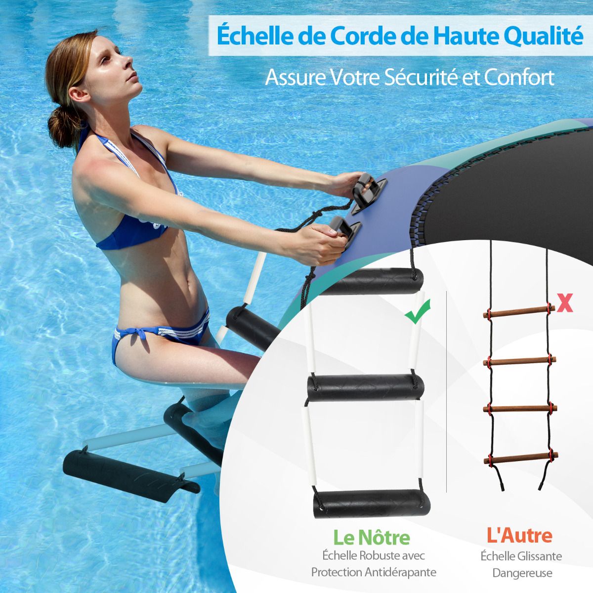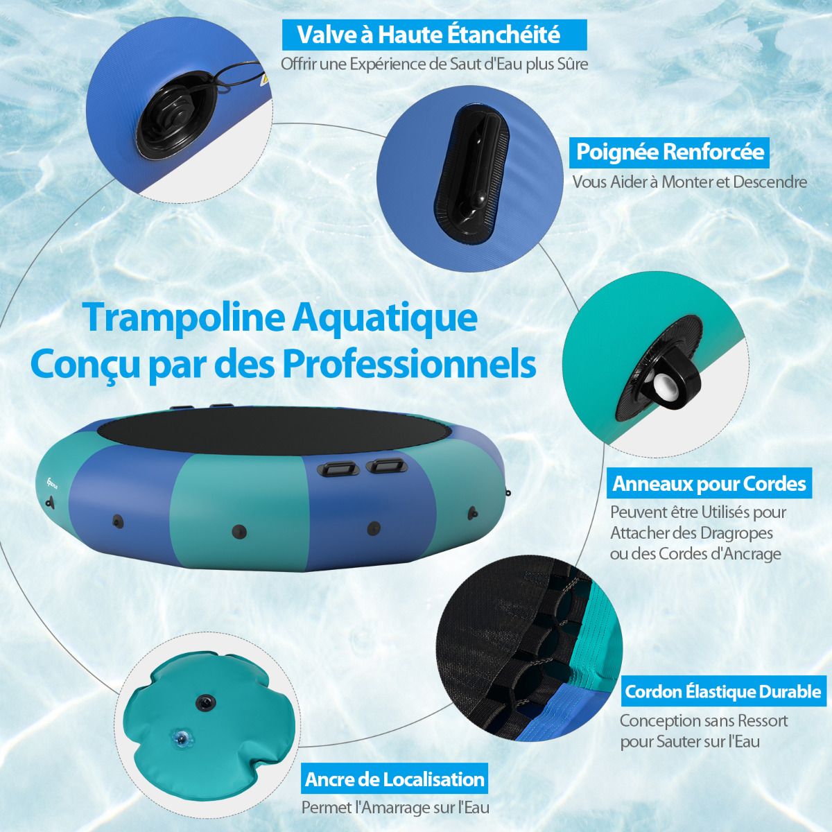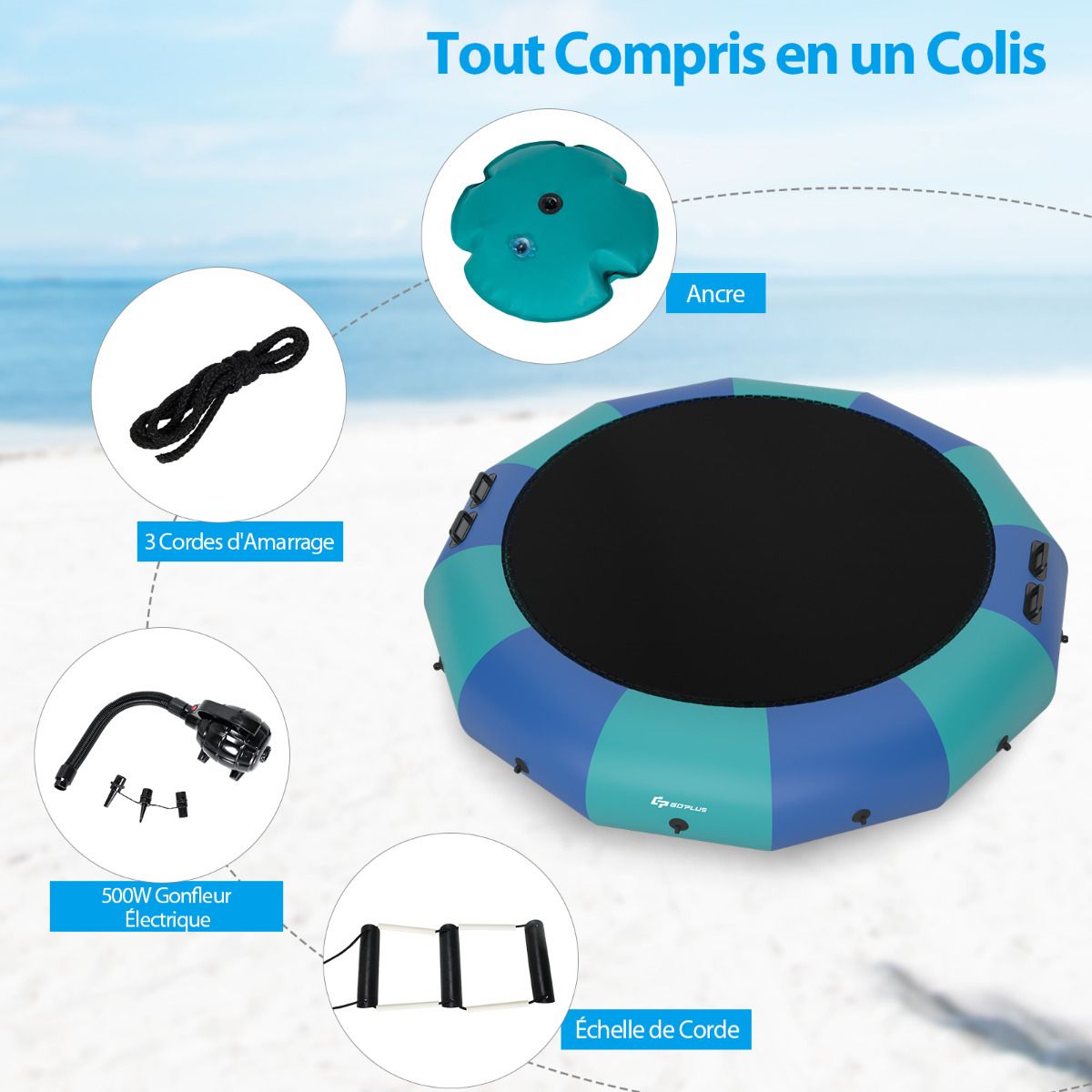 Have you ever experienced the thrill of jumping on water? We recommend this water trampoline for a unique and unparalleled experience. Made from PVC, nylon fabric, and elastic rope, it combines excellent elasticity and durability. Tear-resistant, waterproof, and weatherproof, this trampoline has a maximum weight capacity of 150 kg, making it ideal for water activities. It also features a three-tiered rope ladder and multiple sturdy handrails for easy access to the platform to relax after swimming. Furthermore, once anchored, it can also serve as a great platform for sunbathing or fishing. The kit includes a powerful electric air pump to help you inflate quickly and get into the water easily. Bring it home and enjoy your vacation! Features: Sturdy and durable, extra-large bounce area, endless fun. This water trampoline features a large bounce surface, already secured to the support frame. With a maximum weight capacity of 150 kg, it can comfortably accommodate one adult or two teenagers jumping simultaneously. Compared to land trampolines, this inflatable trampoline lets you enjoy the thrill of jumping in cool water. Easy to Portable and Set Up: This compact inflatable trampoline is easy to carry, allowing you to bounce around in the water even when you're far from home. It also features a powerful electric air pump that inflates in just 10 minutes, letting you quickly get into the water! Complete Accessories: To ensure a safe and fun water trampoline experience, we include a 500W electric air pump, rope ladder, 3 mooring ropes, and an anchor in the package. You can fill the anchor with water or sand and secure it to the trampoline for increased stability in the water. Durable and Weatherproof Materials: Our water trampoline is designed for lasting outdoor fun. It uses high-quality elastic bands and durable nylon fabric, instead of metal springs, making it more suitable for outdoor water environments. Meanwhile, the colored parts are made of sturdy PVC material, which is puncture-resistant and weatherproof. Large Water Sports Platform: This recreational trampoline comes with a rope ladder and reinforced handrails for easy access and can also be used as a swimming platform. After swimming, you can climb back onto the trampoline to relax and enjoy the sun. Therefore, it is ideal for a family lakeside getaway in the summer. Features: Extra-large jumping area, allowing one adult or two children to jump simultaneously. Uses elastic rope instead of springs for better elasticity and enhanced waterproofing. Made of elastic nylon fabric and durable PVC for long-lasting durability. The set includes an electric air pump, rope ladder, three mooring ropes, and an anchor. The inflatable trampoline can be easily set up in 10 minutes using the included air pump. Equipped with a rope ladder and safety handles for easy access. Secure the anchor to the trampoline for enhanced stability. Ideal for water sports, sunbathing, and fishing. Easy to store and transport after deflation. Suitable for calm waters deeper than 2 meters. Specifications: Colors: Blue + Green + Black. Material: PVC + Oxford cloth. Overall dimensions: 457 cm x 457 cm x 65 cm (L x W x H). Net weight: 29.5 kg. Jumping area diameter: 335 cm. Weight capacity: 150 kg. Recommended age: 14 years and up. Maximum pressure for ages 3 and up: 0.2 bar; Required water depth: 2 meters; Package includes: 1 water trampoline, 1 500W electric pump, 3 mooring lines, 1 rope ladder, 1 anchor, and 1 instruction manual.