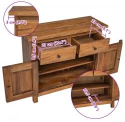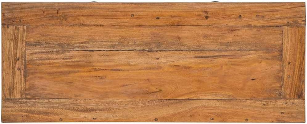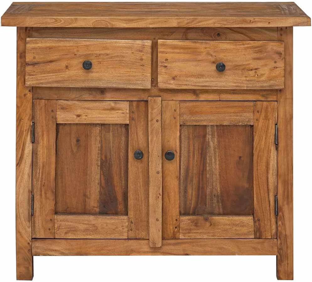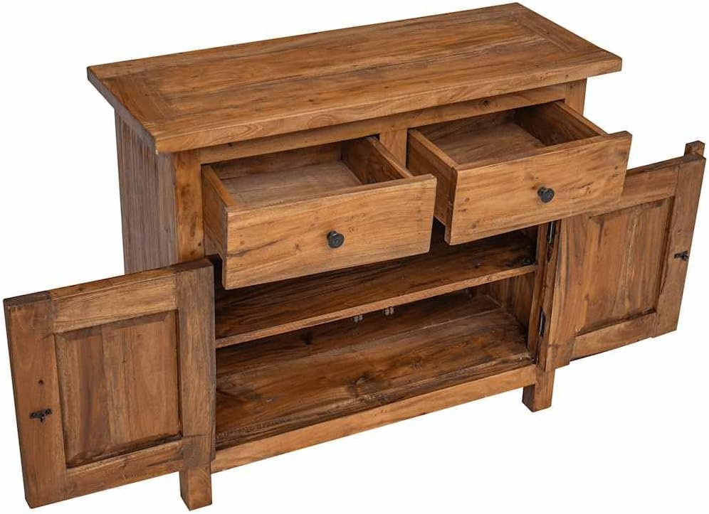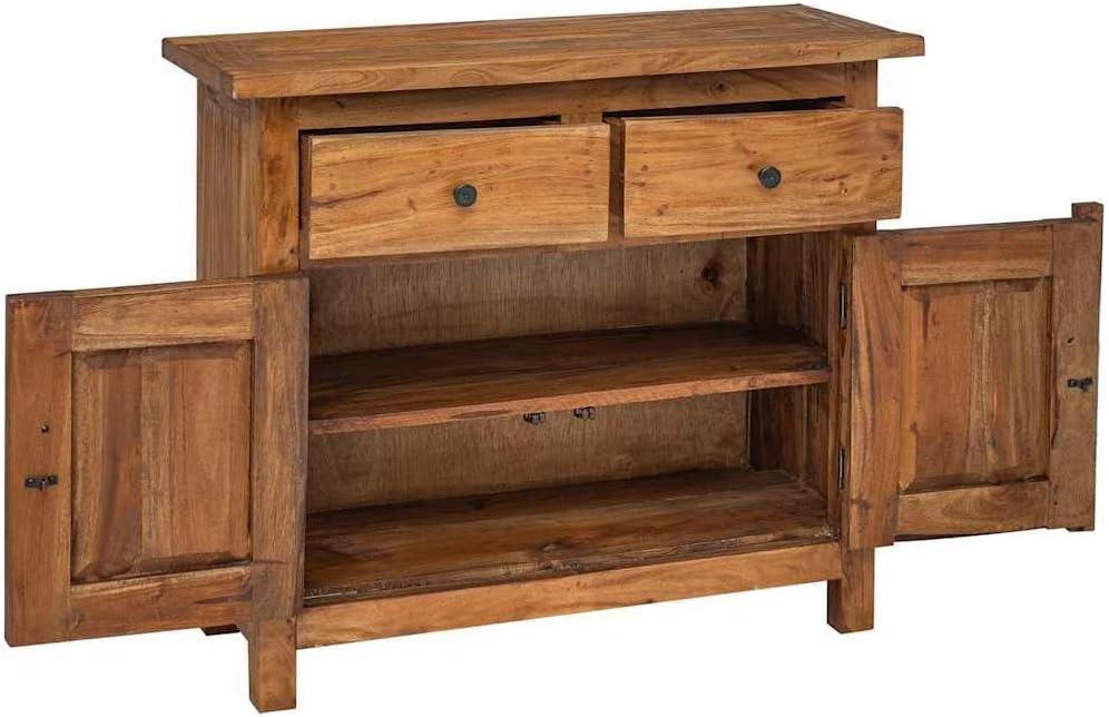 This sideboard will add a touch of rustic charm to your home decor. Crafted from solid reclaimed wood, the patina of age gives each piece a unique look and a distinctive vintage feel. It features two drawers and a cabinet with shelves and two doors. Sturdy and Stable: This solid wood sideboard is made from solid mahogany, making it extremely durable and sturdy. Mahogany is a tropical hardwood, highly prized for its beauty, durability, and color. Exquisite craftsmanship gives this product a warm, authentic, and vintage look. Ample Storage Space: Two drawers and a cabinet with shelves provide ample storage space for various everyday items, making them easily accessible. Display Function: The sturdy tabletop is perfect for displaying picture frames, vases, fruit baskets, or other decorative items. Practical Cabinet Doors: The cabinet doors protect your items from dust while keeping them neat and tidy. Product Description: This sideboard will add a touch of rustic charm to your home decor. This sideboard is crafted from solid reclaimed wood, the patina of age giving each piece a unique look and adding to its charming vintage appeal. It features two drawers and a cabinet with shelves and two doors. Sturdy and Durable: Made from solid mahogany, this sideboard is exceptionally durable and sturdy. Mahogany is a tropical hardwood highly prized for its beauty, durability, and color. Exquisite craftsmanship gives this piece a warm, authentic vintage feel. Ample Storage: Two drawers and a cabinet with shelves provide ample storage space for everyday essentials, making them easily accessible. Display Function: The sturdy tabletop is perfect for displaying picture frames, vases, fruit bowls, or other decorative items. Convenient Cabinet Doors: The cabinet doors protect your items from dust while maintaining a clean and tidy appearance. Vintage Style: This wooden sideboard is meticulously handcrafted by artisans. Each piece is unique and slightly different. The patina of age gives each piece a distinctive look, adding to its charming vintage appeal. Note: The color of each product may vary slightly, making each piece unique. Shipments are random to ensure your product's uniqueness and individuality. Material: Solid mahogany, brass. Dimensions: 75 x 30 x 65 cm (W x D x H). Includes 2 drawers and a cabinet with 1 shelf and 2 doors. Handmade. Safety Warning: Keep out of reach of children.