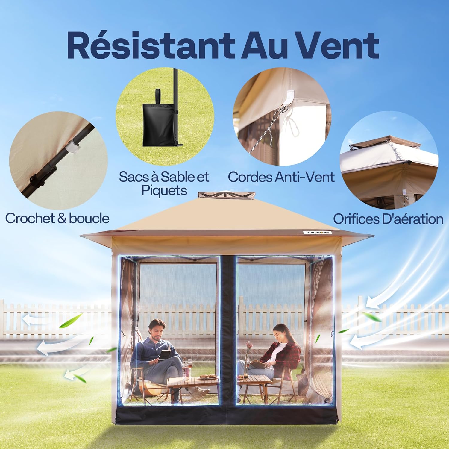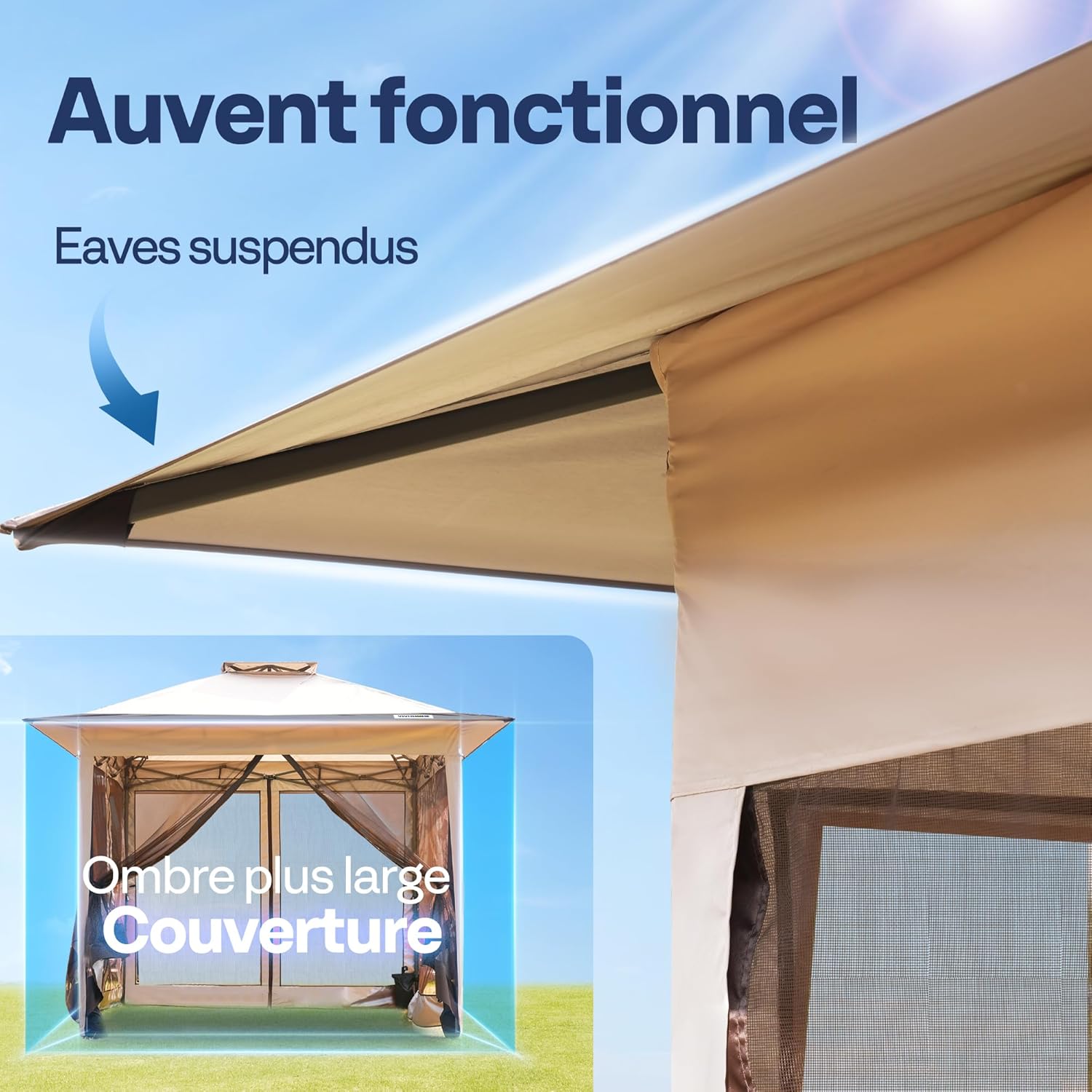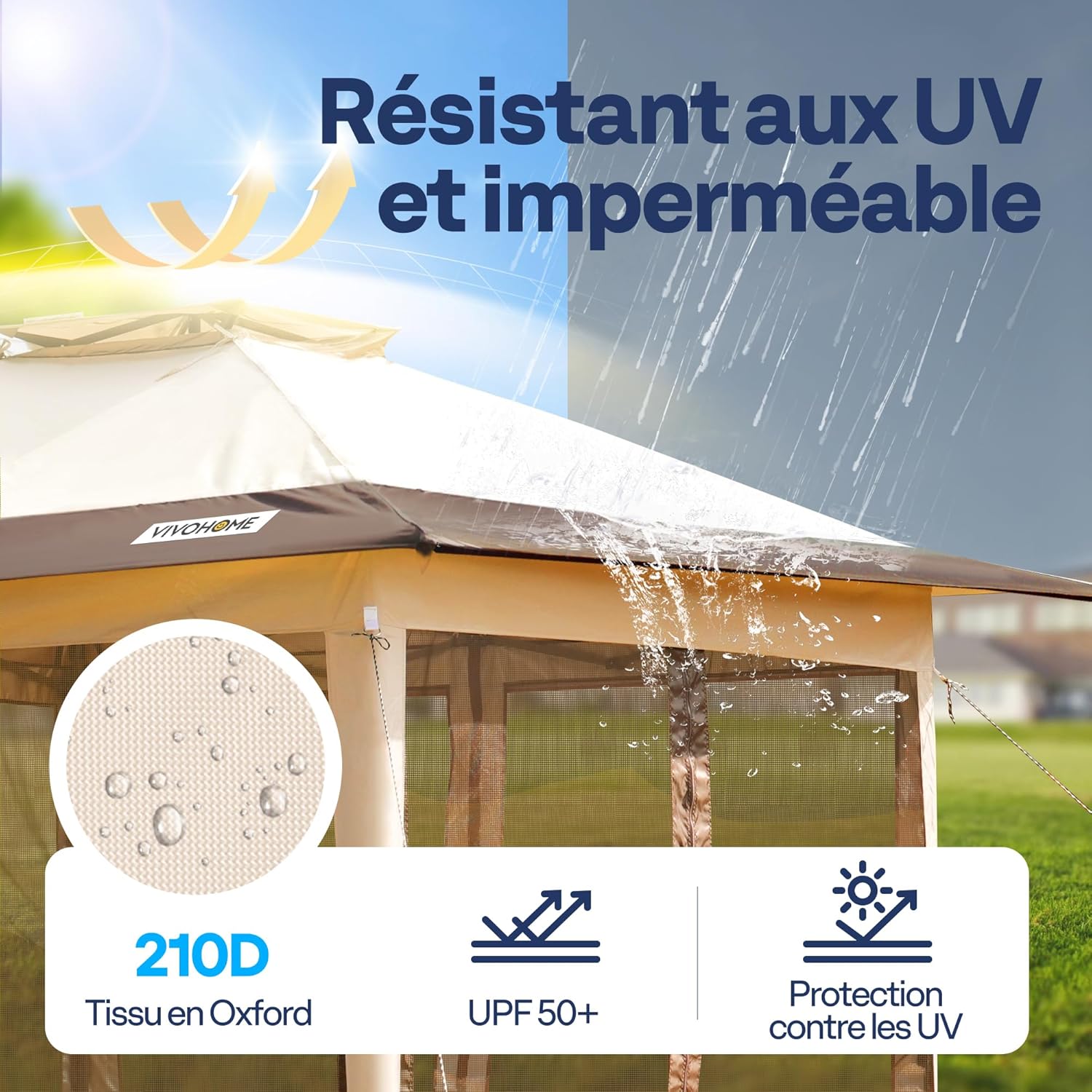 Functional Design: This 3x3 meter awning features a double-layered canopy and silver-coated 210D Oxford cloth, offering UPF 50+ sun protection and a sealing strip. Its steep slope prevents water accumulation and ensures 360Spend all-around protection. The ventilated canopy promotes airflow, reduces heat, and provides optimal comfort. Sturdy Frame: The awning utilizes a robust crossbar and triangular frame structure, maintaining excellent stability even in windy conditions. Thickened steel tubing and a central locking system ensure its strength and durability. A breathable mesh mosquito net effectively prevents mosquito bites while promoting airflow. Four side zippers allow for easy adjustment to your personal comfort level. Easy Installation and Portability: The awning is designed for ease of use, featuring a quick-release button mechanism that allows two people to easily install and remove it in minutes. A height adjustment knob allows you to adjust the awning height as needed. This awning comes with a dedicated storage bag for neatly storing all components, making it easy to fit into your car trunk. Reliable Airflow: The awning features vents, drawstrings, sandbags, spiral tent pegs, and Velcro for a secure hold, even in harsh weather conditions. The breathable double-layered canopy enhances airflow, reduces heat buildup, and improves stability in windy conditions. Versatile Use: Suitable for a variety of outdoor activities, including picnics, camping, backyard barbecues, parties, and market stalls. Waterproof and sun-protective fabric effectively protects against rain and harmful UV rays. Creates a comfortable, shady, and welcoming outdoor environment for family and friends, no matter the occasion. The VIVOHOME 10 x 10-foot awning features a double-layered extended eaves design, providing ample shade, adjustable height, and a steeper slope to prevent water accumulation. 1. Extended Eaves 2. Premium Fabric 3. UV Protection 4. Portable Wheeled Storage Bag 1. Easy Setup 2. Double-Layered Canopy 3. Central Locking System 4. Sturdy Structure 1. Garden 2. Barbecue 3. Party 4. Camping Note: To extend its lifespan, it is recommended to pack up the tent during strong winds or heavy rain. Material: 210D Oxford cloth + 30 g/m2 mesh + powder-coated steel frame Color: Beige Canopy Height: 2.7 m Packaging Dimensions: 130 x 25 x 25 cm Packaging Weight: 19 kg We are committed to responsibility, prioritizing product optimization and continuously improving the customer experience.