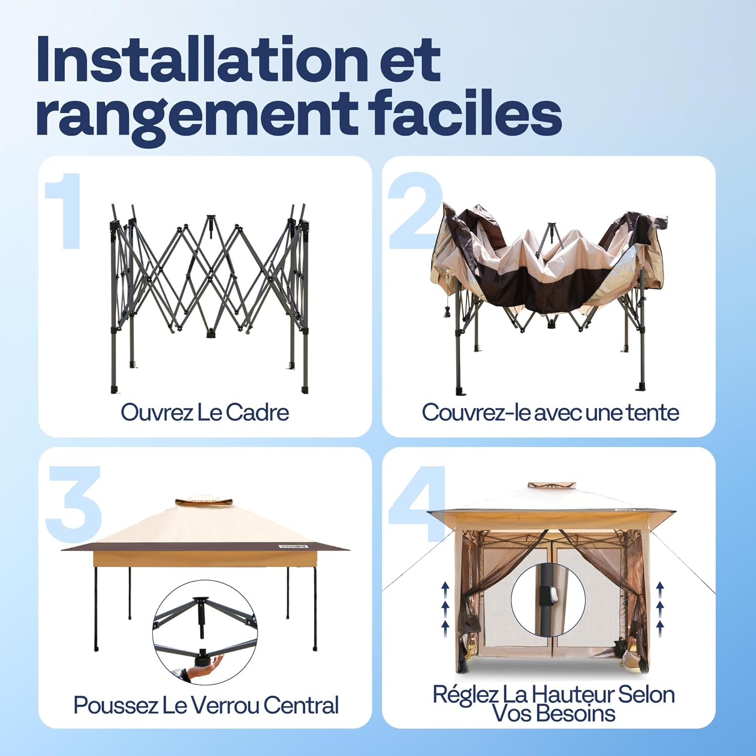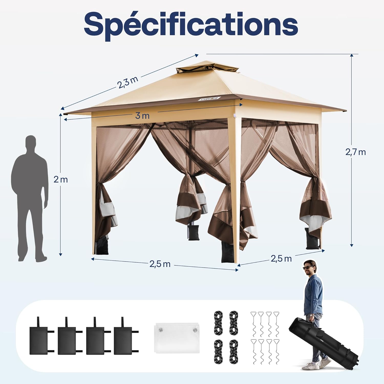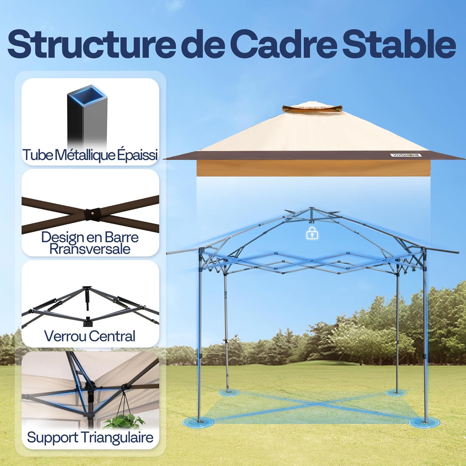 Functional Design: This 3x3 meter awning features a double-layered canopy and silver-coated 210D Oxford cloth, offering UPF 50+ sun protection and a sealing strip. Its steep slope prevents water accumulation and ensures 360Spend all-around protection. The ventilated canopy promotes airflow, reduces heat, and provides optimal comfort. Sturdy Frame: The awning utilizes a robust crossbar and triangular frame structure, maintaining excellent stability even in windy conditions. Thickened steel tubing and a central locking system ensure its strength and durability. A breathable mesh mosquito net effectively prevents mosquito bites while promoting airflow. Four side zippers allow for easy adjustment to your personal comfort level. Easy Installation and Portability: The awning is designed for ease of use, featuring a quick-release button mechanism that allows two people to easily install and remove it in minutes. A height adjustment knob allows you to adjust the awning height as needed. This awning comes with a dedicated storage bag for neatly storing all components, making it easy to fit into your car trunk. Reliable Airflow: The awning features vents, drawstrings, sandbags, spiral tent pegs, and Velcro for a secure hold, even in harsh weather conditions. The breathable double-layered canopy enhances airflow, reduces heat buildup, and improves stability in windy conditions. Versatile Use: Suitable for a variety of outdoor activities, including picnics, camping, backyard barbecues, parties, and market stalls. Waterproof and sun-protective fabric effectively protects against rain and harmful UV rays. Creates a comfortable, shady, and welcoming outdoor environment for family and friends, no matter the occasion. The VIVOHOME 10 x 10-foot awning features a double-layered extended eaves design, providing ample shade, adjustable height, and a steeper slope to prevent water accumulation. 1. Extended Eaves 2. Premium Fabric 3. UV Protection 4. Portable Wheeled Storage Bag 1. Easy Setup 2. Double-Layered Canopy 3. Central Locking System 4. Sturdy Structure 1. Garden 2. Barbecue 3. Party 4. Camping Note: To extend its lifespan, it is recommended to pack up the tent during strong winds or heavy rain. Material: 210D Oxford cloth + 30 g/m2 mesh + powder-coated steel frame Color: Beige Canopy Height: 2.7 m Packaging Dimensions: 130 x 25 x 25 cm Packaging Weight: 19 kg We are committed to responsibility, prioritizing product optimization and continuously improving the customer experience.