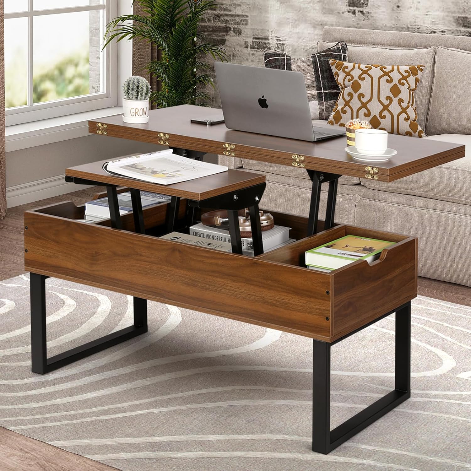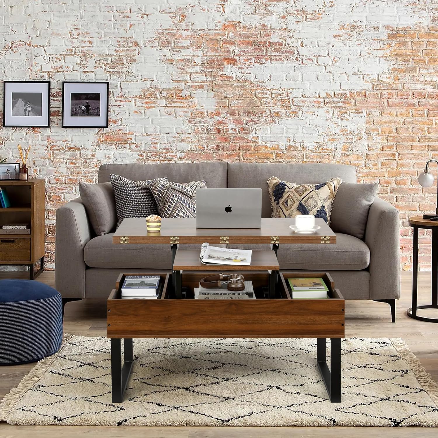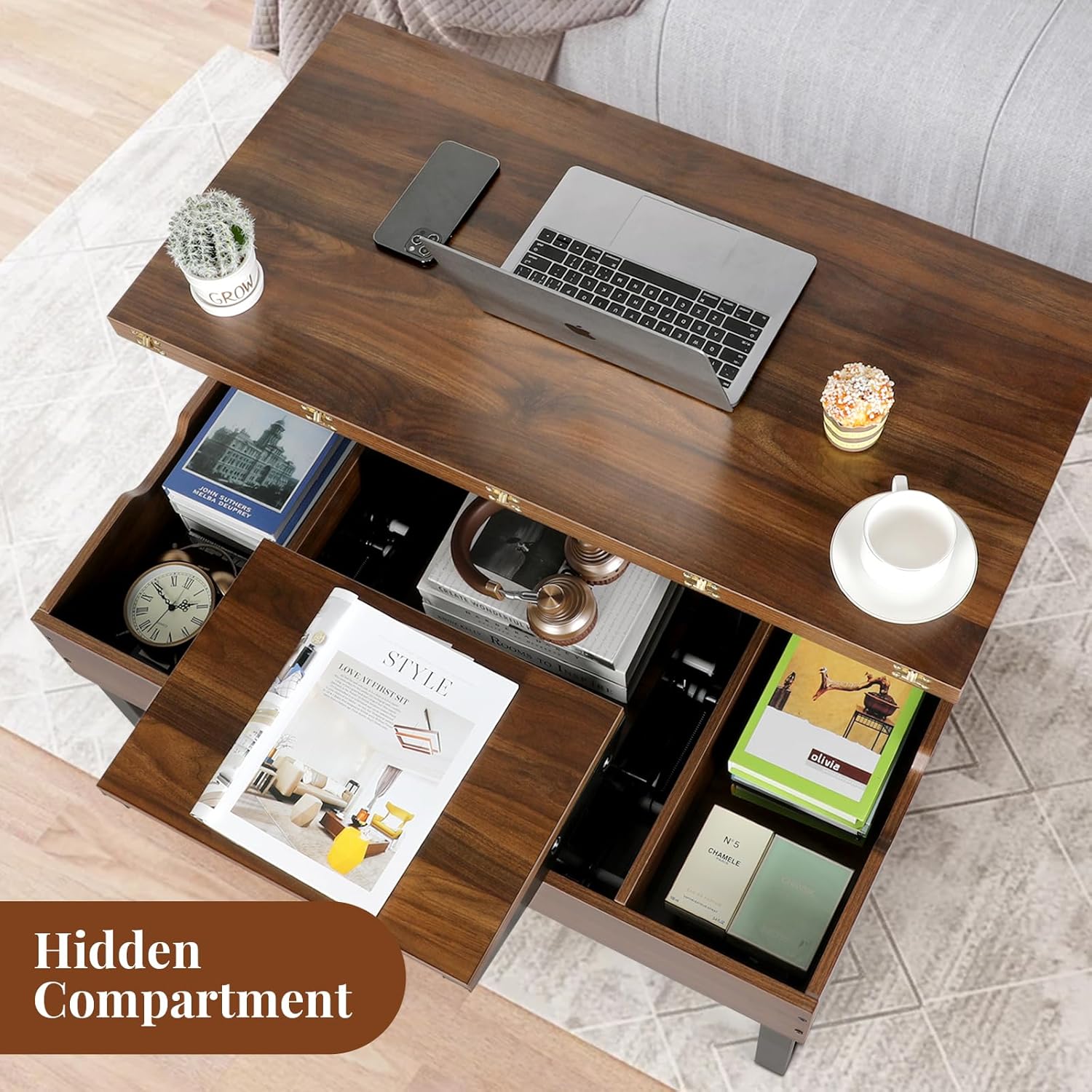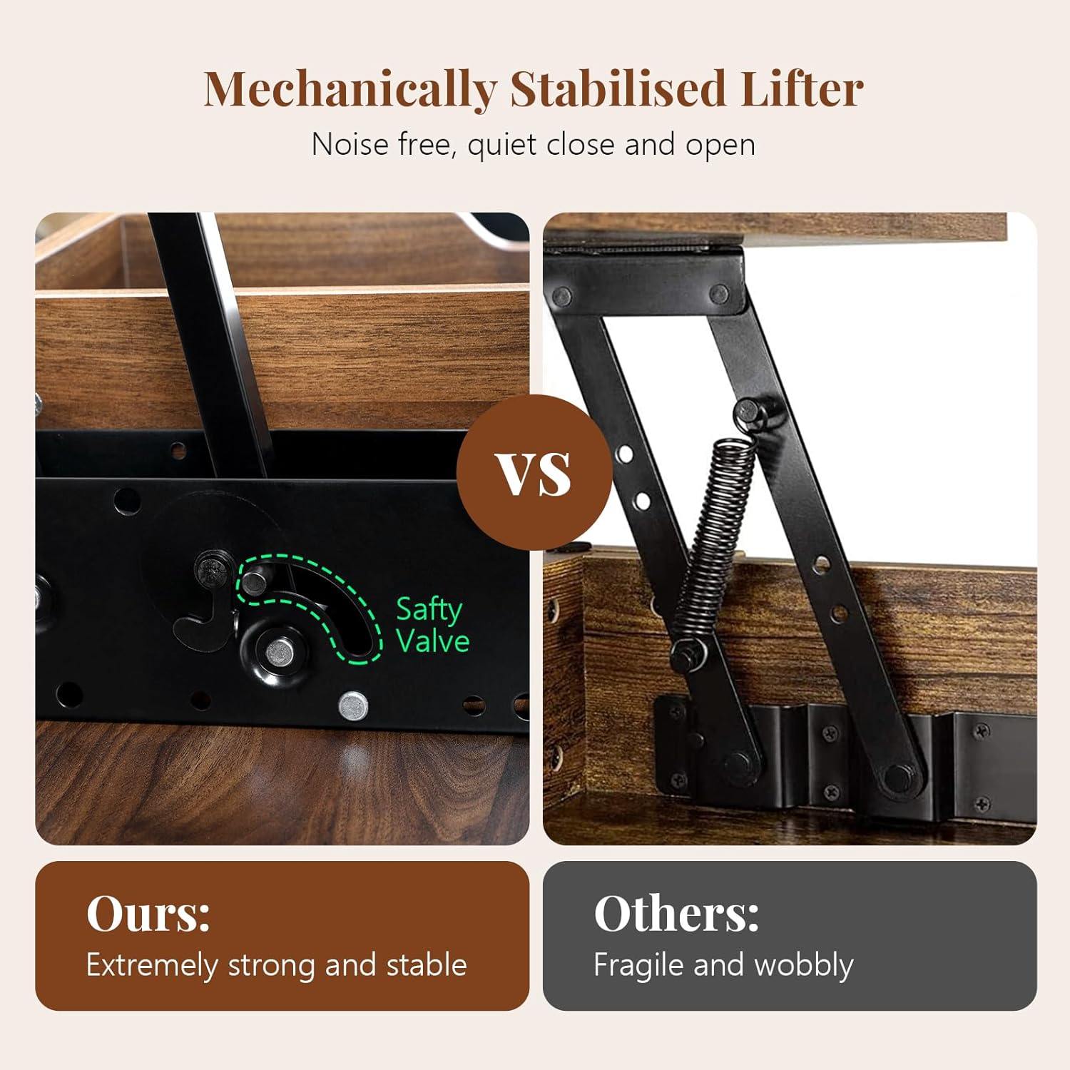 3-in-1 Lift-Up Desktop Design: This unique lift-up desktop coffee table meets multiple needs: when fully extended, it serves as a coffee table for up to 8 people, perfect for dining or games; when partially extended, it can be used as a workbench for two people simultaneously without interference; when the lift-up desktop is closed, it functions as a regular coffee table. Hidden Storage: This coffee table also features hidden storage space for magazines, books, and other items. This unique design keeps your living space tidy and organized. Elegant Design: The stylish and modern design of this coffee table complements any d��cor style, adding a touch of sophistication to your living space. The perfect combination of functionality and aesthetics makes it an ideal choice. Robust and Durable: Made from high-quality, durable materials. The double-layer lift-up desktop features specially reinforced metal lifting arms, providing greater load-bearing capacity than ordinary lift-up desktop coffee tables. Two safety valves ensure the desktop remains stable even under increased pressure. Easy Assembly: This coffee table is easy and convenient to assemble, and comes with detailed instructions. For any questions, please feel free to contact us; we will provide a solution within 24 hours. This lift-up coffee table can accommodate up to 8 people at a time. The tabletop can be easily raised and lowered to form a work surface, and the sturdy metal lifting mechanism ensures smooth and quiet operation. Make full use of the space under the table to keep frequently used items neat and organized. Please open the coffee table tabletop from the recessed area to avoid pinching your hands during use. Once the safety valve is opened, the coffee table tabletop will lock in the raised position to prevent wobbling or sudden descent. The coffee table features a robust metal frame for enhanced durability. This multi-functional adjustable coffee table's tabletop can be raised to a comfortable dining height.