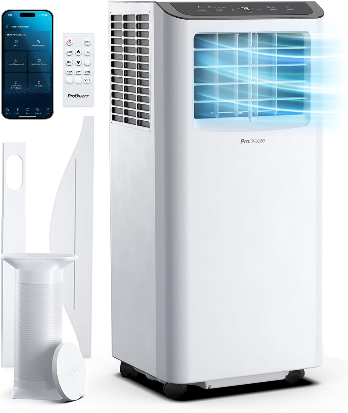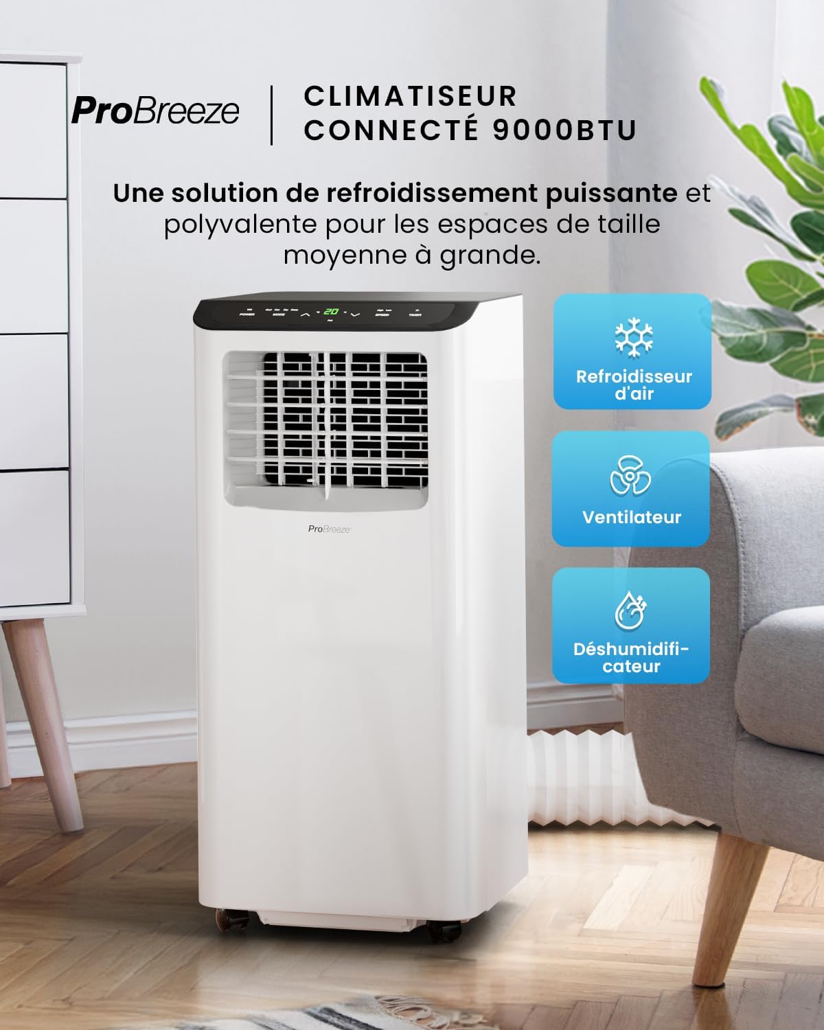 Pro Breeze 4-in-1 Portable Air Conditioner 9000 BTU - Powerful WiFi-compatible air conditioner with app - 24-hour timer, remote control and window kit included for bedroom, living room 22m2 [Energy Class A]