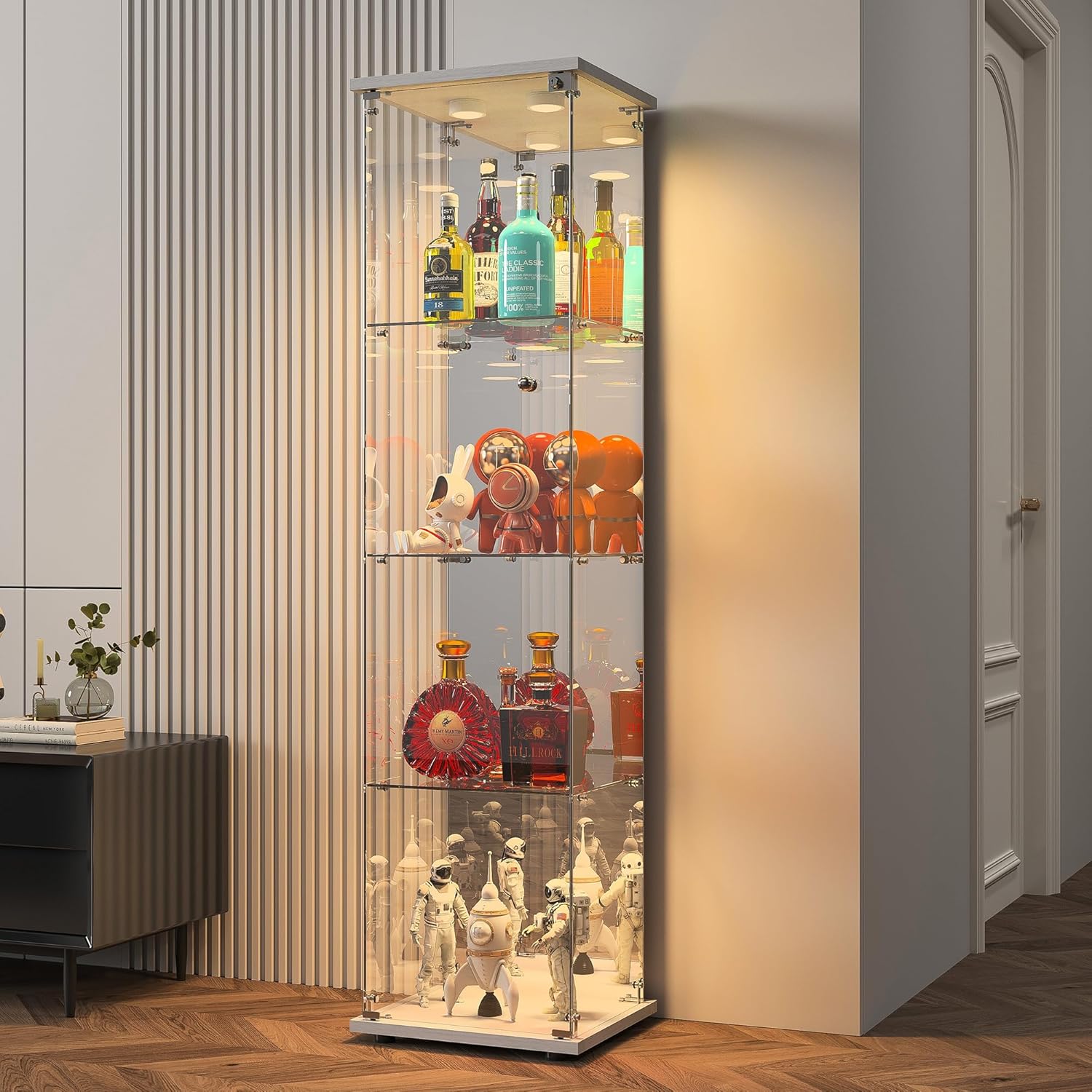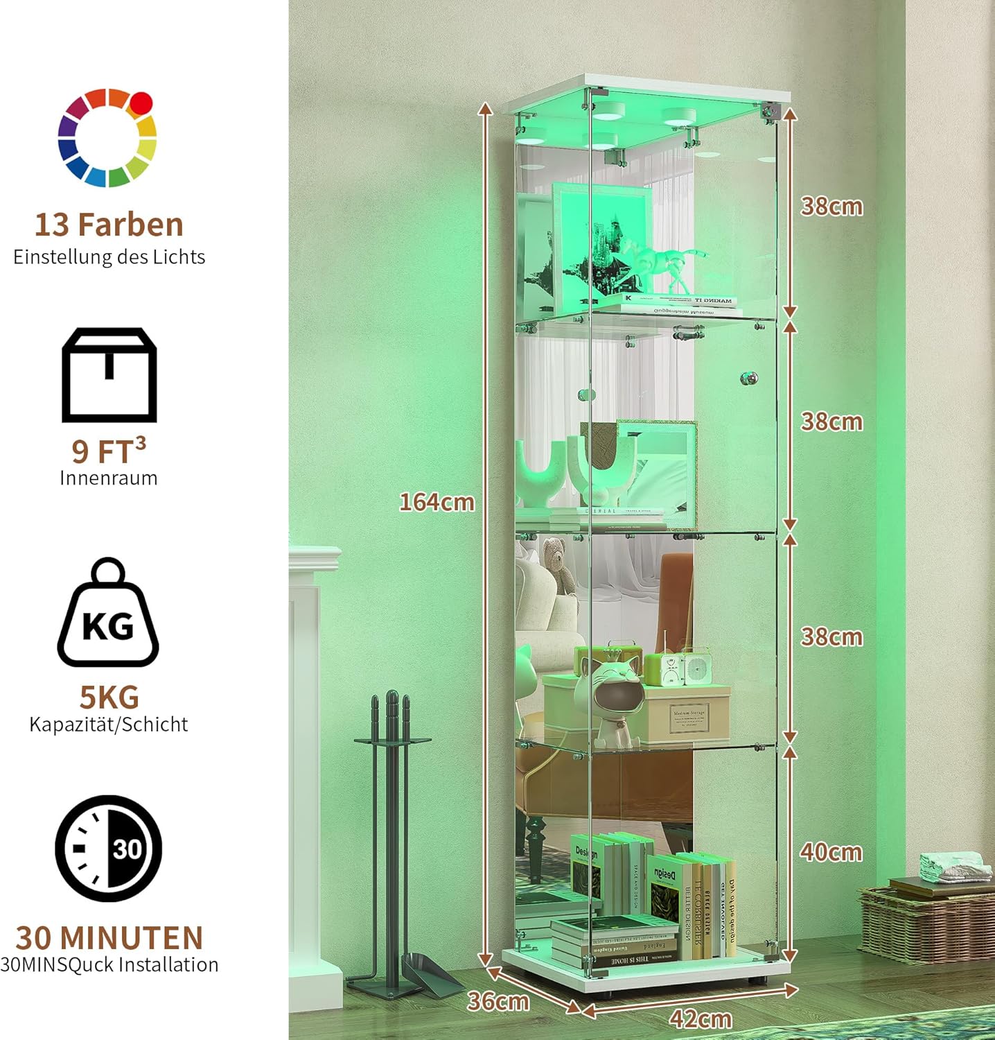 BPKADHY Freestanding 4-Layer Glass Display Cabinet - 1 Door - LED Light and Lock with Mirrored Back Panel - Living Room Cabinet for Collectibles and Books - White