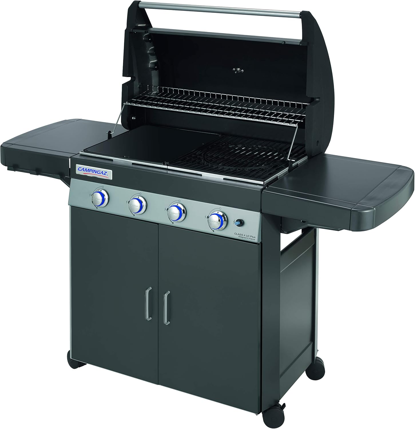 Campingaz Class 4 LD Plus Gas Barbecue with 4 burners, 12.8kW power, InstaClean easy cleaning system, double-enameled cast iron grill and griddle, and 2 side shelves.