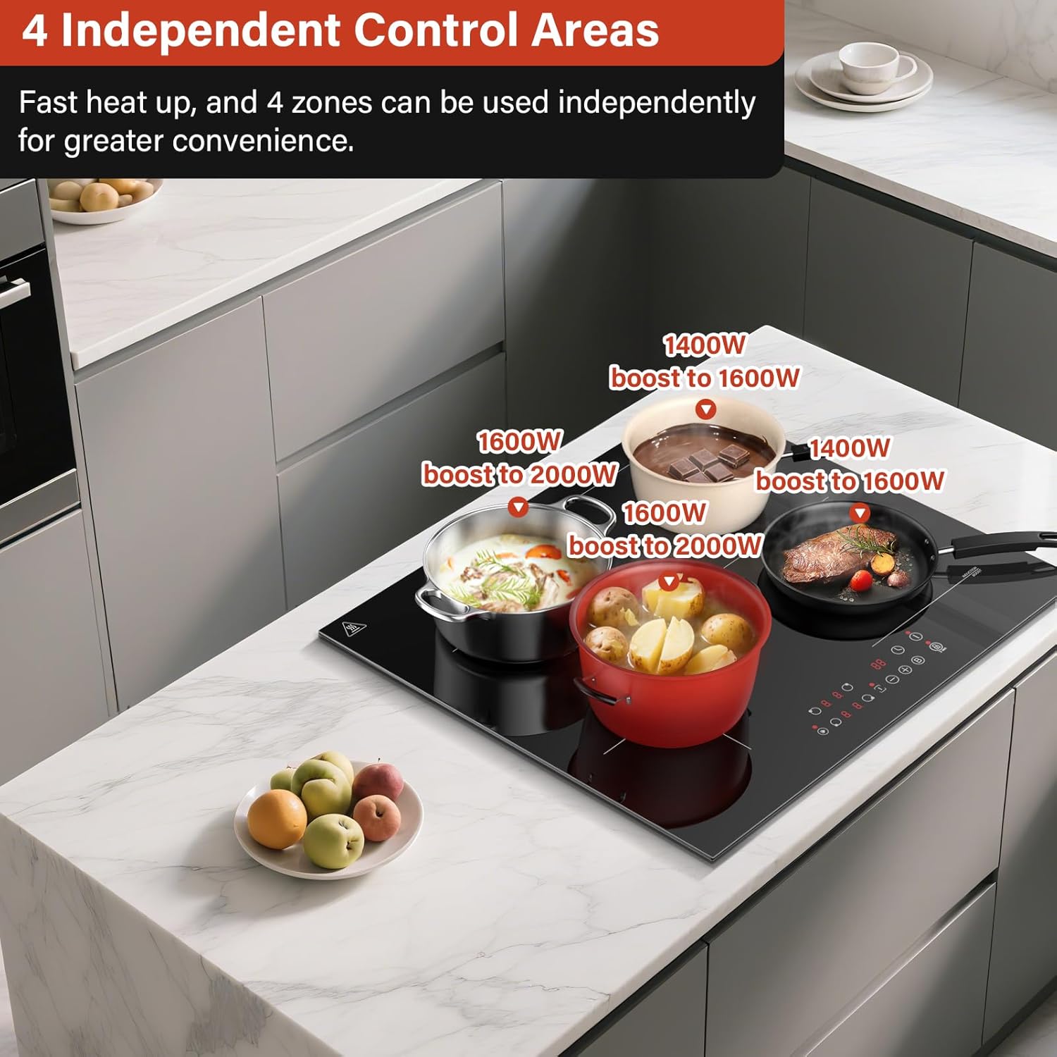 KICHPOWER 4-Burner Induction Hob, 1 Flexible Zone, 60cm Built-in Induction Hob, Electric Cooktop, Boost Function, Touch Controls, 6000W, 9 Power Levels, 1-99 Minute Timer