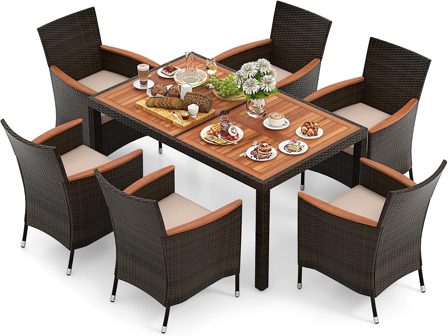 GIANTEX 6-Person Rattan and Acacia Wood Garden Furniture Set, Outdoor Garden Table with 6 Chairs, Cushions, Parasol Hole, Adjustable Legs, for Patio, Picnic, Brown