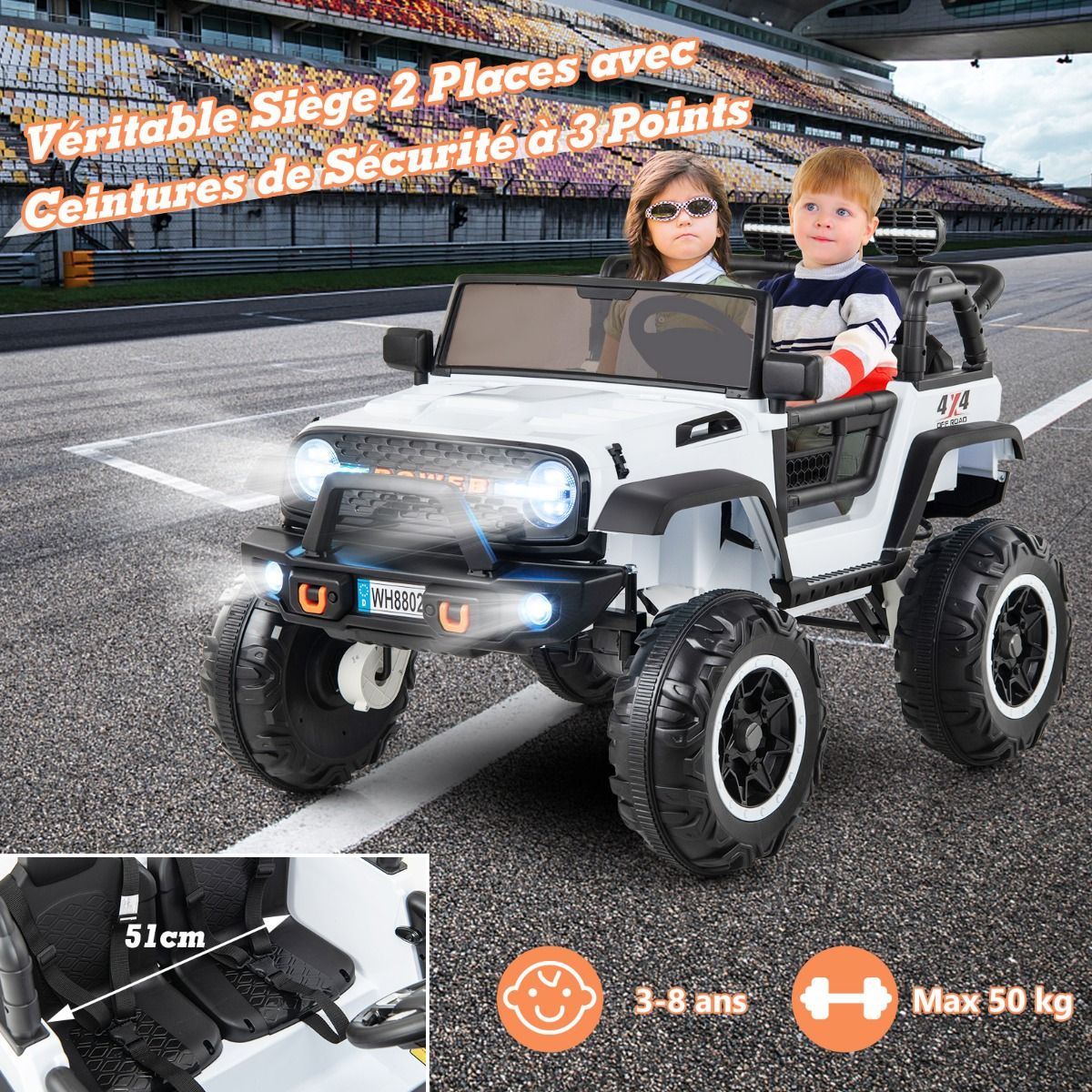 24v Electric Ride-On Car for Children, 2 Seats, Remote Control, Music, Story, Horn, USB, Slow Start Function, Spring Suspension, White/Black/Pink/Purple -