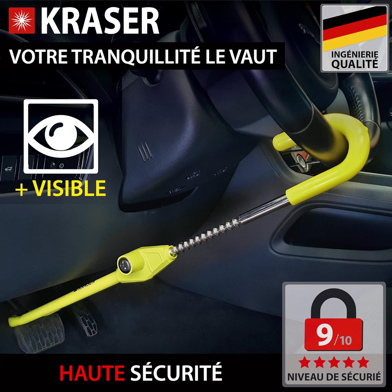 KRASER KR835 Car Steering Wheel and Pedal Lock, High Visibility Yellow Cane, Steel Security Lock, Adjustable and Extendable Hook, Universal Steering Wheel Lock Bar for Cars, Camper Vans