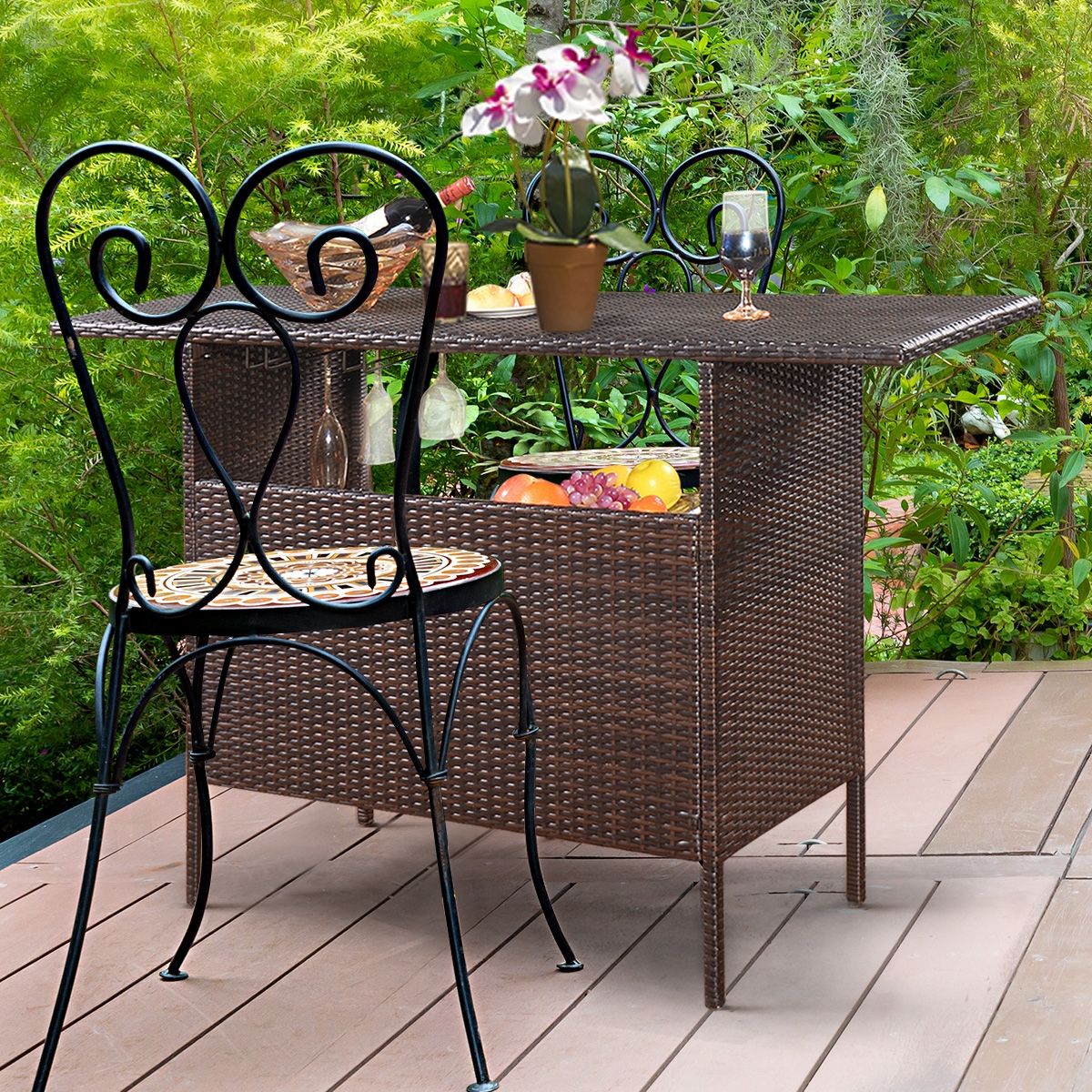 Garden Bar Table in Woven Resin with 2 Storage Shelves and 2 Rails for Glass Holders, Brown -