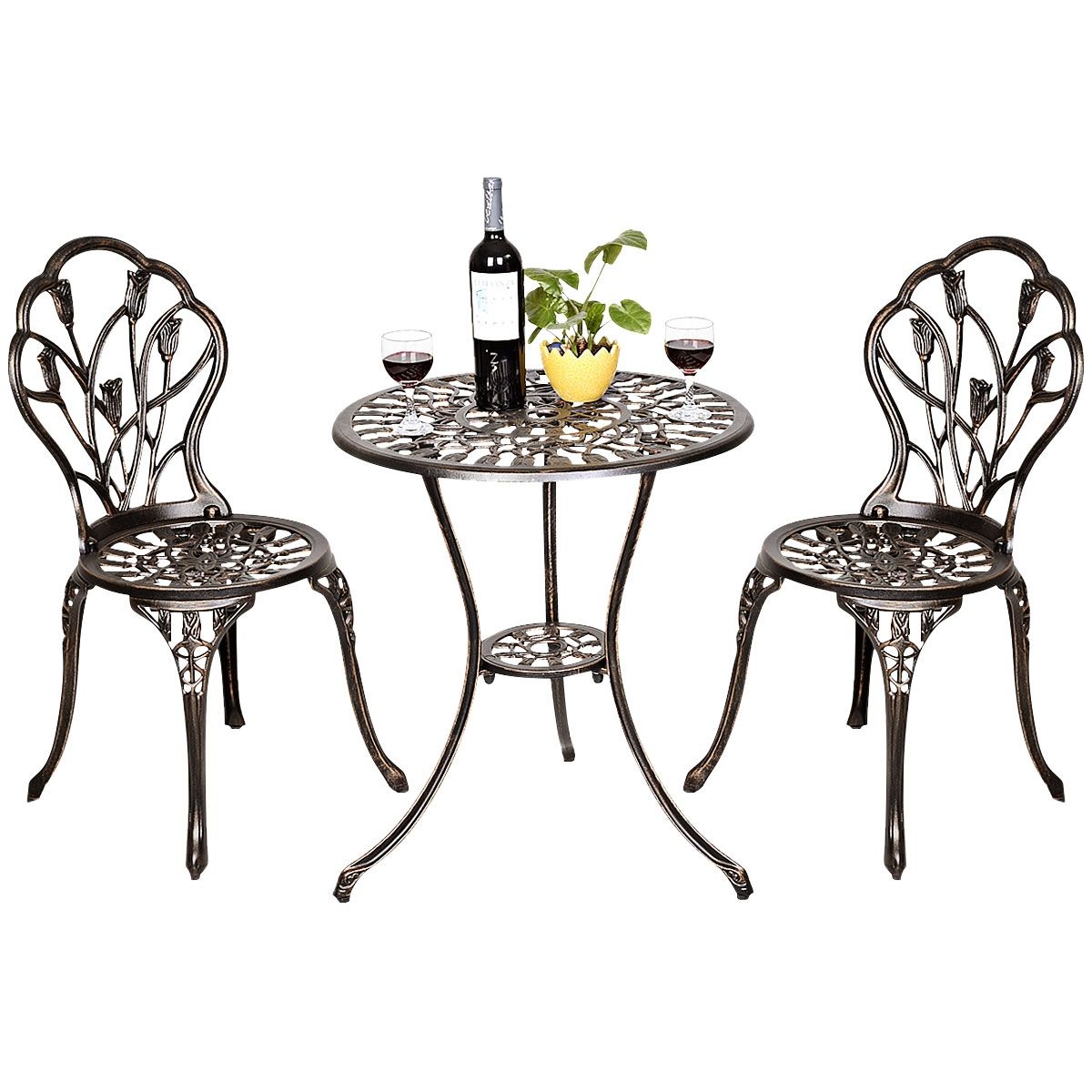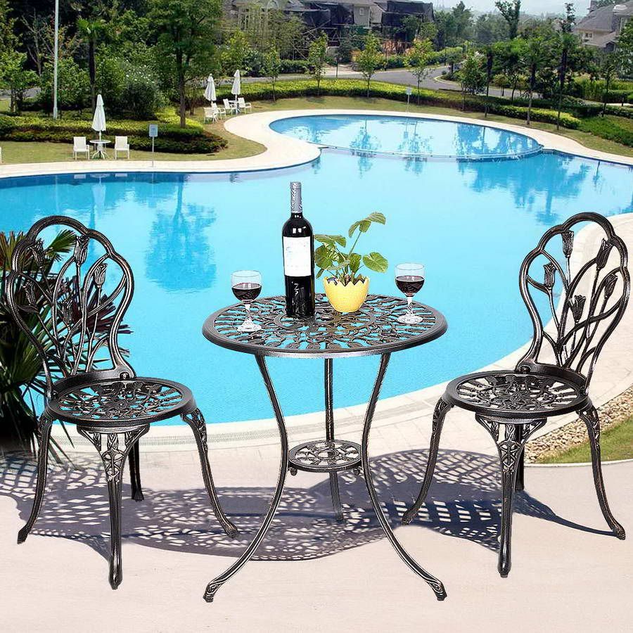 Garden furniture set with 1 round table and 2 cast aluminum chairs, retro style with tulip motif and parasol hole -