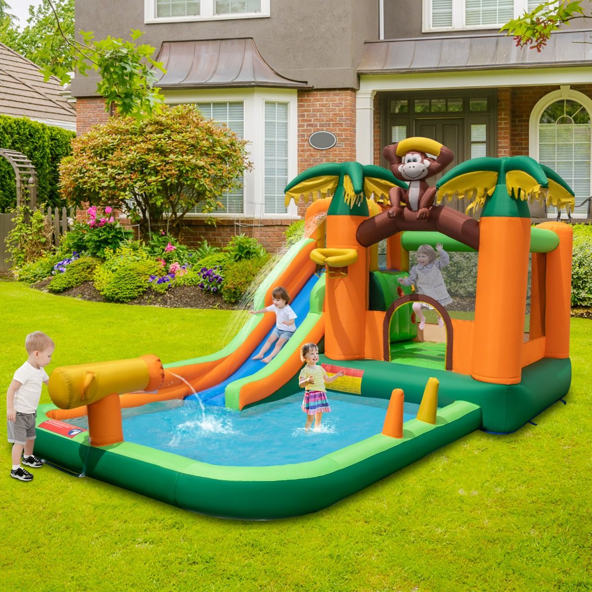 7-in-1 Tropical Inflatable Castle with Monkey & Palm Tree Theme, Water Slide, Pool & 50 Balls, 90kg Load Capacity for 2 Children Aged 3-10 Years -