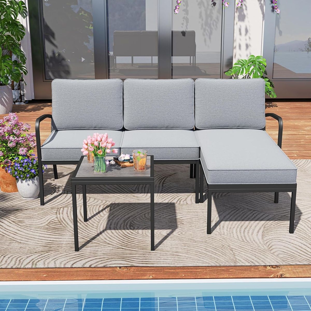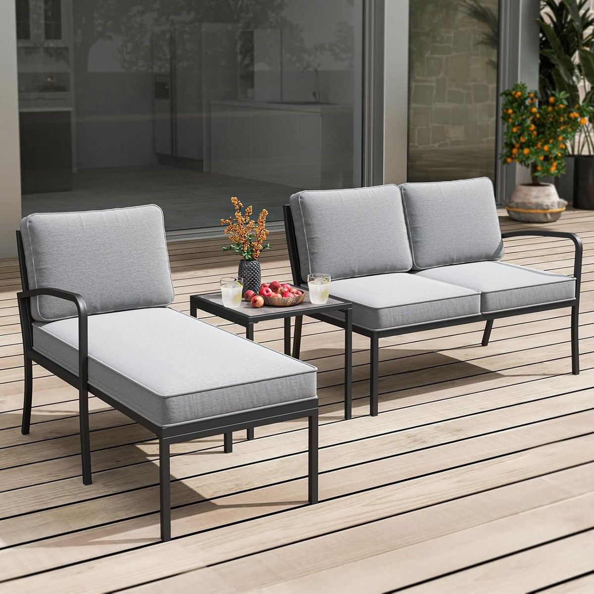 3-Piece Garden Furniture Set, Outdoor Upholstered Sofa Set with Coffee Table, Sturdy Metal Frame, Grey -