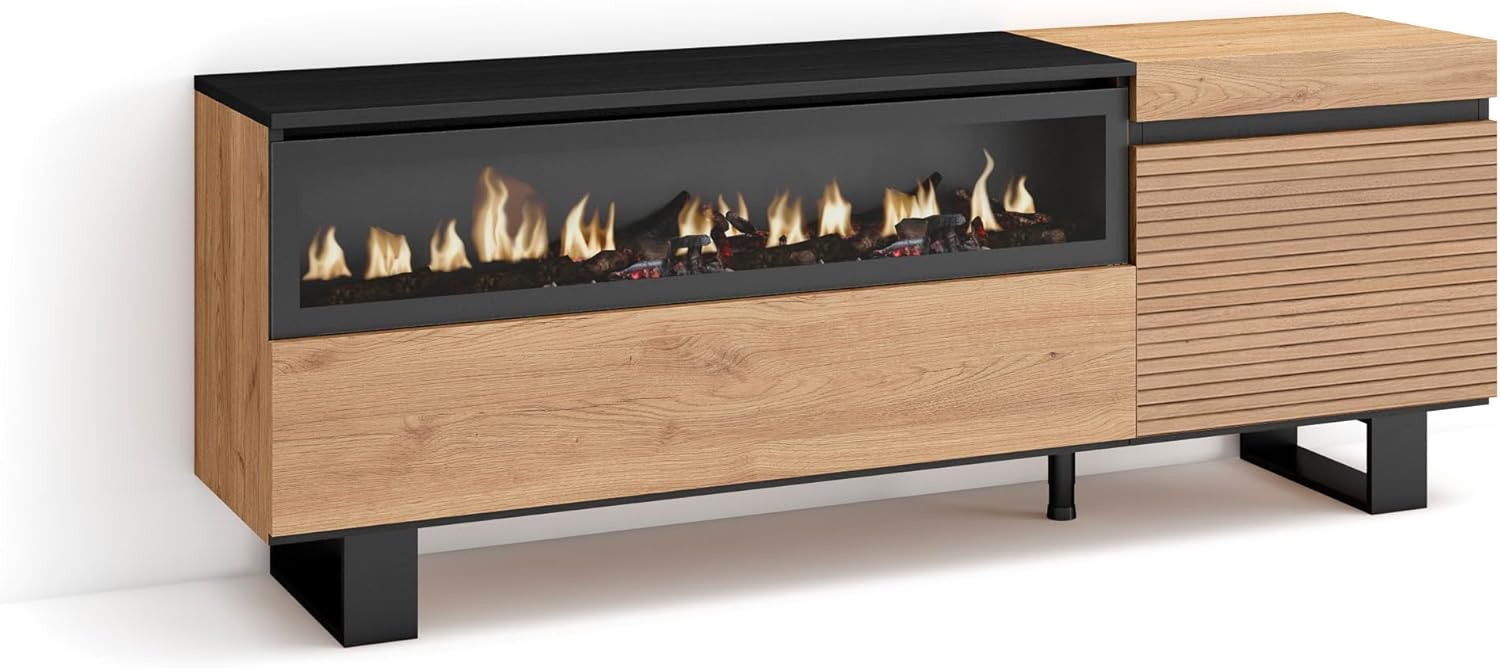 Skraut Home | TV Stand | TV Bench | Large Storage Space | 150x57x35cm | for TVs up to 65" | Electric Fireplace | Industrial Design | Modern Style | Oak
